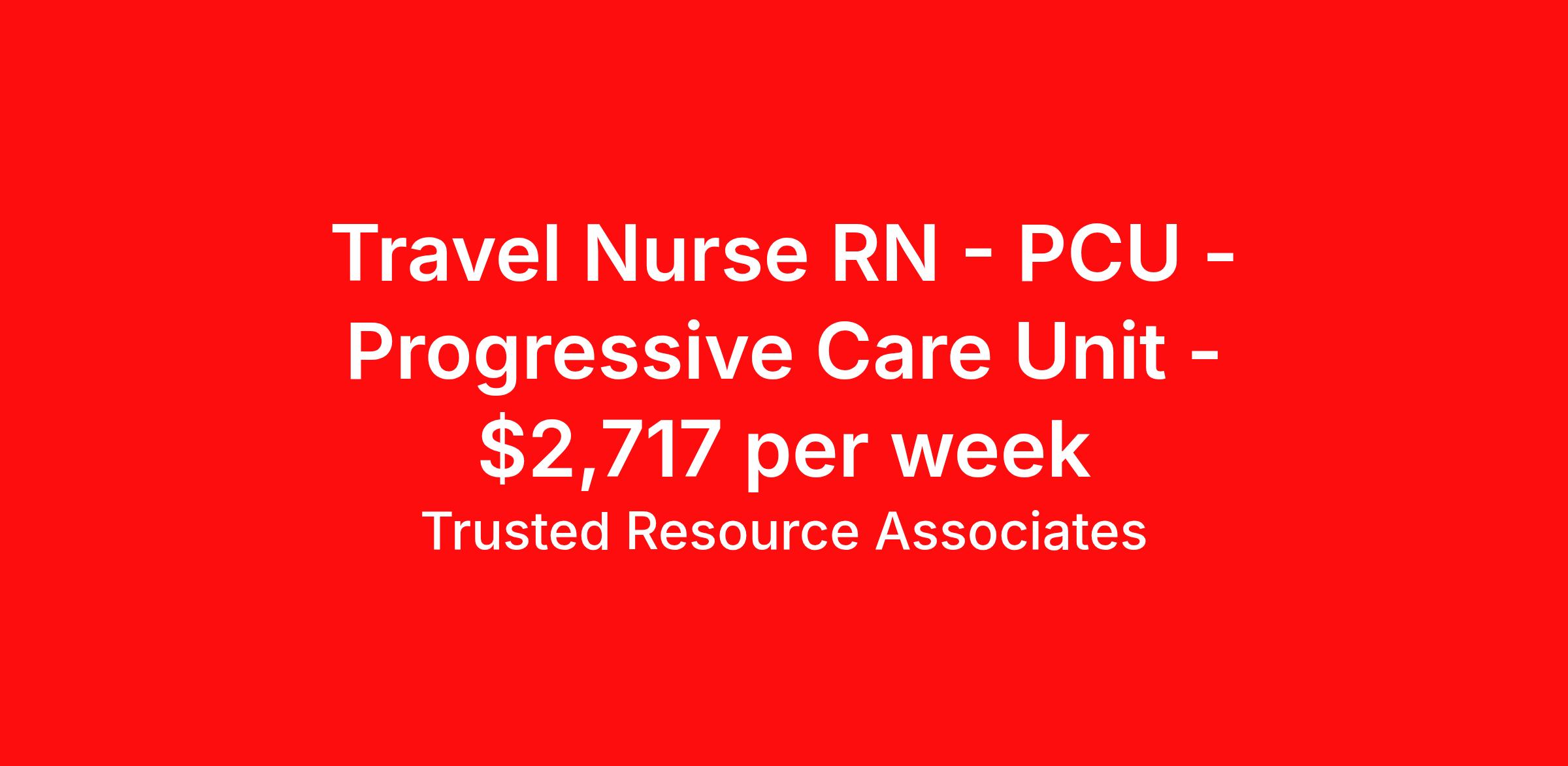 Trusted Resource Associates (TRA) is seeking a travel nurse RN PCU - Progressive Care Unit for a travel nursing job in Palm Springs, California. Job Description & Requirements Specialty: PCU - Progressive Care Unit Discipline: RN Start Date: 04/01/2026 Duration: 13 weeks 36 hours per week Shift: 12 hours, days Employment Type: Travel TRA RN PCU / IMCU TRA is Tenet's in-house nationwide contingent pool for Nursing and Allied travel and local contracts. Receive a greater level of Contract security compared to with an outside agency. BENEFITS - Guaranteed hours for Travel Contracts - Preferred Booking Agreement for Local Contracts - Weekly Pay - Holiday Pay - Contract Security compared to a contract with an outside agency Minimum education Graduate of an accredited School of nursing Minimum Experience Must have 2 years of Acute Care nursing experience with a minimum one year current in PCU / IMCU Required Certification/Licensure - Must be currently licensed, certified or registered to practice profession as required by law, regulation in state of practice or policy. Must meet all certification requirements for each nursing specialty supported - American Heart Association - CPR-Basic Life Support - Other credentialing items, such as a skills checklist and health related documents, which will be specified by your Recruiter. Our Hire Process - We do qualify our clinicians to meet or exceed the minimum requirements of a travel or local assignment. If you are qualified, we may direct-hire you, reducing the time we can get you to work! When you reach out to a TRA Recruiter for more details, ensure your Vivian profile includes your most updated resume! Trusted Resource Associates (TRA) Job ID 500251. Pay package is based on 12 hour shifts and 36 hours per week (subject to confirmation) with tax-free stipend amount to be determined. Benefits 401k retirement plan Weekly pay Holiday Pay Referral bonus