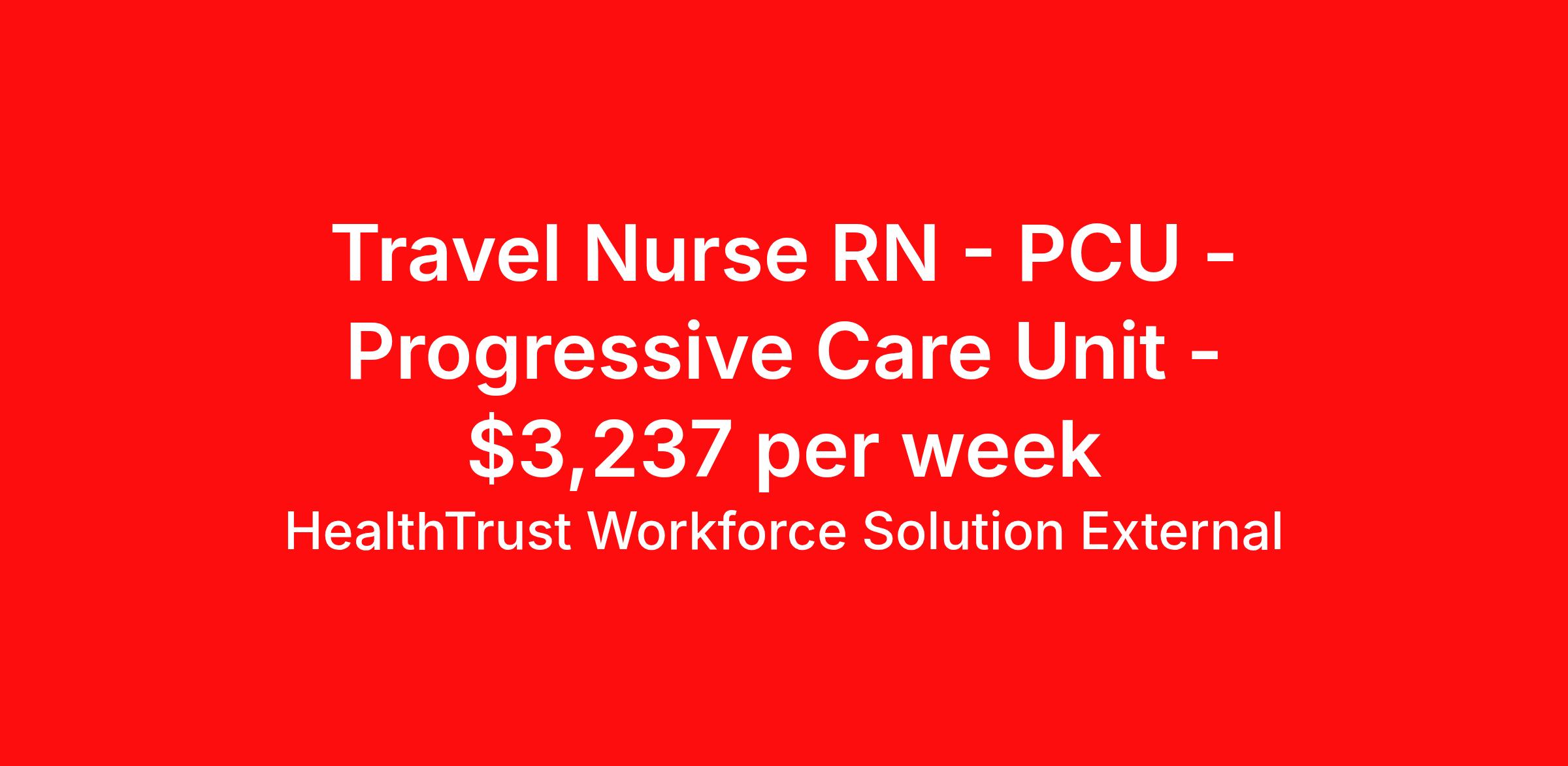 HealthTrust Workforce Solution External is seeking a travel nurse RN PCU - Progressive Care Unit for a travel nursing job in Saint Louis, Missouri. Job Description & Requirements Specialty: PCU - Progressive Care Unit Discipline: RN Duration: 13 weeks 48 hours per week Shift: 12 hours, nights Employment Type: Travel • Required Certifications: BLS, ACLS (AHA) • Years of Experience: 1 years of current PCU experience required