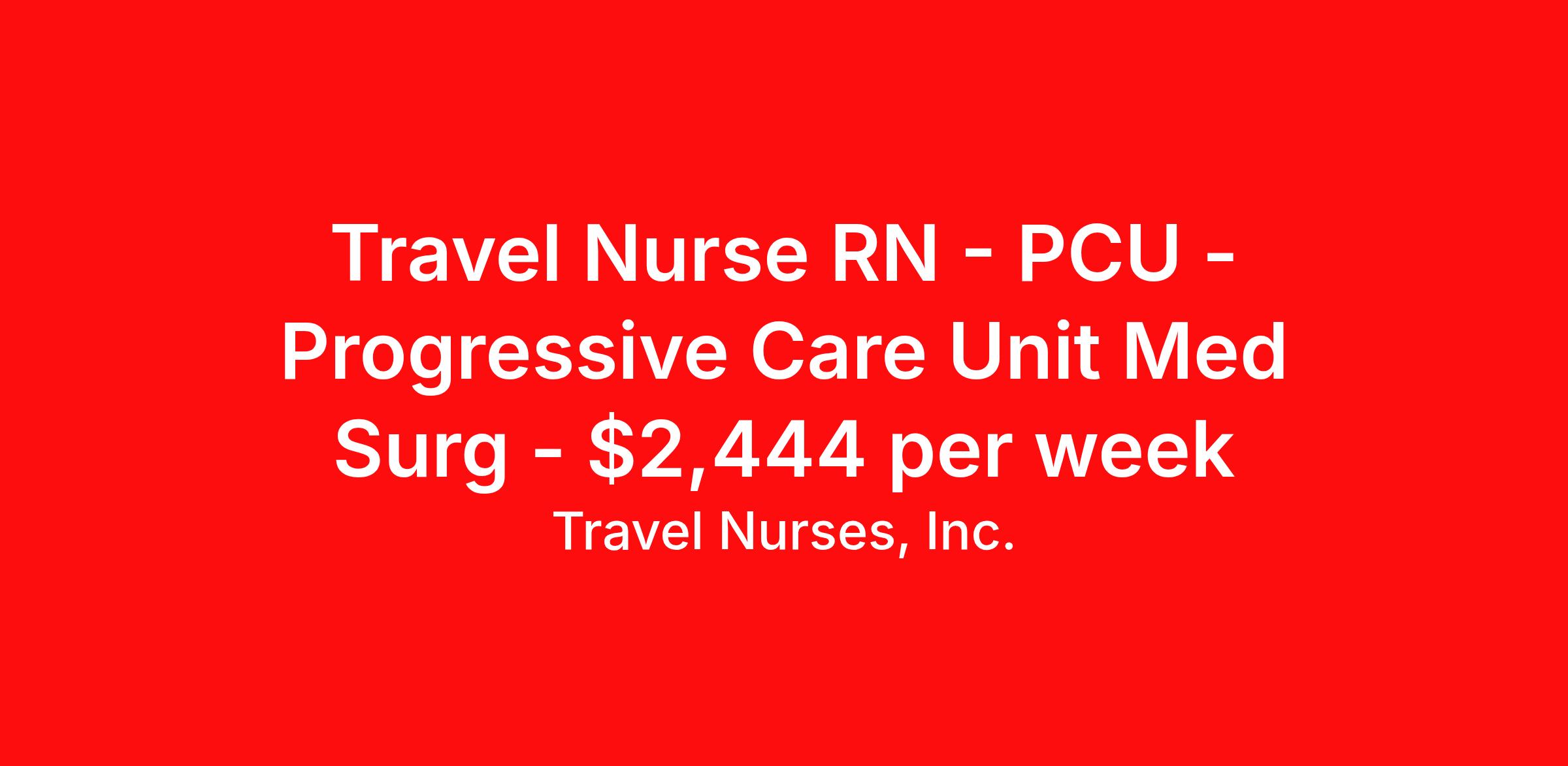 Travel Nurses, Inc. is seeking a travel nurse RN PCU - Progressive Care Unit Med Surg for a travel nursing job in Rock Island, Illinois. Job Description & Requirements Specialty: PCU - Progressive Care Unit Discipline: RN Start Date: 04/06/2026 Duration: 13 weeks 40 hours per week Shift: 8 hours Employment Type: Travel Travel Nurses, Inc. Job ID 309460. Pay package is based on 8 hour shifts and 40 hours per week (subject to confirmation) with tax-free stipend amount to be determined. Posted job title: Temp - Registered Nurse (RN) - Med Surg / Progressive Care Unit (PCU) (Days) Rock Island, IL About Travel Nurses, Inc. Travel Nurses, Inc. is a leading healthcare staffing agency that provides healthcare professionals with opportunities to work across the country. Founded by nurses in 1988, TNI has more than 30 years of experience in the industry. The agency initially focused on staffing operating room settings in the MidSouth. However, this quickly evolved to encompass all nursing specialties and allied health fields nationwide. At the heart of our mission is a profound respect for nurses, whom we consider the cornerstone of healthcare. This acknowledgment extends beyond the nursing profession alone. Travel Nurses, Inc. now proudly embraces a wide array of healthcare professionals, recognizing their crucial roles in our collective mission. Travel Nurses, Inc. is dedicated to providing comprehensive support and opportunities that will help facilitate complete career mobility in the healthcare field. Our commitment to transparency ensures that all professionals, not just nurses, can confidently accept any assignment without financial uncertainties. We prioritize our professionals’ well-being with comprehensive benefits packages, including day-one healthcare coverage, competitive salaries, bonuses and incentives. This underscores our unwavering commitment to offering the best possible rewards and support for all the professionals we serve. Benefits Weekly pay Continuing Education 401k retirement plan Wellness and fitness programs Mileage reimbursement Referral bonus Employee assistance programs Medical benefits Dental benefits Vision benefits Benefits start day 1 License and certification reimbursement Life insurance Retention bonus