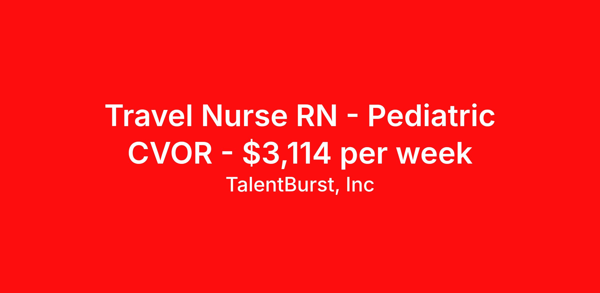 TalentBurst, Inc is seeking a travel nurse RN Pediatric CVOR for a travel nursing job in Atlanta, Georgia. Job Description & Requirements Specialty: Pediatric CVOR Discipline: RN Start Date: 03/30/2026 Duration: 14 weeks 40 hours per week Shift: 10 hours, days Employment Type: Travel Job Title: Registered Nurse - Cardiovascular Operating Room Duration: 14 weeks Location: 2220 N. Druid Hills Road Atlanta GA 30329 Schedule: M-F, 4 x10 hour shifts, one day off a week. Shift times are 0645-1700. Call required. Needs to have Cardiac OR experience Active GA license or compact BLS, PALS required Peds experience a plus! *NICOTINE FREE FACILITY* must be tested with drug screen. RTO must be on submission coversheet. CHOA requires the flu vaccination. They WILL NOT accept ANY exemptions (this includes medical/religious). Please do not submit if your candidate cannot receive a flu vaccine. TB_HC ZRHC 26-05740 (M) About TalentBurst, Inc TalentBurst Health & Life Sciences is an established provider of healthcare workforce solutions, servicing healthcare facilities across the United States for over 15 years. As a Joint Commission Certified Agency, our commitment to quality, integrity, and exceptional service has made us a trusted name in the healthcare staffing landscape. Our mission is to bridge the gap between healthcare professionals seeking fulfilling opportunities and healthcare organizations striving to maintain their high standards of care. We are committed to providing top-notch healthcare professionals with access to facilities where they can focus on delivering exceptional patient care and thrive. Whether you're a nurse, allied health professional, or administrative personnel, we have the expertise to match your skills and aspirations with the perfect placement.