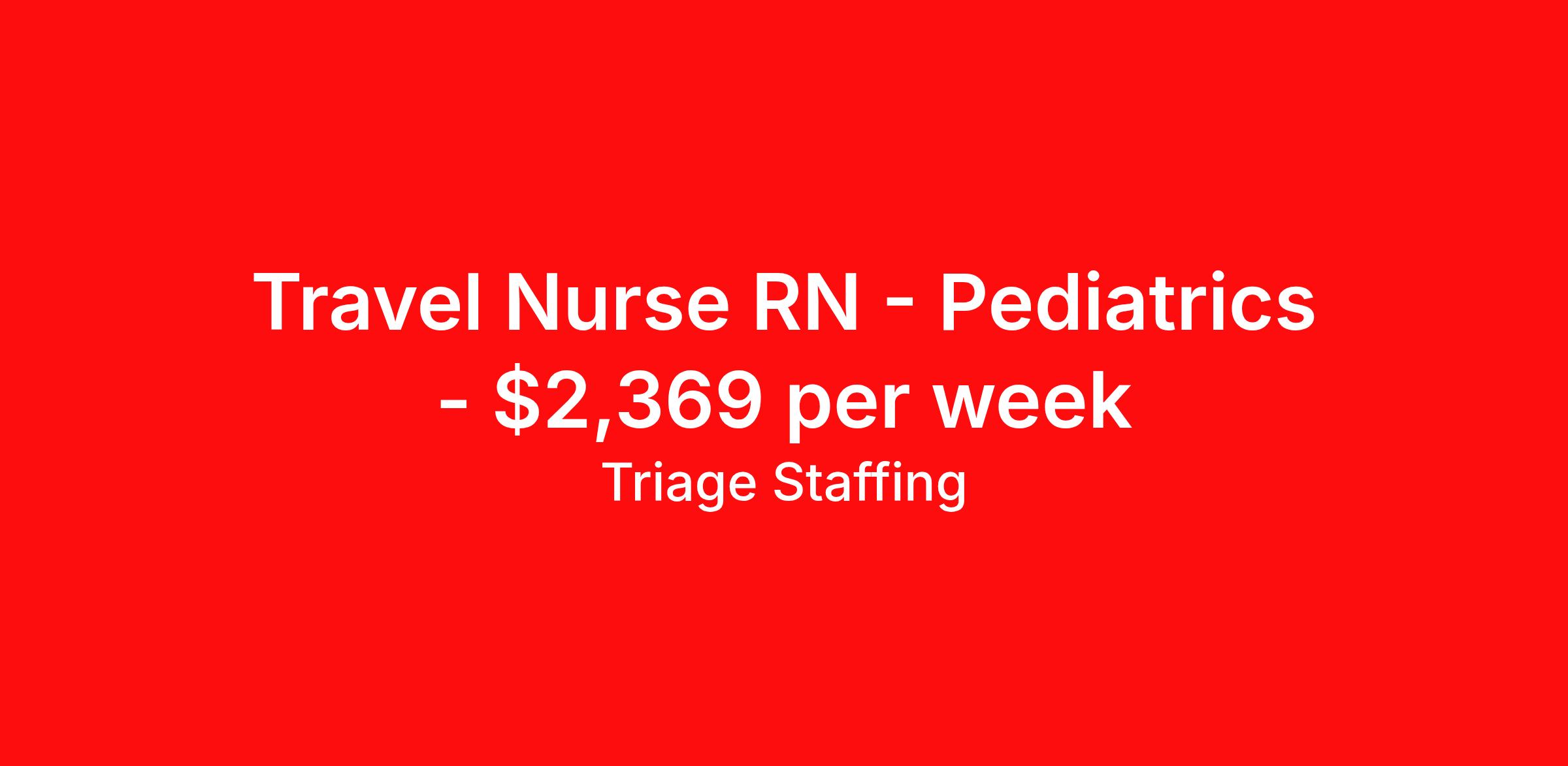 Triage Staffing is seeking a travel nurse RN Pediatrics for a travel nursing job in Springfield, Massachusetts. Job Description & Requirements Specialty: Pediatrics Discipline: RN Start Date: 04/13/2026 Duration: 13 weeks 40 hours per week Shift: 8 hours, days Employment Type: Travel Travel Nursing: Pediatrics Springfield, MA Location: Springfield, MA Start Date: 4/13/2026 Shift Details: 8H Days 40 hours per week Length: 13 WEEKS Apply for specific facility details.PEDS RN Triage Staffing Job ID LNKQUDLJ. Posted job title: Nursing: Pediatrics About Triage Staffing At Triage, we prefer to be real . Real about expectations—both ours and yours. Real about how a decision you make today could affect your tomorrows. Real about how compensation actually works. Real about how great—or grating—your next supervisor may be. Being real allows everyone at Triage to be ready . Ready to serve you with real honesty. So if that gig near the ocean is really no day at the beach, or that third shift comes with a second-class rate, we tell you. So you can be ready, too. We staff all five major divisions of acute care—nursing, lab, radiology, cardiopulmonary and rehab therapy, offering: - Competitive, custom pay packages - One point of contact for both travelers and facilities (per division) - A reliable recruiter who's got your back throughout your entire assignment - In-house compliance and accounting specialists - A clinical liaison team available 24/7 to offer medical and professional support and career development - A mentoring program that is run and managed by actual clinicians—yeah, you read that right - And more (because of course there’s more) Are we the biggest? No. Are we the best? That’s rather subjective, but we’re trying to be. Will we work like hell to get you as close to your idea of heaven as possible? Yes. Yes, we will. Benefits: Day One comprehensive, nationwide insurance plans for health, vision and dental and life—including a HSA option Day One 401(k) program with employer-matching contributions once eligible Facility cancelling protection—your time is money on and off-the-clock Guaranteed hours Weekly paychecks via direct deposit Earned vacation bonuses for time worked Paid holidays Employee assistance program (EAP)—your mental health is important, too Continuing education, certification and licensing reimbursement Workers comp—because accidents happen Top-rated professional liability insurance Company provided housing options Referral bonus—$750 in your pocket after they’ve completed a 13-week assignment
