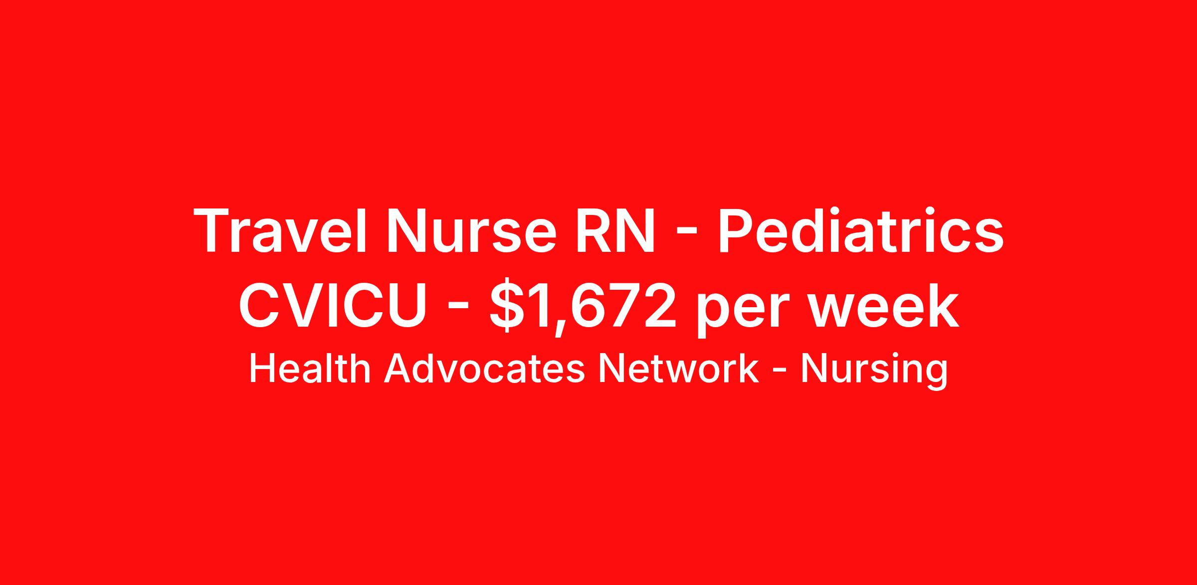 Health Advocates Network - Nursing is seeking a travel nurse RN Pediatrics CVICU for a travel nursing job in Houston, Texas. Job Description & Requirements Specialty: Pediatrics CVICU Discipline: RN Start Date: ASAP Duration: 13 weeks 36 hours per week Shift: 12 hours, nights Employment Type: Travel HANStaff Job ID 512857. Pay package is based on 12 hour shifts and 36 hours per week (subject to confirmation) with tax-free stipend amount to be determined. Posted job title: RN - Pediatric CVICU About Health Advocates Network - Nursing Health Advocates Network was founded on the basis of a shared aspiration, to improve the way healthcare staffing is done. We are a company established and led by nurses. Our flexible approach enables us to develop solutions customized to your specific needs. From short- and long-term travel contracts to local and per diem assignments and more, we are here to get you to your next adventure! By solving challenges, providing the best placements, and advocating for you, we stand to help you thrive and pave the path forward in your career. Click on the videos below to learn more about our values!