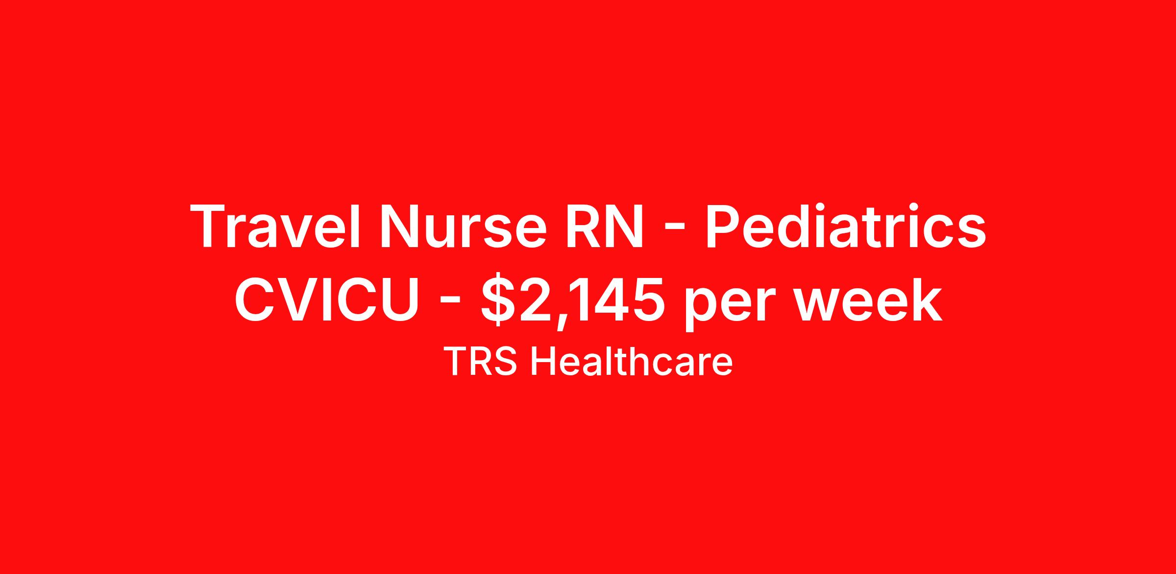 TRS Healthcare is seeking a travel nurse RN Pediatrics CVICU for a travel nursing job in Charleston, South Carolina. Job Description & Requirements Specialty: Pediatrics CVICU Discipline: RN Start Date: 04/13/2026 Duration: 13 weeks 36 hours per week Shift: 12 hours, nights Employment Type: Travel TRS Healthcare Job ID 1442369. Pay package is based on 12 hour shifts and 36 hours per week (subject to confirmation) with tax-free stipend amount to be determined. Posted job title: Pediatric CVICU Registered Nurse About TRS Healthcare TRS Healthcare has been a leader in the healthcare staffing industry for over 25 years, providing exceptional career opportunities for travel nurses and allied health professionals. An RN-founded, woman-owned company, TRS Healthcare has team members in all 50 states. We recruit and support registered nurses, licensed practical nurses, surgical technicians, respiratory therapists, imaging technologists, laboratory specialists, and other experienced nursing and allied healthcare professionals. We staff hundreds of healthcare facilities across the U.S. in urban, rural, and underserved areas, including multi-state hospital systems, critical access hospitals, rural community hospitals, long-term care facilities, trauma centers, standalone clinics, and more. Learn more about TRS Healthcare at trshealthcare.com .