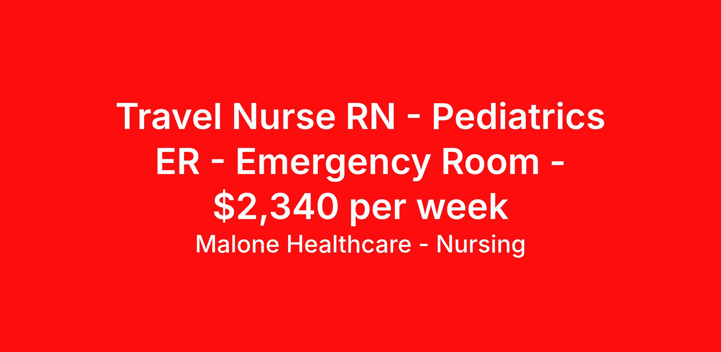 Malone Healthcare - Nursing is seeking a travel nurse RN Pediatrics ER - Emergency Room for a travel nursing job in Wauwatosa, Wisconsin. Job Description & Requirements Specialty: Pediatrics ER - Emergency Room Discipline: RN Start Date: 04/13/2026 Duration: 13 weeks 36 hours per week Shift: 12 hours, evenings Employment Type: Travel About Malone Healthcare - Nursing With a commitment to providing a higher standard of service and experience in patient care, Malone Healthcare places expert nurses and allied health professionals in rewarding careers throughout the United States. As a leading healthcare staffing agency, Malone’s focus on compliance and integrity translates to a seamless experience for our team members and partner facilities. When you work with Malone Healthcare, you can rely on over 50 years of proven experience placing exceptional professionals in quality healthcare settings. Benefits Weekly pay Holiday Pay Guaranteed Hours Continuing Education 401k retirement plan Pet insurance Referral bonus Medical benefits Dental benefits Vision benefits License and certification reimbursement Life insurance