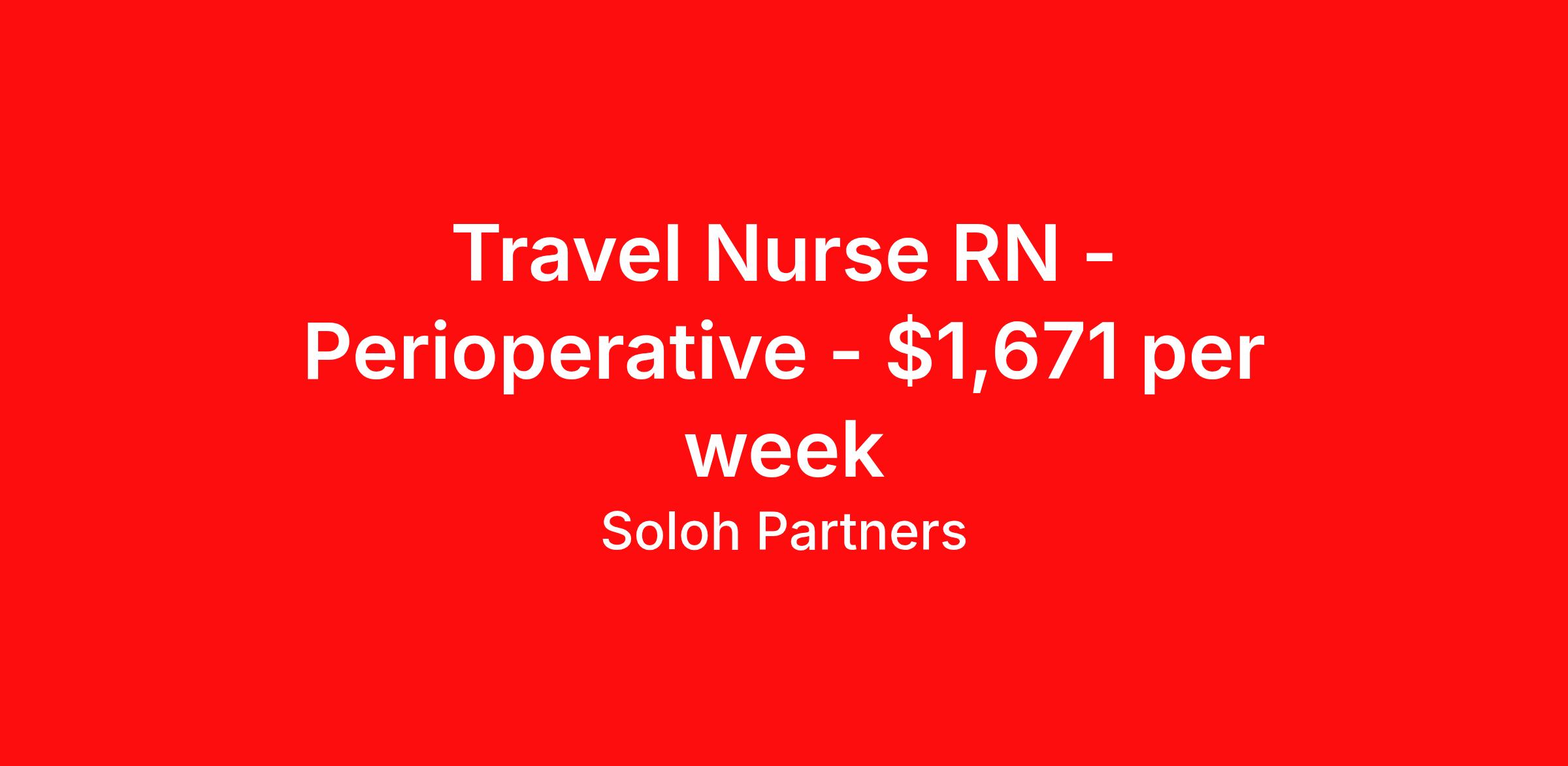 Soloh Partners is seeking a travel nurse RN Perioperative for a travel nursing job in Atlanta, Georgia. Job Description & Requirements Specialty: Perioperative Discipline: RN Start Date: 04/13/2026 Duration: 12 weeks 40 hours per week Shift: 8 hours, days Employment Type: Travel Job Title: Registered Nurse - Peri Operative No local candidates within 50 miles Schedule M-F 8am-530pm. No weekends or holidays. 13 weeks 876A Tower Op Surg - RN Peri Op Min of 2 years of experience within specialty. Required BLS Soloh Partners Job ID T31987993. Pay package is based on 8 hour shifts and 40 hours per week (subject to confirmation) with tax-free stipend amount to be determined. Posted job title: Registered Nurse - Peri Operative About Soloh Partners WHO WE ARE How you project yourself in the world says a lot about you. So, what do we think is important for you to know about us? Soloh Partners is proud to be a certified women-owned business. We are committed to diversity, equity and inclusion. We are driven by our passion for service: service to our clients & their mission and service to our candidates and employees. We believe in making things personal. It isn’t just business for us. This is about shaping careers and building an engaged workforce. To be successful at either you, need to be invested in both. OUR MISSION Our mission is to be recognized by our clients as an indispensable partner in their pursuit of high-impact Talent. We succeed by creating and maintaining intensely caring and mutually rewarding relationships with our internal employees, candidates and contingent workforce. We aren’t just a staffing agency; we fancy ourselves creatives. We create opportunity. We create excitement. We create and foster relationships built on trust, and partnerships based on mutual respect and understanding. Benefits Medical benefits Dental benefits Vision benefits 401k retirement plan Weekly pay Sick pay Referral bonus Wellness and fitness programs