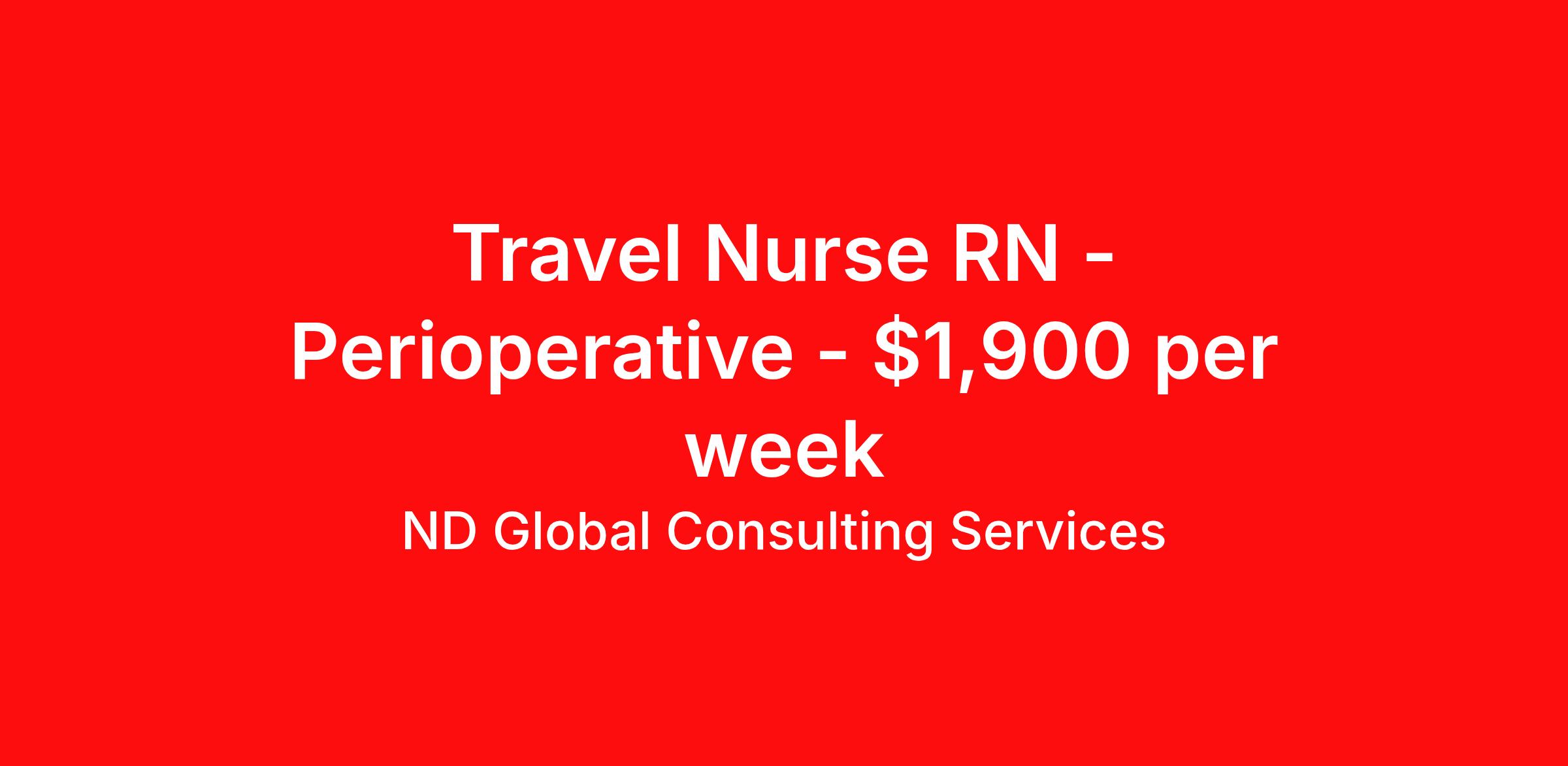 ND Global Consulting Services is seeking a travel nurse RN Perioperative for a travel nursing job in Atlanta, Georgia. Job Description & Requirements Specialty: Perioperative Discipline: RN Start Date: 04/06/2026 Duration: 12 weeks 40 hours per week Shift: 8 hours, days Employment Type: Travel We are seeking a dedicated Registered Nurse (RN) specializing in Perioperative care for an exciting travel assignment in Atlanta, Georgia. This position offers a full-time schedule of 8-hour day shifts, 5 days per week, ensuring a consistent 40 guaranteed hours weekly.Start your journey on April 6, 2026, and provide exceptional patient care in a dynamic surgical environment. As a Perioperative RN, you will play a critical role in preoperative, intraoperative, and postoperative patient care, ensuring safety and efficiency throughout surgical procedures.Key Highlights:- Location: Atlanta, Georgia- Shift Type: 8-hour days- Weekly Hours: 40 guaranteed- Start Date: April 6, 2026Join a supportive team and contribute to outstanding surgical outcomes, leveraging your skills and expertise to make a meaningful impact.