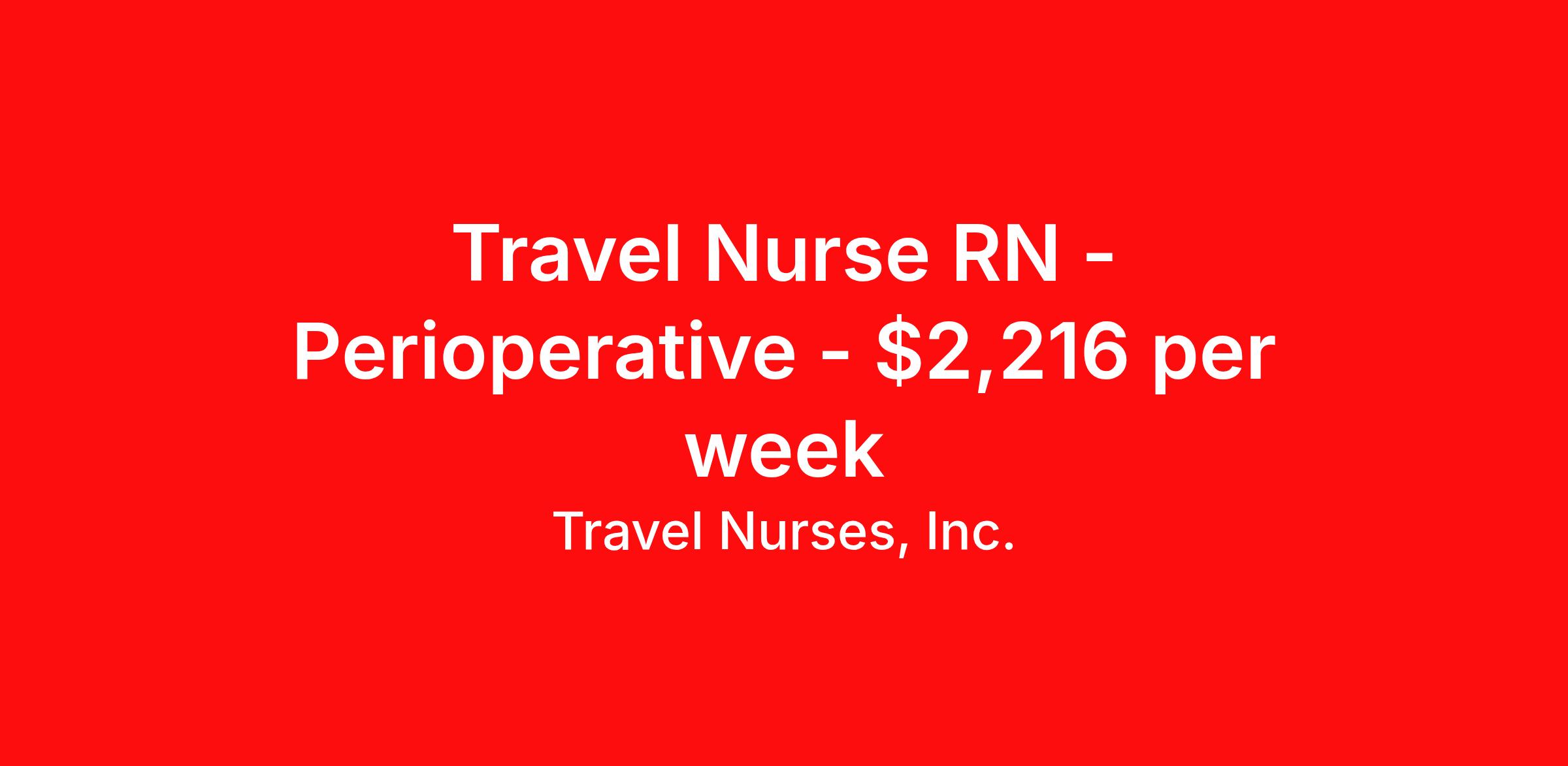 Travel Nurses, Inc. is seeking a travel nurse RN Perioperative for a travel nursing job in Oklahoma City, Oklahoma. Job Description & Requirements Specialty: Perioperative Discipline: RN Start Date: 04/13/2026 Duration: 13 weeks 36 hours per week Shift: 12 hours Employment Type: Travel Travel Nurses, Inc. Job ID 309289. Pay package is based on 12 hour shifts and 36 hours per week (subject to confirmation) with tax-free stipend amount to be determined. Posted job title: RN Perioperative Circulator Adult Surgery OUMC FS. About Travel Nurses, Inc. Travel Nurses, Inc. is a leading healthcare staffing agency that provides healthcare professionals with opportunities to work across the country. Founded by nurses in 1988, TNI has more than 30 years of experience in the industry. The agency initially focused on staffing operating room settings in the MidSouth. However, this quickly evolved to encompass all nursing specialties and allied health fields nationwide. At the heart of our mission is a profound respect for nurses, whom we consider the cornerstone of healthcare. This acknowledgment extends beyond the nursing profession alone. Travel Nurses, Inc. now proudly embraces a wide array of healthcare professionals, recognizing their crucial roles in our collective mission. Travel Nurses, Inc. is dedicated to providing comprehensive support and opportunities that will help facilitate complete career mobility in the healthcare field. Our commitment to transparency ensures that all professionals, not just nurses, can confidently accept any assignment without financial uncertainties. We prioritize our professionals’ well-being with comprehensive benefits packages, including day-one healthcare coverage, competitive salaries, bonuses and incentives. This underscores our unwavering commitment to offering the best possible rewards and support for all the professionals we serve. Benefits Weekly pay Continuing Education 401k retirement plan Wellness and fitness programs Mileage reimbursement Referral bonus Employee assistance programs Medical benefits Dental benefits Vision benefits Benefits start day 1 License and certification reimbursement Life insurance Retention bonus