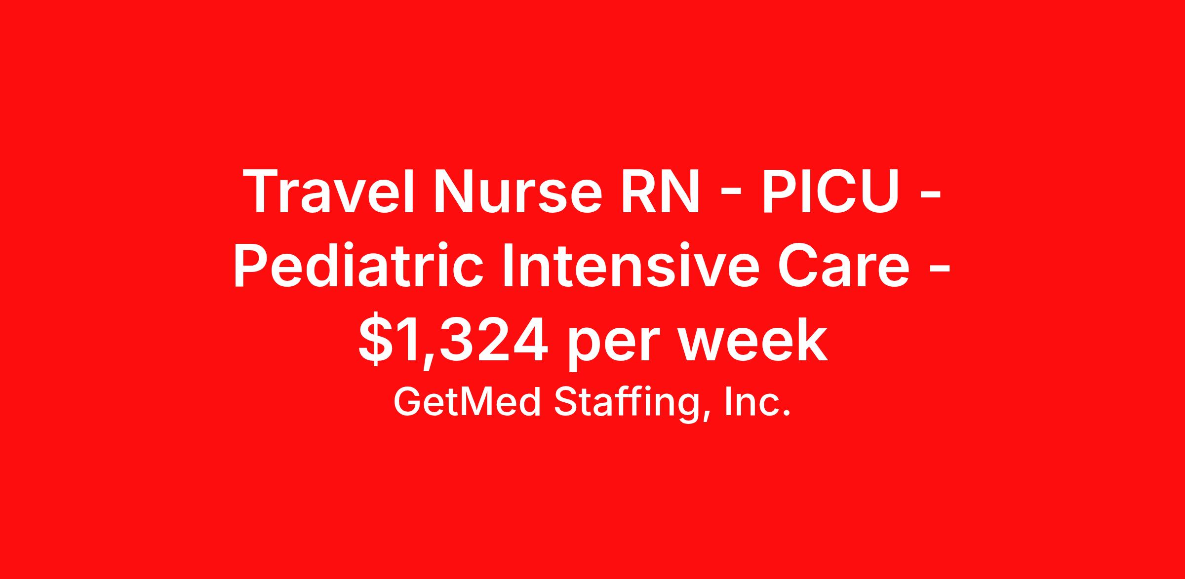 GetMed Staffing, Inc. is seeking a travel nurse RN PICU - Pediatric Intensive Care for a travel nursing job in Houston, Texas. Job Description & Requirements Specialty: PICU - Pediatric Intensive Care Discipline: RN Start Date: 03/30/2026 Duration: 13 weeks 36 hours per week Shift: 12 hours, nights Employment Type: Travel GetMed Staffing is searching for a strong PICU RN to assist our traveler-friendly client. A minimum of 1-2 years of experience is required. Traveling with GetMed Staffing offers the unique opportunity to gain diverse experiences, both personally and professionally. Gain experience that matters. GetMed Staffing, Inc. Job ID 35804410. Pay package is based on 12 hour shifts and 36.0 hours per week (subject to confirmation) with tax-free stipend amount to be determined. Posted job title: RN:PICU,19:00:00-07:00:00 About GetMed Staffing, Inc. We are a diversity owned company, specializing in healthcare recruiting services. We truly understand how important a healthcare travelers' relationship is with their recruiter, as well as our relationship is with our healthcare facilities. We recognize that the needs of our healthcare travelers can vary, and therefore we provide the personalized touch necessary to ensure a successful travel assignment each and every time. Our healthcare facilities and clients benefit from us putting our healthcare travelers first. GetMed Staffing is excited to be a leader within the industry by focusing on providing healthcare travelers with more choices and possibilities as they plan for their next healthcare travel assignment. Benefits Life insurance Medical benefits Dental benefits Vision benefits 401k retirement plan