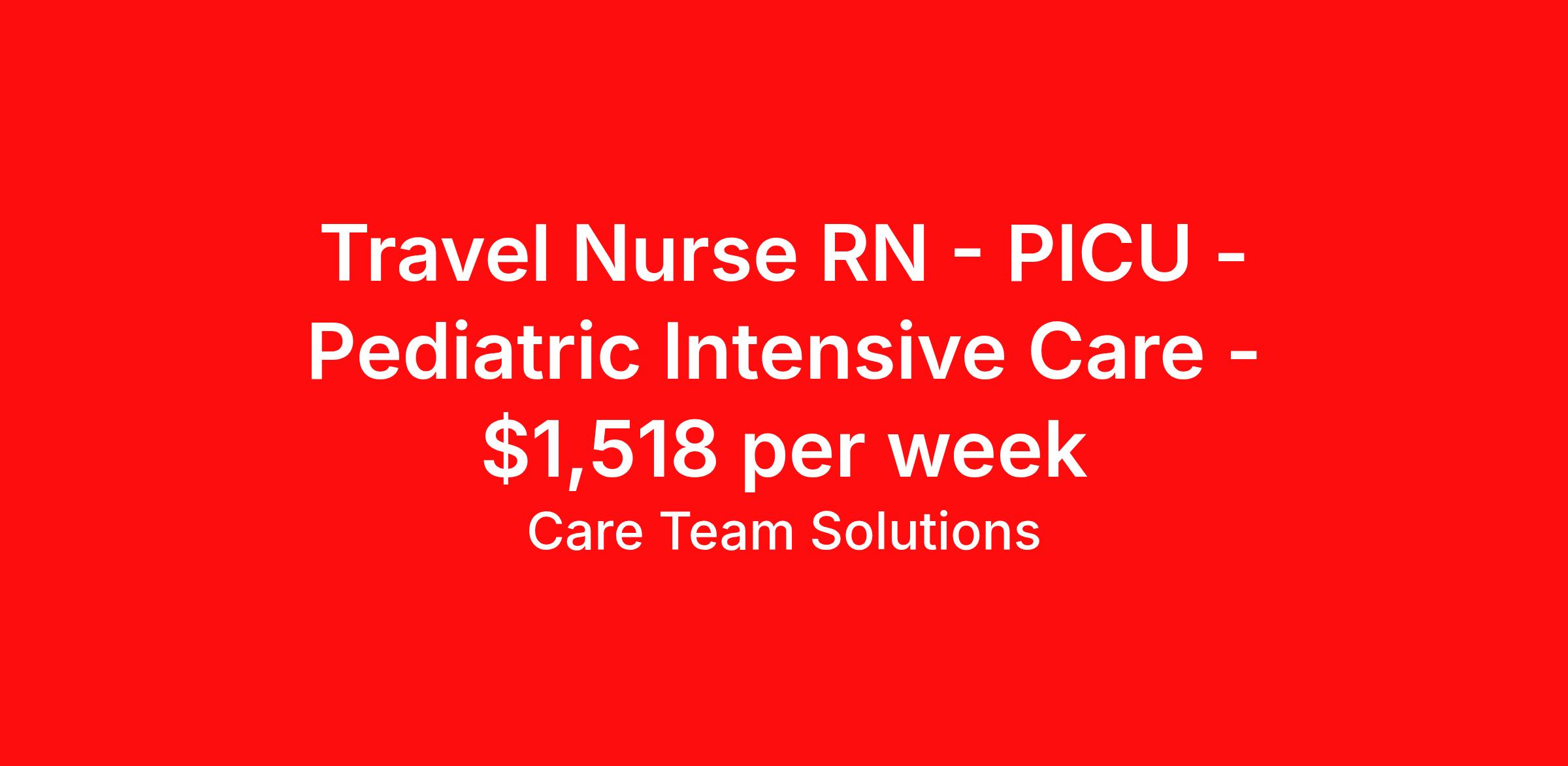 Care Team Solutions is seeking a travel nurse RN PICU - Pediatric Intensive Care for a travel nursing job in Houston, Texas. Job Description & Requirements Specialty: PICU - Pediatric Intensive Care Discipline: RN Start Date: ASAP Duration: 13 weeks 36 hours per week Shift: 12 hours Employment Type: Travel Registered Nurse must have 2 years of recent experience in particular specialty Details: Must Have 2 Years of recent Pediatric Intensive Care Unit experience. Specialty: Pediatric Intensive Care Unit Discipline: Registered Nurse Start Date: 2026-02-23 Duration: 13 Weeks Shift: 12 Hours Overnight shift. Hours Per Week: 36 Hours Employment Type: Contract Gross Weekly Pay: $1517.72 Six things that won’t happen if you apply to this job: You won’t have to guess what the downsides are. We’ll tell you up front. You won’t show up on day 1 and find out this is not what you signed up for. We won't leave your phone call ringing when it's inconvenient. Business hours for you are business hours for us. You won’t get shuffled to some customer service rep when a problem pops up. If we screw up something in securing your placement, we'll own it. That means it's on us to make it right. You won’t figure out your credentials alone. Our credentialing experts will walk you through it step by step. We've talked to thousands of travel nurses like you. We know you want good pay. You want to choose when you work. But the one thing nurse after nurse has said they want and don't have is someone in their corner. There's a lot in this business that’s messed up. We’re trying to be the people that fix it. You and every nurse with the guts to travel deserve it. We've worked hard for you to enjoy some one-of-a-kind benefits you'll not likely find anywhere else, because they benefit you more than they benefit us: Our early pay program Student loan reimbursement Free well-being tele-visits with a psychologist Care Team Solutions Job ID 582724. Pay package is based on 12 hour shifts and 36 hours per week (subject to confirmation) with tax-free stipend amount to be determined. Posted job title: Travel- RN- PICU (645)/ 7:00PM-7:00AM 13 weeks About Care Team Solutions Two brothers who give an enormous damn. We're Justin and Kyle. Neither of us are nurses. It doesn’t take a nurse to see that the way travel nurses are treated sucks. Nursing is already hard enough. Travel nursing takes serious guts. You get the toughest assignments in places you’ve never been. Which can be fun, but it’s also stressful. You’re in your element but outside of your hometown. You can be a stranger on the team. If anyone deserves someone in their corner, it’s you. But that’s not how most agencies operate. Which is why travel nurses hate working with them. We got into this business because we saw bucket-loads of nurses moving through the "churn and burn" travel machinery. We absolutely hate that. You'll do your best work when you have the placements you want and feel fully supported in your work. We pay our people well because we want them to treat you well. Our recruiters are amazing (we picked each of them ourselves), but if you've got a problem too big for them, they can come straight to us. We work like ten feet away. The "Churners and Burners" promise you the same benefits. They might as well copy/paste them from each other. We have them too: 401k, holiday pay, healthcare, dental, travel reimbursement, etc But we've worked hard for you to enjoy some one-of-a-kind benefits you'll not likely find anywhere else, because they benefit you more than they benefit us: Our early pay program Student loan reimbursement Free well-being tele-visits with a psychologist Benefits Weekly pay Holiday Pay Guaranteed Hours 401k retirement plan Wellness and fitness programs Referral bonus Medical benefits Dental benefits Vision benefits School loan reimbursement
