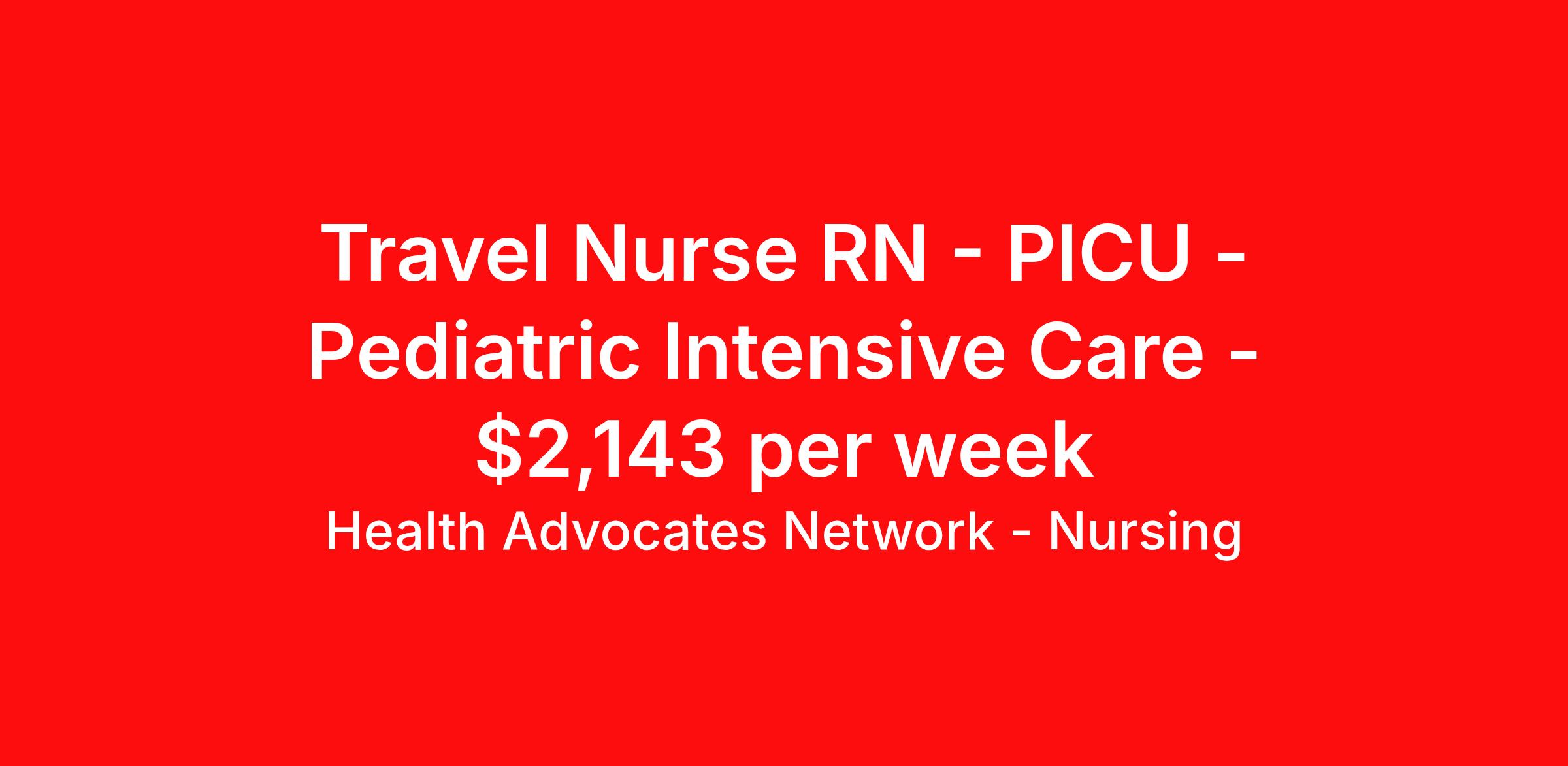Health Advocates Network - Nursing is seeking a travel nurse RN PICU - Pediatric Intensive Care for a travel nursing job in Seattle, Washington. Job Description & Requirements Specialty: PICU - Pediatric Intensive Care Discipline: RN Start Date: 04/06/2026 Duration: 7 weeks 36 hours per week Shift: 12 hours, nights Employment Type: Travel HANStaff Job ID 519628. Pay package is based on 12 hour shifts and 36 hours per week (subject to confirmation) with tax-free stipend amount to be determined. Posted job title: RN - PICU About Health Advocates Network - Nursing Health Advocates Network was founded on the basis of a shared aspiration, to improve the way healthcare staffing is done. We are a company established and led by nurses. Our flexible approach enables us to develop solutions customized to your specific needs. From short- and long-term travel contracts to local and per diem assignments and more, we are here to get you to your next adventure! By solving challenges, providing the best placements, and advocating for you, we stand to help you thrive and pave the path forward in your career. Click on the videos below to learn more about our values!