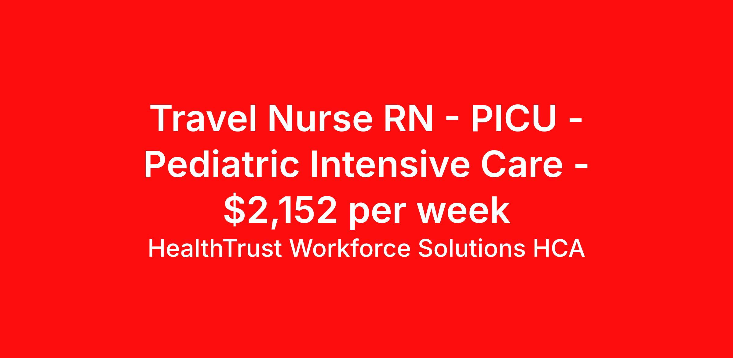 HealthTrust Workforce Solutions HCA is seeking a travel nurse RN PICU - Pediatric Intensive Care for a travel nursing job in Alexandria, Louisiana. Job Description & Requirements Specialty: PICU - Pediatric Intensive Care Discipline: RN Duration: 13 weeks 36 hours per week Shift: 12 hours, nights Employment Type: Travel Shifts 7P-7A / 13 Weeks Position - TRAVEL - RN PICU (645)/ Rapides / 7P-7A (957150) Must have : candidates without these skills will not be considered for the role. 1 year pediatric ICU nursing experience Preferred or nice to have : candidates with these skills will be considered first. · PICU, NICU experience · Experienced in other women’s health areas (labor and delivery, ob/gyn) List typical procedures performed on unit(s): · Spinal taps · Titration of critical drips: sedation/vasoactive/paralytic · Sedated MRI · EKG/EEG/Telemetry · Port Access & Discontinuation · Intubation/Extubation Best personality Fit: · Patient person who is able to multi task and prioritize tasks effectively · Self-starter · Organized REQUIRED CERTIFICATIONS: · ACLS, BLS, PALS Floating Area(s): · May float to NICU (take low acuity) or Nursery · May float to Ob/gyn if qualified We have multiple opportunities available nationwide. If you’re interested in this position—or would like to hear about other openings—please reply to this post or call/text me. Local contract options are also available. About HealthTrust Workforce Solutions HCA At HealthTrust Workforce Solutions, healthcare is not just about the four walls of a facility but about the people who provide and receive care. Our focus is on empowering healthcare professionals to deliver exceptional patient experiences by providing them with the necessary skills, tools, and support. We partner with healthcare facilities nationwide to ensure that the right professionals are in the right roles. We prioritize our clinicians by giving them a voice and access to opportunities to fulfill their mission of improving lives by providing quality patient care. We are committed to our core values of Trust, Innovation, Adaptability, Courage, and Accountability. We are dedicated to positively impacting the healthcare industry by providing first-priority access to more than 200,000 jobs nationwide to our healthcare professionals. Join us and be part of the HealthTrust family, where you can make a difference every day. We embrace our changing environment, and we maintain a culture that has a rich tradition of transforming itself to meet the challenges of the future. MISSION STATEMENT While putting great people in the right roles is essential, our mission is far greater. We want our clinicians to be part of the HealthTrust family, where healthcare professionals have a voice and are empowered with the right tools and opportunities to fulfill their personal mission of improving lives. Plus, as a preferred partner to thousands of top-performing hospitals, we provide our healthcare professionals with first-priority access to more than 200,000 jobs nationwide. Benefits Dental benefits Vision benefits Referral bonus Continuing Education Life insurance