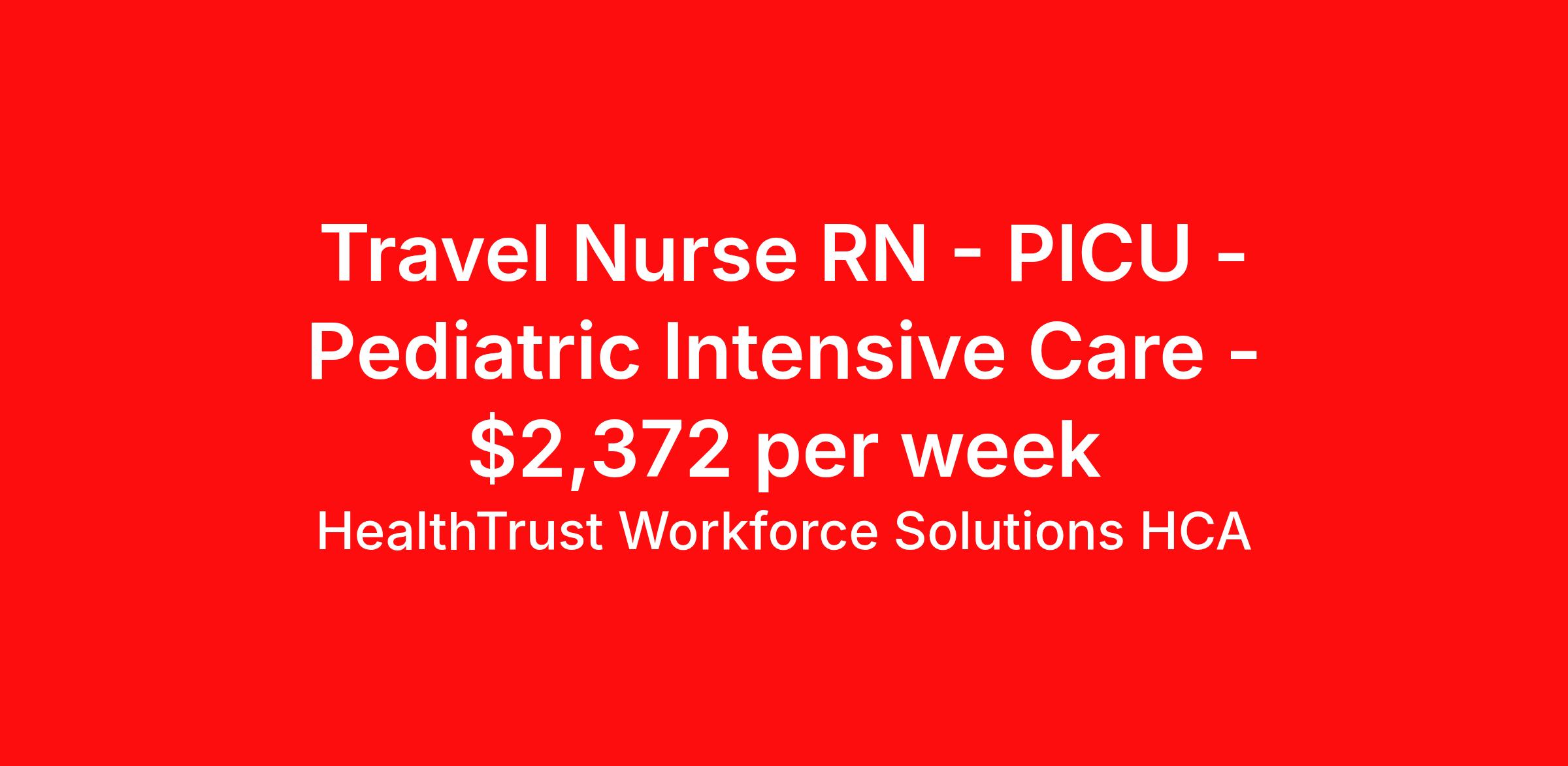 HealthTrust Workforce Solutions HCA is seeking a travel nurse RN PICU - Pediatric Intensive Care for a travel nursing job in Asheville, North Carolina. Job Description & Requirements Specialty: PICU - Pediatric Intensive Care Discipline: RN Start Date: 04/06/2026 Duration: 13 weeks 36 hours per week Shift: 12 hours, nights Employment Type: Travel Hospital: Mission Hospital Location: 3G Address: 509 Biltmore Ave Unit Name: PICU Building: Cost Center:64012 General Information Unit Specifics: · Scrub Color(s): Navy blue or white · Number of Beds : 9 · Patient Ratios : PICU 1Rn to 1-2 pts Stepdown: 1RN to 2-3 pts. · Unit staffing description- (unit secretaries and tech availability) : HUC works 9-9. Tech is shared with PICU. · Type of equipment : Alaris pumps · Documentation system: Cerner · Scheduling requirements: In a 6 week schedule must work 3 weekends · Floating policy: Will float to Peds and NICU · Patient Experience requirements: 1 year PICU experience Hospital Specifics- · Certifications: PALs Hiring profile Requested Skill Set: Must have : PALs Advanced skills needed: n/a Procedures performed on unit: : IV starts, Caths, holding for LP’s, central line dressing changes, hemodynamic monitoring, trach care, tube feeding and placement, ICP monitoring, ventilator management. Certifications Required: PALs Dress Code : (Required uniform) · All Navy, All white, or Navy pants and white tops. Unit Guidelines/Policies : Please attach unit specific policies and guidelines. · All policies available on the intranet Jayden Williamson | Healthcare Recruiter | HealthTrust Workforce Solutions | e: About HealthTrust Workforce Solutions HCA At HealthTrust Workforce Solutions, healthcare is not just about the four walls of a facility but about the people who provide and receive care. Our focus is on empowering healthcare professionals to deliver exceptional patient experiences by providing them with the necessary skills, tools, and support. We partner with healthcare facilities nationwide to ensure that the right professionals are in the right roles. We prioritize our clinicians by giving them a voice and access to opportunities to fulfill their mission of improving lives by providing quality patient care. We are committed to our core values of Trust, Innovation, Adaptability, Courage, and Accountability. We are dedicated to positively impacting the healthcare industry by providing first-priority access to more than 200,000 jobs nationwide to our healthcare professionals. Join us and be part of the HealthTrust family, where you can make a difference every day. We embrace our changing environment, and we maintain a culture that has a rich tradition of transforming itself to meet the challenges of the future. MISSION STATEMENT While putting great people in the right roles is essential, our mission is far greater. We want our clinicians to be part of the HealthTrust family, where healthcare professionals have a voice and are empowered with the right tools and opportunities to fulfill their personal mission of improving lives. Plus, as a preferred partner to thousands of top-performing hospitals, we provide our healthcare professionals with first-priority access to more than 200,000 jobs nationwide. Benefits Dental benefits Vision benefits Referral bonus Continuing Education Life insurance