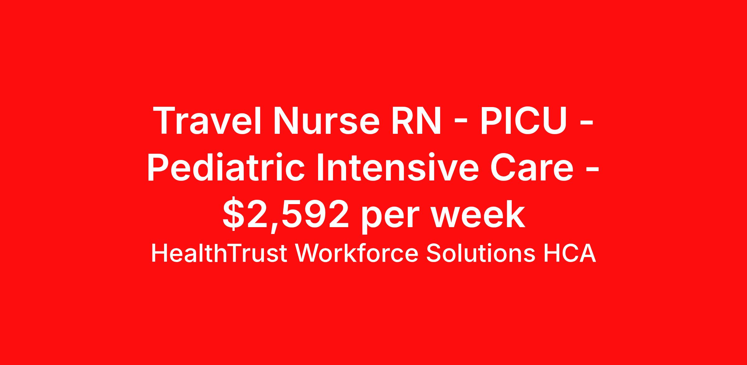 HealthTrust Workforce Solutions HCA is seeking a travel nurse RN PICU - Pediatric Intensive Care for a travel nursing job in Alexandria, Louisiana. Job Description & Requirements Specialty: PICU - Pediatric Intensive Care Discipline: RN Duration: 11 weeks 36 hours per week Shift: 12 hours, nights Employment Type: Travel Rapides Regional Medical Center Alexandria, LA PICU RN Requirements: Must have 1 year of RN experience Must have 12 months of experience in area of specialty within the last 12 months Active RN Licensure Current BLS Current ACLS Current PALS About HealthTrust Workforce Solutions HCA At HealthTrust Workforce Solutions, healthcare is not just about the four walls of a facility but about the people who provide and receive care. Our focus is on empowering healthcare professionals to deliver exceptional patient experiences by providing them with the necessary skills, tools, and support. We partner with healthcare facilities nationwide to ensure that the right professionals are in the right roles. We prioritize our clinicians by giving them a voice and access to opportunities to fulfill their mission of improving lives by providing quality patient care. We are committed to our core values of Trust, Innovation, Adaptability, Courage, and Accountability. We are dedicated to positively impacting the healthcare industry by providing first-priority access to more than 200,000 jobs nationwide to our healthcare professionals. Join us and be part of the HealthTrust family, where you can make a difference every day. We embrace our changing environment, and we maintain a culture that has a rich tradition of transforming itself to meet the challenges of the future. MISSION STATEMENT While putting great people in the right roles is essential, our mission is far greater. We want our clinicians to be part of the HealthTrust family, where healthcare professionals have a voice and are empowered with the right tools and opportunities to fulfill their personal mission of improving lives. Plus, as a preferred partner to thousands of top-performing hospitals, we provide our healthcare professionals with first-priority access to more than 200,000 jobs nationwide. Benefits Dental benefits Vision benefits Referral bonus Continuing Education Life insurance