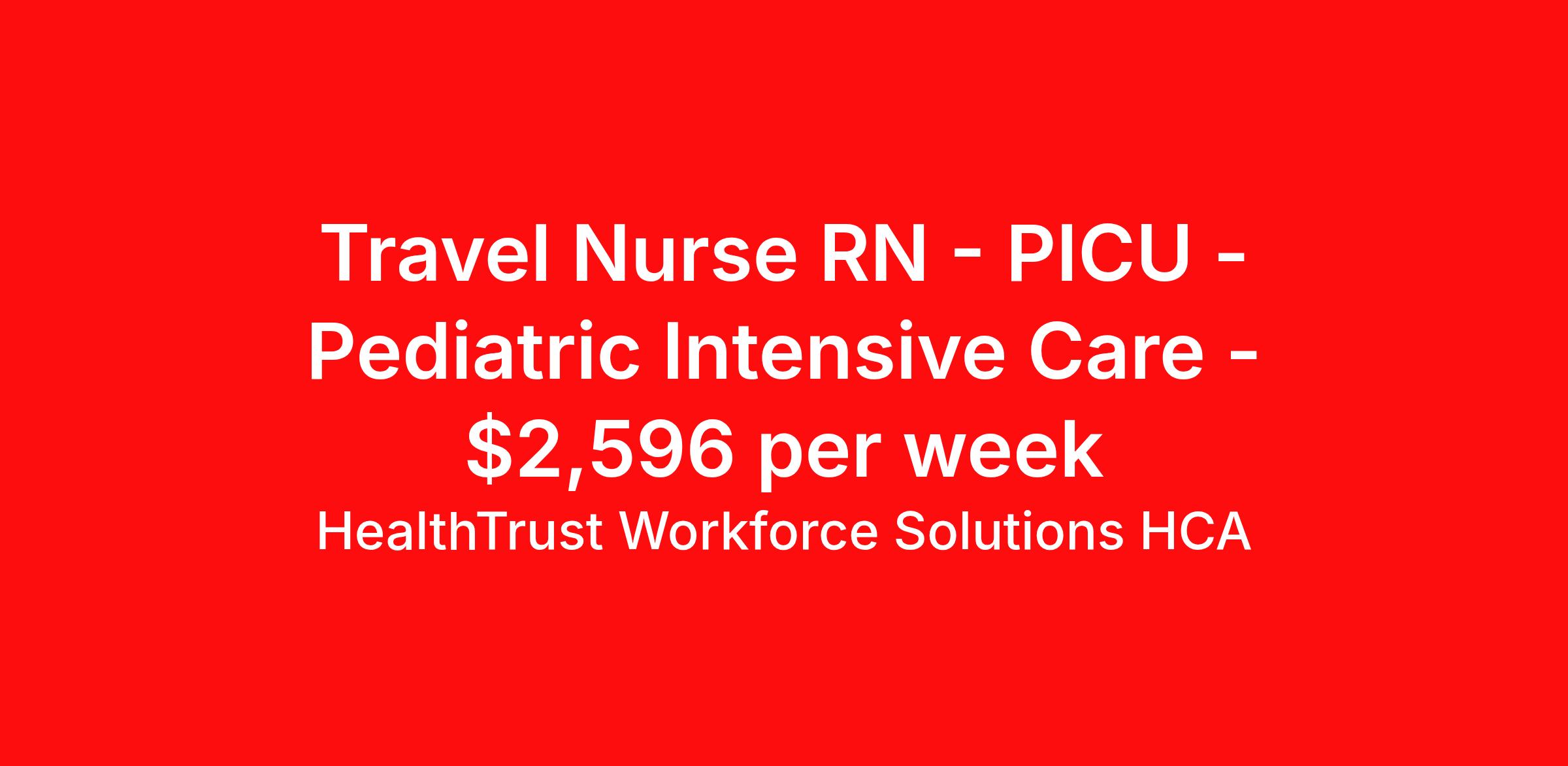 HealthTrust Workforce Solutions HCA is seeking a travel nurse RN PICU - Pediatric Intensive Care for a travel nursing job in Asheville, North Carolina. Job Description & Requirements Specialty: PICU - Pediatric Intensive Care Discipline: RN Start Date: 04/20/2026 Duration: 13 weeks 36 hours per week Shift: 12 hours, nights Employment Type: Travel Unit : PICU Beds - 9 Documentation system: Cerner Patient Experience requirements: 1 year PICU experience Must have: PALS About HealthTrust Workforce Solutions HCA At HealthTrust Workforce Solutions, healthcare is not just about the four walls of a facility but about the people who provide and receive care. Our focus is on empowering healthcare professionals to deliver exceptional patient experiences by providing them with the necessary skills, tools, and support. We partner with healthcare facilities nationwide to ensure that the right professionals are in the right roles. We prioritize our clinicians by giving them a voice and access to opportunities to fulfill their mission of improving lives by providing quality patient care. We are committed to our core values of Trust, Innovation, Adaptability, Courage, and Accountability. We are dedicated to positively impacting the healthcare industry by providing first-priority access to more than 200,000 jobs nationwide to our healthcare professionals. Join us and be part of the HealthTrust family, where you can make a difference every day. We embrace our changing environment, and we maintain a culture that has a rich tradition of transforming itself to meet the challenges of the future. MISSION STATEMENT While putting great people in the right roles is essential, our mission is far greater. We want our clinicians to be part of the HealthTrust family, where healthcare professionals have a voice and are empowered with the right tools and opportunities to fulfill their personal mission of improving lives. Plus, as a preferred partner to thousands of top-performing hospitals, we provide our healthcare professionals with first-priority access to more than 200,000 jobs nationwide. Benefits Dental benefits Vision benefits Referral bonus Continuing Education Life insurance