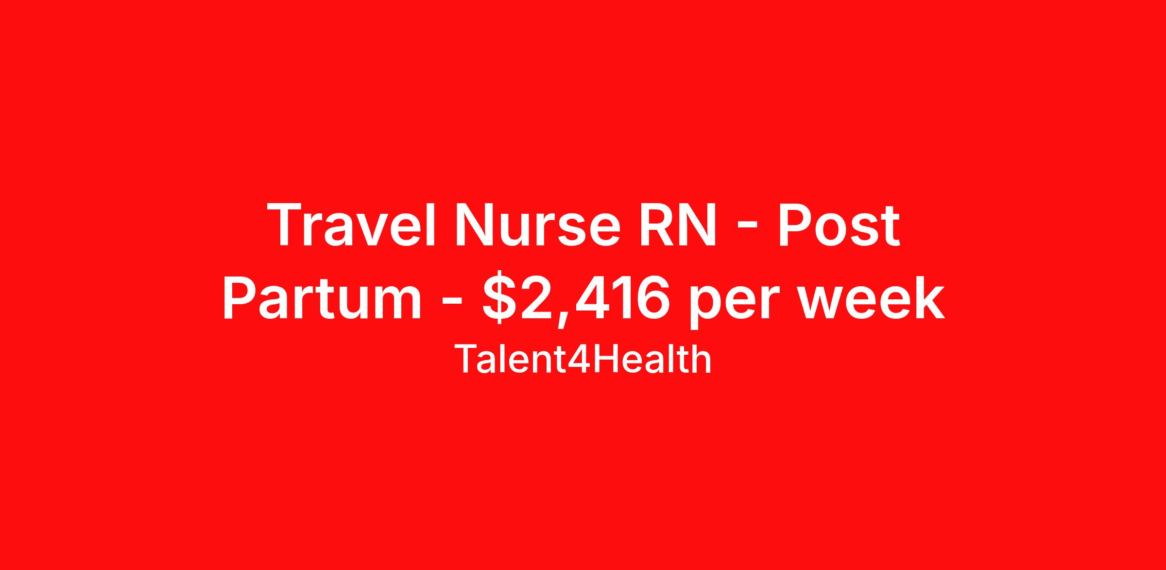 Talent4Health is seeking a travel nurse RN Post Partum for a travel nursing job in Boston, Massachusetts. Job Description & Requirements Specialty: Post Partum Discipline: RN Start Date: 03/23/2026 Duration: 13 weeks 36 hours per week Shift: 12 hours, nights Employment Type: Travel Flu vaccine will be required during onboarding - PP RN needed for 12H nights, 7a-7:30a and every other weekend rotation. Holidays required as they are looking for seasonal coverage. Must have MA license at time of submission. 2 Years of experience required. BLS, NRP required. Prior travel is required. Experience with magnesium drips and telemetry highly recommended and preferred. About Talent4Health A leader and innovator, offering comprehensive talent solutions for the healthcare industry across the nation. Talent4Health, based in Wilmington, DE is a one stop solution that offers access to an inclusive network of excellent healthcare professionals through its state-of-the-art recruitment strategies and extensive career opportunities. We have successfully placed over 3000 plus clinicians with the topmost healthcare facilities across 50 states in the US. With countless prestigious clients under our umbrella, backed up by passionate and hard-working recruiters, we are a team you have been looking for! Why Choose us? When it comes to choosing a recruitment agency, it’s imperative to consider what all they have to offer. Proficiency : Our seasoned team of professionals has years of experience and we are dedicated to provide the highest quality service to our clients and candidates. Personalized service : We understand that every candidate is unique, and we work closely with each one to develop a customized plan that meets their specific needs. Consistency : We are devoted to offer dependable recruitment solutions for our candidates, and we are always a phone call away for all their questions or concerns. Comprehensive care : Our healthcare recruitment team works for different specialties, so there is a job for everyone. If this is all that excites you, do visit http://www.talent4health.com today!