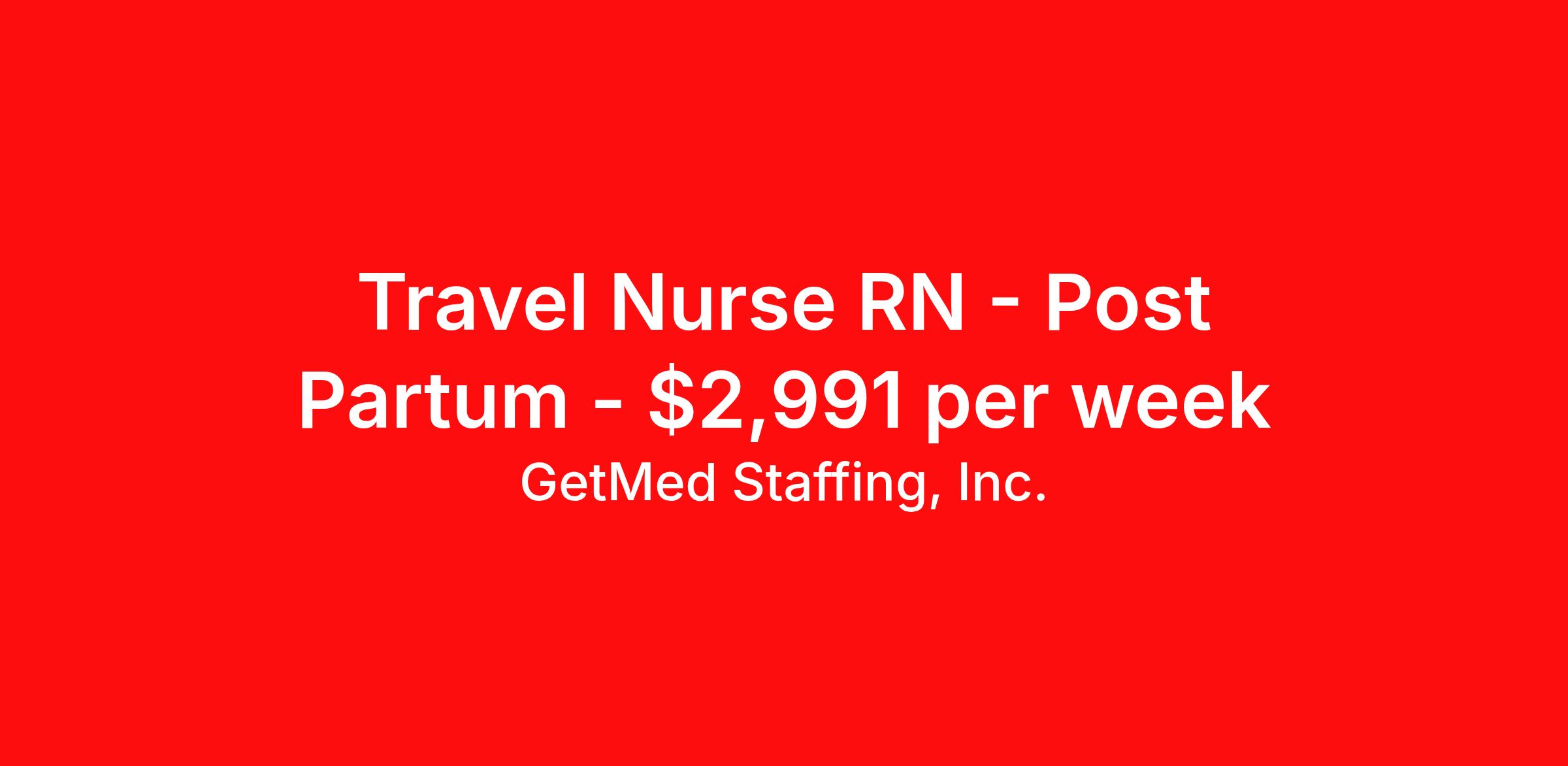 GetMed Staffing, Inc. is seeking a travel nurse RN Post Partum for a travel nursing job in Salinas, California. Job Description & Requirements Specialty: Post Partum Discipline: RN Start Date: 04/13/2026 Duration: 13 weeks 40 hours per week Shift: 10 hours, flexible Employment Type: Travel GetMed Staffing is searching for a strong Post Partum RN to assist our traveler-friendly client. A minimum of 1-2 years of experience is required. Traveling with GetMed Staffing offers the unique opportunity to gain diverse experiences, both personally and professionally. Gain experience that matters. GetMed Staffing, Inc. Job ID 36116326. Pay package is based on 10 hour shifts and 40.0 hours per week (subject to confirmation) with tax-free stipend amount to be determined. Posted job title: RN:Post Partum,07:00:00-17:00:00 About GetMed Staffing, Inc. We are a diversity owned company, specializing in healthcare recruiting services. We truly understand how important a healthcare travelers' relationship is with their recruiter, as well as our relationship is with our healthcare facilities. We recognize that the needs of our healthcare travelers can vary, and therefore we provide the personalized touch necessary to ensure a successful travel assignment each and every time. Our healthcare facilities and clients benefit from us putting our healthcare travelers first. GetMed Staffing is excited to be a leader within the industry by focusing on providing healthcare travelers with more choices and possibilities as they plan for their next healthcare travel assignment. Benefits Life insurance Medical benefits Dental benefits Vision benefits 401k retirement plan