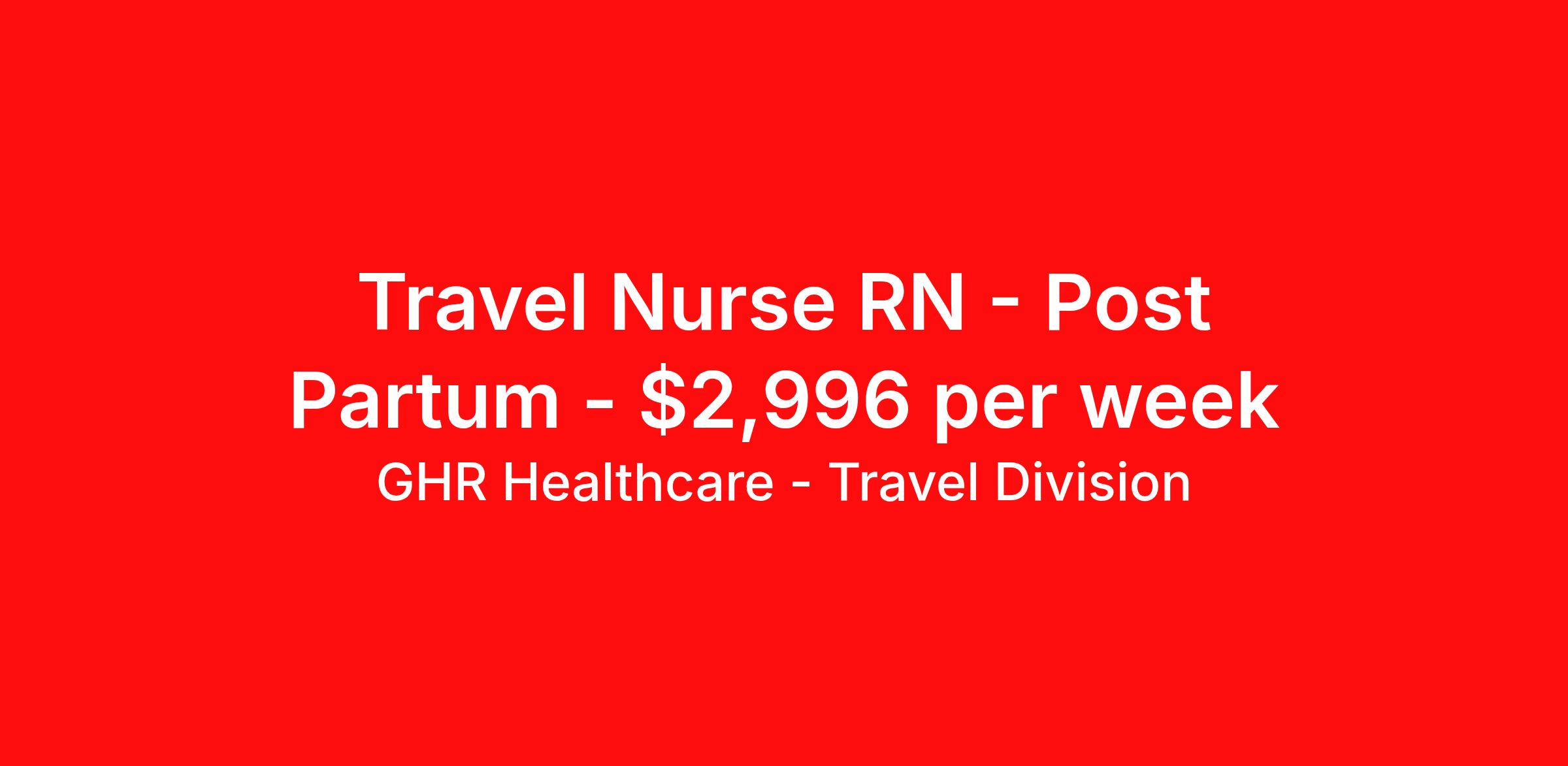GHR Healthcare - Travel Division is seeking a travel nurse RN Post Partum for a travel nursing job in Bakersfield, California. Job Description & Requirements Specialty: Post Partum Discipline: RN Start Date: 04/20/2026 Duration: 13 weeks 36 hours per week Shift: 12 hours, days, nights Employment Type: Travel Active CA RN license 3 years recent Postpartum RN experience BLS, ACLS, NRP required Cerner About GHR Healthcare - Travel Division For over 30 years, GHR Healthcare has been the bridge between healthcare professionals and the facilities that need them nationwide. We're committed to uncovering your ideal fit, supported by GHR's dedication to competitive compensation, transparent communication, and a devoted team that genuinely cares about your career journey. You can trust us to stand by your side as your advocate, confidante, and partner in advancing your career. At GHR, care and consideration are at the heart of everything we do. Visit ghrhealthcare.com to learn more.