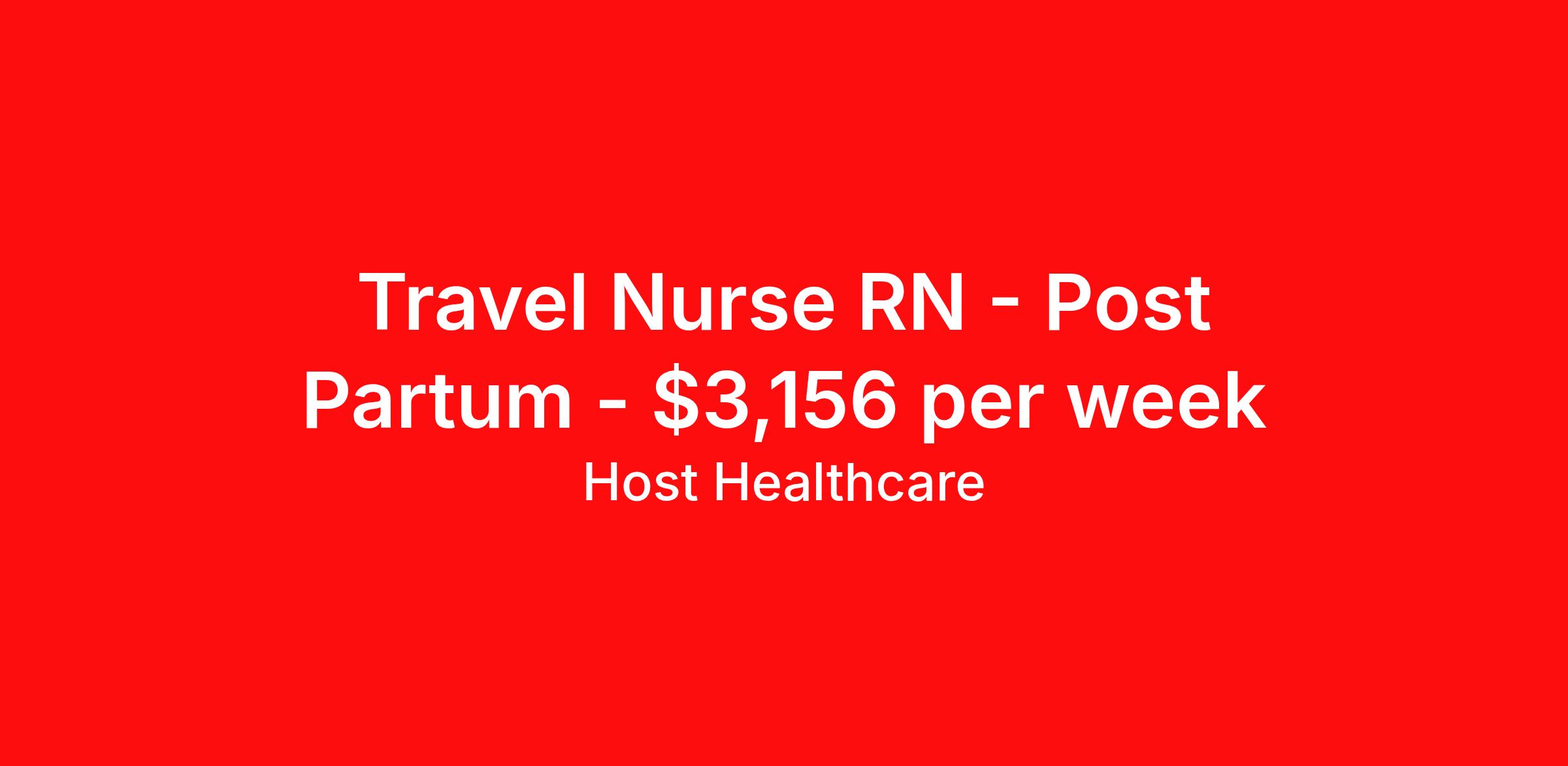 Host Healthcare is seeking a travel nurse RN Post Partum for a travel nursing job in Salinas, California. Job Description & Requirements Specialty: Post Partum Discipline: RN Start Date: 03/23/2026 Duration: 13 weeks 40 hours per week Shift: 10 hours, days, flexible Employment Type: Travel Host Healthcare Job ID a1fVX000002wEMPYA2. Pay package is based on 10 hour shifts and 40 hours per week (subject to confirmation) with tax-free stipend amount to be determined. Posted job title: RN - Postpartum-Nursery About Host Healthcare At Host Healthcare, we provide a truly comfortable experience as you explore your travel nursing, therapy, or allied career. We make your travel healthcare journey easy by taking care of all the details, so you don’t have to. We are on a mission to help others live better and we do this by helping the healers of the world be as comfortable as possible. With access to tens of thousands of travel nursing, therapy, and allied jobs in all 50 states, our responsive and friendly recruiters find your dream position based on what’s important to you. During your assignment, get access to premium benefits, including Day 1 medical that continues up to 30 days between assignments, 401K matching, travel reimbursements, dedicated housing support, and more. We also offer 24/7 support from our team and access to our on-staff clinicians so you can feel comfortable and confident throughout your entire assignment. Travel comfortably with Host Healthcare. Benefits Referral bonus School loan reimbursement Vision benefits Wellness and fitness programs Company provided housing options License and certification reimbursement Life insurance Medical benefits Mileage reimbursement Pet insurance Discount program Employee assistance programs Guaranteed Hours Health savings account Holiday Pay 401k retirement plan Continuing Education Dental benefits