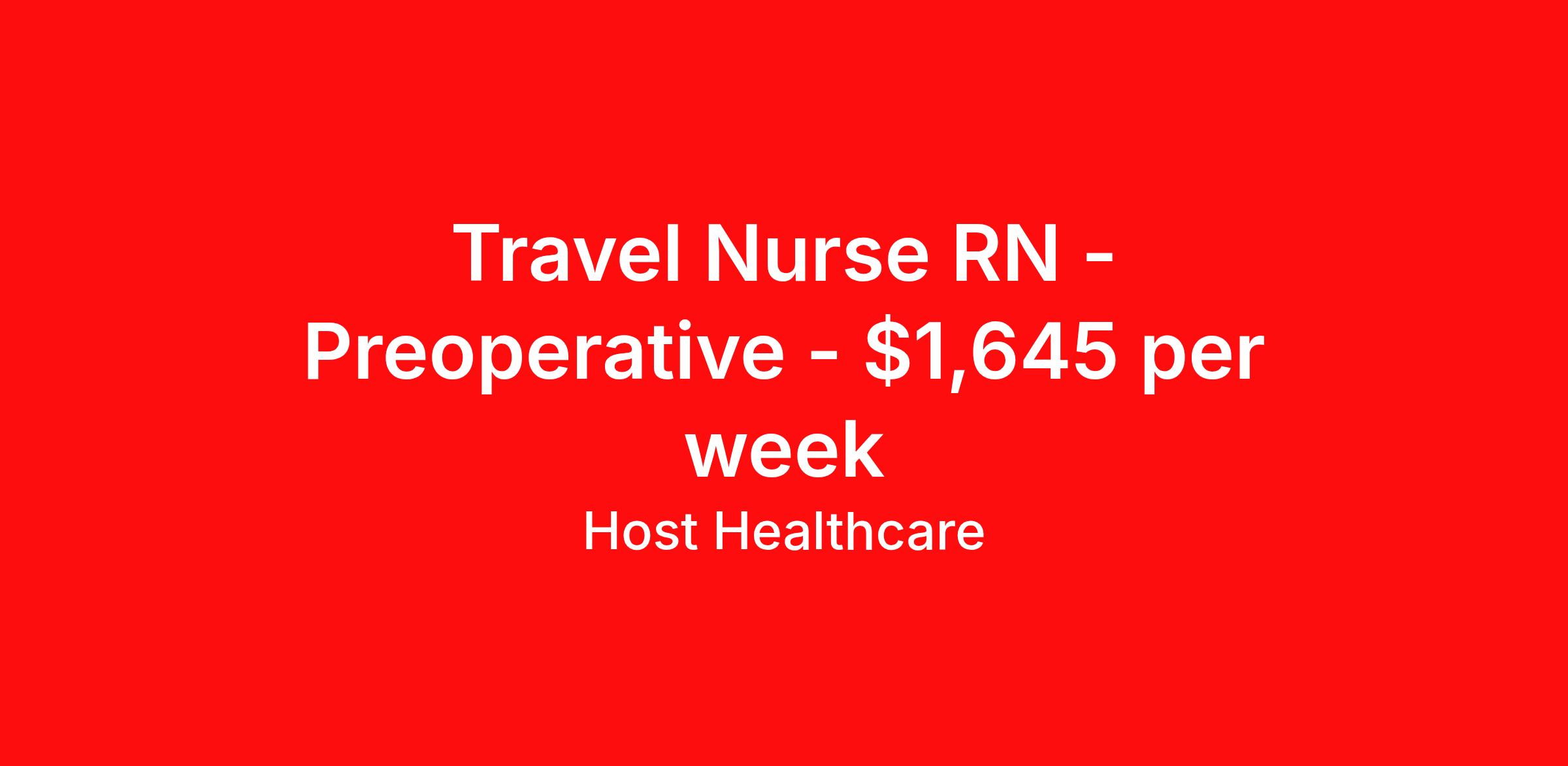 Host Healthcare is seeking a travel nurse RN Preoperative for a travel nursing job in Dallas, Texas. Job Description & Requirements Specialty: Preoperative Discipline: RN Start Date: ASAP Duration: 13 weeks 40 hours per week Shift: 10 hours, days Employment Type: Travel Host Healthcare Job ID a1fVX000002nFcfYAE. Pay package is based on 10 hour shifts and 40 hours per week (subject to confirmation) with tax-free stipend amount to be determined. Posted job title: RN - Pre-Op About Host Healthcare At Host Healthcare, we provide a truly comfortable experience as you explore your travel nursing, therapy, or allied career. We make your travel healthcare journey easy by taking care of all the details, so you don’t have to. We are on a mission to help others live better and we do this by helping the healers of the world be as comfortable as possible. With access to tens of thousands of travel nursing, therapy, and allied jobs in all 50 states, our responsive and friendly recruiters find your dream position based on what’s important to you. During your assignment, get access to premium benefits, including Day 1 medical that continues up to 30 days between assignments, 401K matching, travel reimbursements, dedicated housing support, and more. We also offer 24/7 support from our team and access to our on-staff clinicians so you can feel comfortable and confident throughout your entire assignment. Travel comfortably with Host Healthcare. Benefits Referral bonus School loan reimbursement Vision benefits Wellness and fitness programs Company provided housing options License and certification reimbursement Life insurance Medical benefits Mileage reimbursement Pet insurance Discount program Employee assistance programs Guaranteed Hours Health savings account Holiday Pay 401k retirement plan Continuing Education Dental benefits