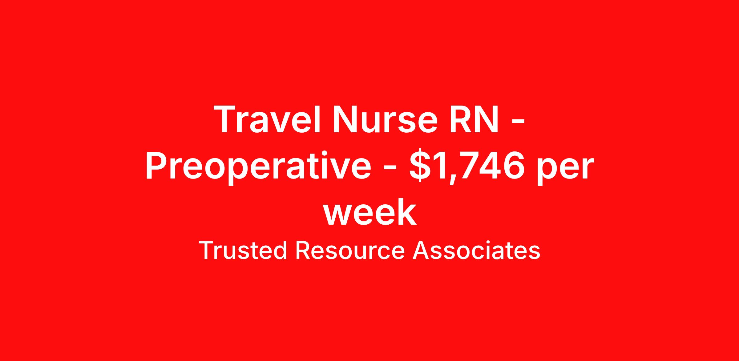 Trusted Resource Associates (TRA) is seeking a travel nurse RN Preoperative for a travel nursing job in Memphis, Tennessee. Job Description & Requirements Specialty: Preoperative Discipline: RN Start Date: 04/01/2026 Duration: 13 weeks 36 hours per week Shift: 12 hours, nights Employment Type: Travel TRA RN Pre Op TRA is Tenet's in-house nationwide contingent pool for Nursing and Allied travel and local contracts. Receive a greater level of Contract security compared to with an outside agency. BENEFITS - Guaranteed hours for Travel Contracts - Preferred Booking Agreement for Local Contracts - Weekly Pay - Holiday Pay - Contract Security compared to a contract with an outside agency Minimum education Graduate of an accredited School of nursing Minimum Experience Must have 2 years of Acute Care nursing experience with a minimum one year current in Pre Op Required Certification/Licensure - Must be currently licensed, certified or registered to practice profession as required by law, regulation in state of practice or policy. Must meet all certification requirements for each nursing specialty supported - American Heart Association - CPR-Basic Life Support - Other credentialing items, such as a skills checklist and health related documents, which will be specified by your Recruiter. Our Hire Process - We do qualify our clinicians to meet or exceed the minimum requirements of a travel or local assignment. If you are qualified, we may direct-hire you, reducing the time we can get you to work! When you reach out to a TRA Recruiter for more details, ensure your Vivian profile includes your most updated resume! Trusted Resource Associates (TRA) Job ID 500151. Pay package is based on 12 hour shifts and 36 hours per week (subject to confirmation) with tax-free stipend amount to be determined. Benefits 401k retirement plan Weekly pay Holiday Pay Referral bonus