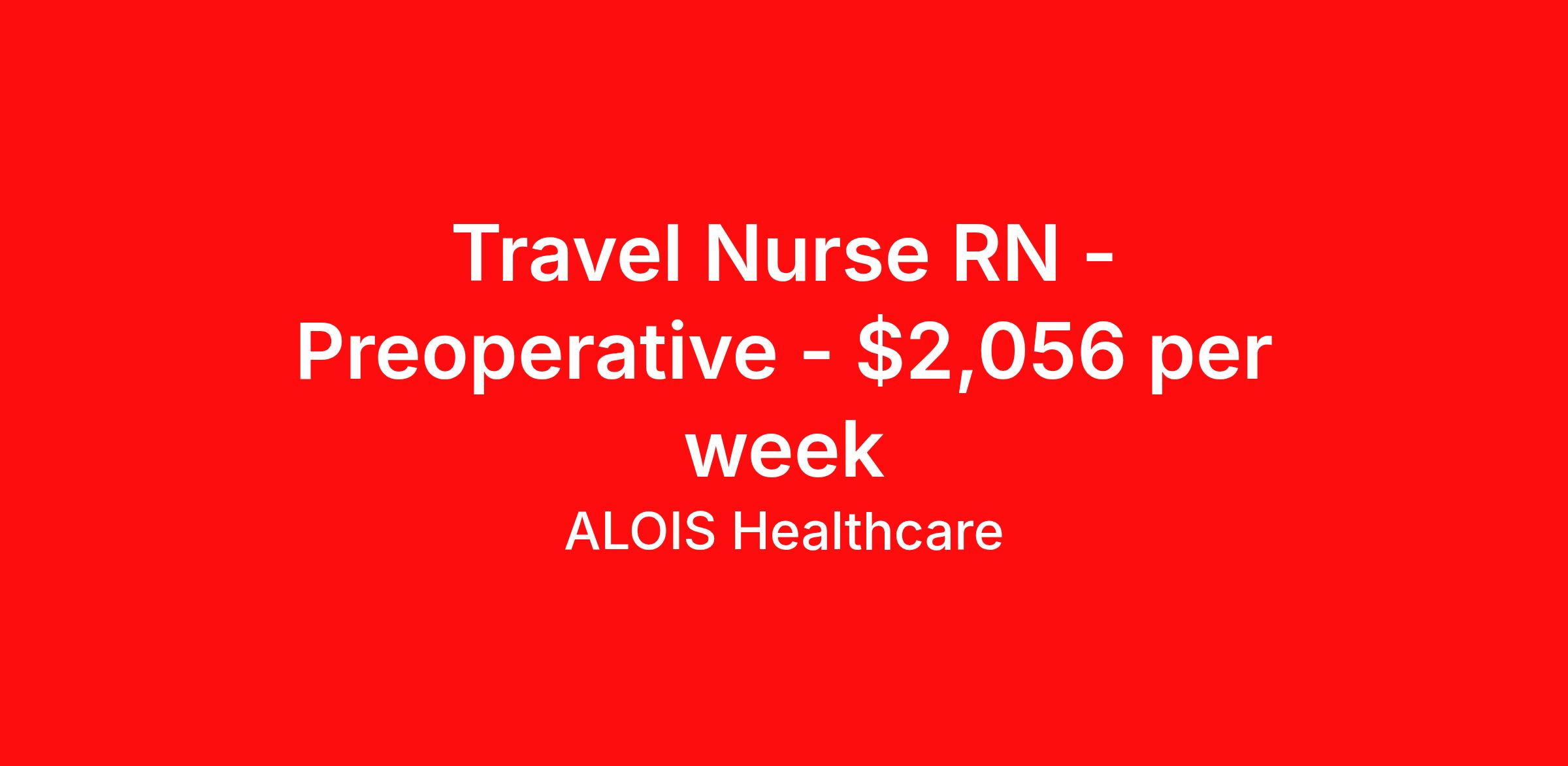 ALOIS Healthcare is seeking a travel nurse RN Preoperative for a travel nursing job in Canton, Georgia. Job Description & Requirements Specialty: Preoperative Discipline: RN Start Date: 04/13/2026 Duration: 13 weeks 40 hours per week Shift: 8 hours, days Employment Type: Travel ALOIS Healthcare Job ID 17919887. Pay package is based on 8 hour shifts and 40.0 hours per week (subject to confirmation) with tax-free stipend amount to be determined. Posted job title: RN Pre-Op About ALOIS Healthcare Why ALOIS Healthcare? ALOIS means “brave warrior” and that’s what you are- Warrior in Scrubs! Just as you advocate for your patients, we will advocate for you. The pay you deserve. The support you need. We’re in your corner for every battle – because you shouldn’t settle for anything less when it comes to your career. We offer: · Industry-leading pay Generous cost of living and housing stipends · Opportunities for referral, sign-on, and extension bonuses · Weekly health insurance or health insurance Marketplace weekly bonus · Continuing education credits We’re proud to be recognized globally as a certified minority-owned staffing supplier. At ALOIS Healthcare: · Everyone Matters · We are Performance Driven · We are Open, Honest and Direct · We are Transparent · We are Inclusive · We Do the Right Thing We care about you - and your success is our success.