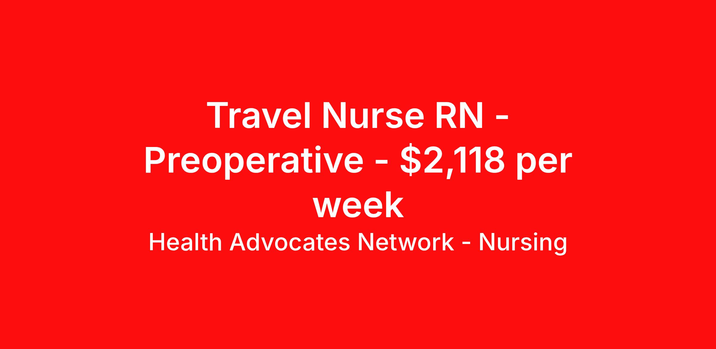 Health Advocates Network - Nursing is seeking a travel nurse RN Preoperative for a travel nursing job in Canton, Georgia. Job Description & Requirements Specialty: Preoperative Discipline: RN Start Date: 04/06/2026 Duration: 12 weeks 36 hours per week Shift: 12 hours Employment Type: Travel RN – Medical Surgical Registered Nurse - Health Advocates Network is urgently hiring Medical Surgical RNs with at least 2 years of recent experience! IMMEDIATE STARTS! Travel packages up to $2,118 weekly 8 hour DAY shifts available 13 week contracts available Specialty: Medical Surgical Registered Nurse (RN) Requirements: Active GA State or Compact Registered Nurse License if applicable Required AHA BLS. ACLS Graduate of an Accredited School of Nursing Additional certifications may be required Benefits We Offer: Competitive pay rates, Referral Bonus, Medical, Dental and Vision. Travel reimbursement and per diem allowances, Employee discounts, educational opportunities, and more! To apply for this job now or to find out more about other opportunities with Health Advocates Network, Inc. reply to this posting, contact us at or call/text . We can provide you unparalleled access to exciting career opportunities. Health Advocates Network, Inc . is an equal opportunity employer. All qualified applicants shall receive consideration for employment without regard to any legally protected basis protected by applicable federal or state law except where a bona fide occupational qualification applies. Refer a Registered Nurse for a $1,000.00 bonus opportunity! HANStaff Job ID 520183. Pay package is based on 12 hour shifts and 36 hours per week (subject to confirmation) with tax-free stipend amount to be determined. Posted job title: RN - Pre-Op About Health Advocates Network - Nursing Health Advocates Network was founded on the basis of a shared aspiration, to improve the way healthcare staffing is done. We are a company established and led by nurses. Our flexible approach enables us to develop solutions customized to your specific needs. From short- and long-term travel contracts to local and per diem assignments and more, we are here to get you to your next adventure! By solving challenges, providing the best placements, and advocating for you, we stand to help you thrive and pave the path forward in your career. Click on the videos below to learn more about our values!