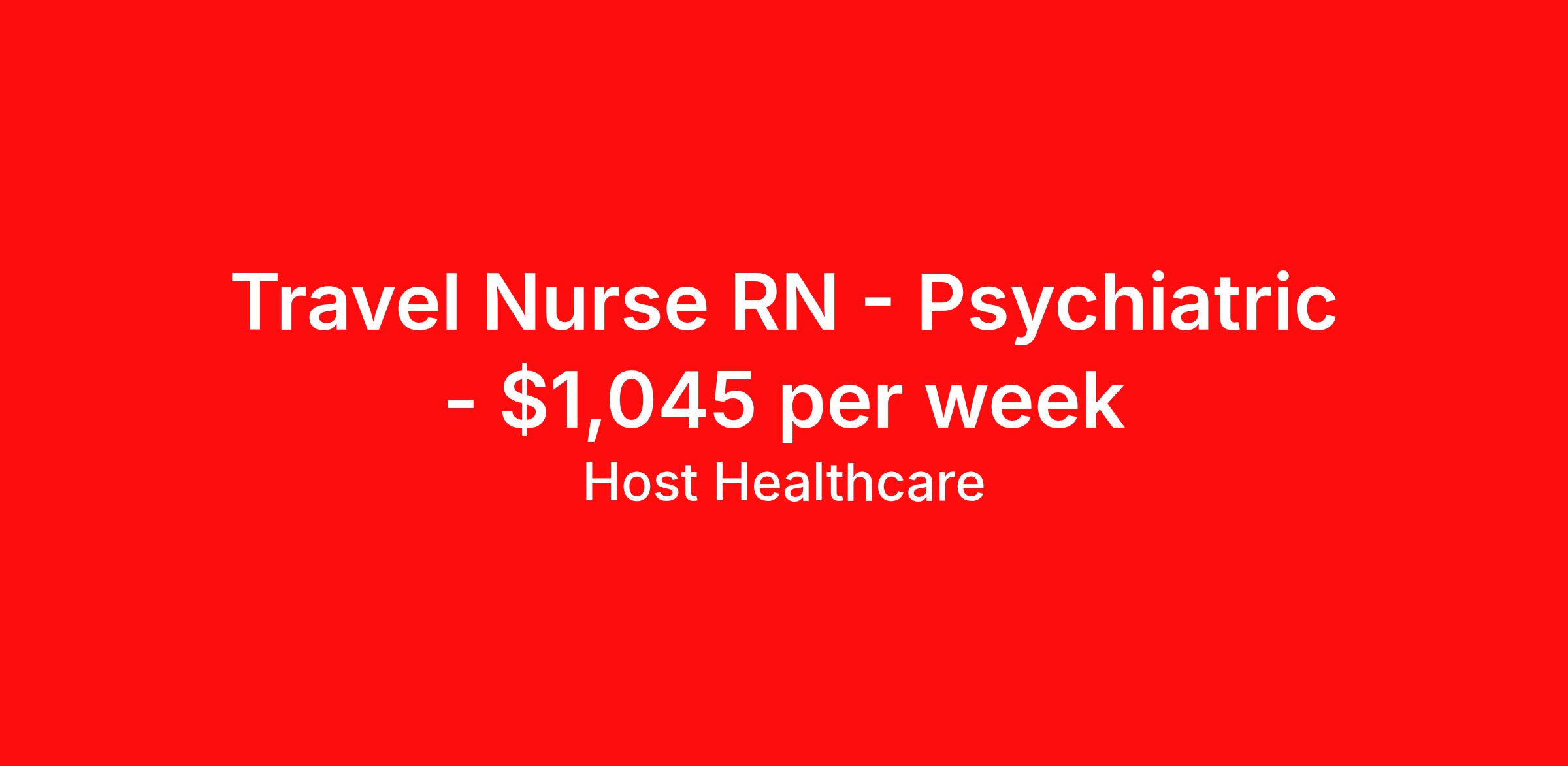 Host Healthcare is seeking a travel nurse RN Psychiatric for a travel nursing job in Danvers, Massachusetts. Job Description & Requirements Specialty: Psychiatric Discipline: RN Start Date: 03/23/2026 Duration: 13 weeks 40 hours per week Shift: 8 hours, nights Employment Type: Travel Host Healthcare Job ID a1fVX000002xSTlYAM. Pay package is based on 8 hour shifts and 40 hours per week (subject to confirmation) with tax-free stipend amount to be determined. Posted job title: RN - Psychiatry About Host Healthcare At Host Healthcare, we provide a truly comfortable experience as you explore your travel nursing, therapy, or allied career. We make your travel healthcare journey easy by taking care of all the details, so you don’t have to. We are on a mission to help others live better and we do this by helping the healers of the world be as comfortable as possible. With access to tens of thousands of travel nursing, therapy, and allied jobs in all 50 states, our responsive and friendly recruiters find your dream position based on what’s important to you. During your assignment, get access to premium benefits, including Day 1 medical that continues up to 30 days between assignments, 401K matching, travel reimbursements, dedicated housing support, and more. We also offer 24/7 support from our team and access to our on-staff clinicians so you can feel comfortable and confident throughout your entire assignment. Travel comfortably with Host Healthcare. Benefits Referral bonus School loan reimbursement Vision benefits Wellness and fitness programs Company provided housing options License and certification reimbursement Life insurance Medical benefits Mileage reimbursement Pet insurance Discount program Employee assistance programs Guaranteed Hours Health savings account Holiday Pay 401k retirement plan Continuing Education Dental benefits