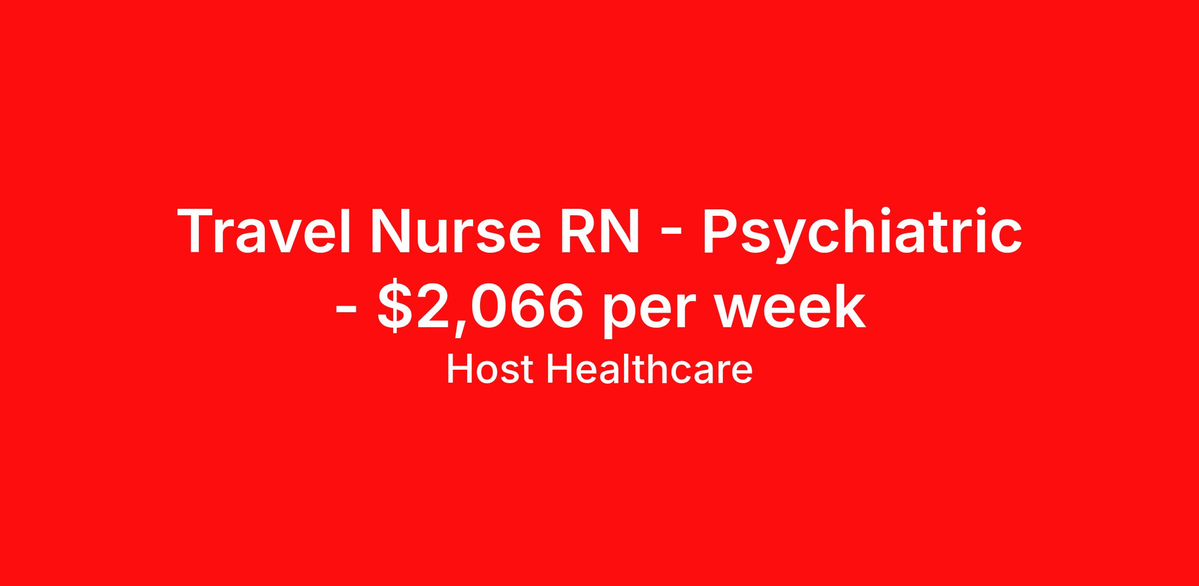 Host Healthcare is seeking a travel nurse RN Psychiatric for a travel nursing job in East Providence, Rhode Island. Job Description & Requirements Specialty: Psychiatric Discipline: RN Start Date: ASAP Duration: 13 weeks 36 hours per week Shift: 12 hours, days Employment Type: Travel Host Healthcare Job ID a1fVX000002vY3pYAE. Pay package is based on 12 hour shifts and 36 hours per week (subject to confirmation) with tax-free stipend amount to be determined. Posted job title: RN - Psychiatry About Host Healthcare At Host Healthcare, we provide a truly comfortable experience as you explore your travel nursing, therapy, or allied career. We make your travel healthcare journey easy by taking care of all the details, so you don’t have to. We are on a mission to help others live better and we do this by helping the healers of the world be as comfortable as possible. With access to tens of thousands of travel nursing, therapy, and allied jobs in all 50 states, our responsive and friendly recruiters find your dream position based on what’s important to you. During your assignment, get access to premium benefits, including Day 1 medical that continues up to 30 days between assignments, 401K matching, travel reimbursements, dedicated housing support, and more. We also offer 24/7 support from our team and access to our on-staff clinicians so you can feel comfortable and confident throughout your entire assignment. Travel comfortably with Host Healthcare. Benefits Referral bonus School loan reimbursement Vision benefits Wellness and fitness programs Company provided housing options License and certification reimbursement Life insurance Medical benefits Mileage reimbursement Pet insurance Discount program Employee assistance programs Guaranteed Hours Health savings account Holiday Pay 401k retirement plan Continuing Education Dental benefits