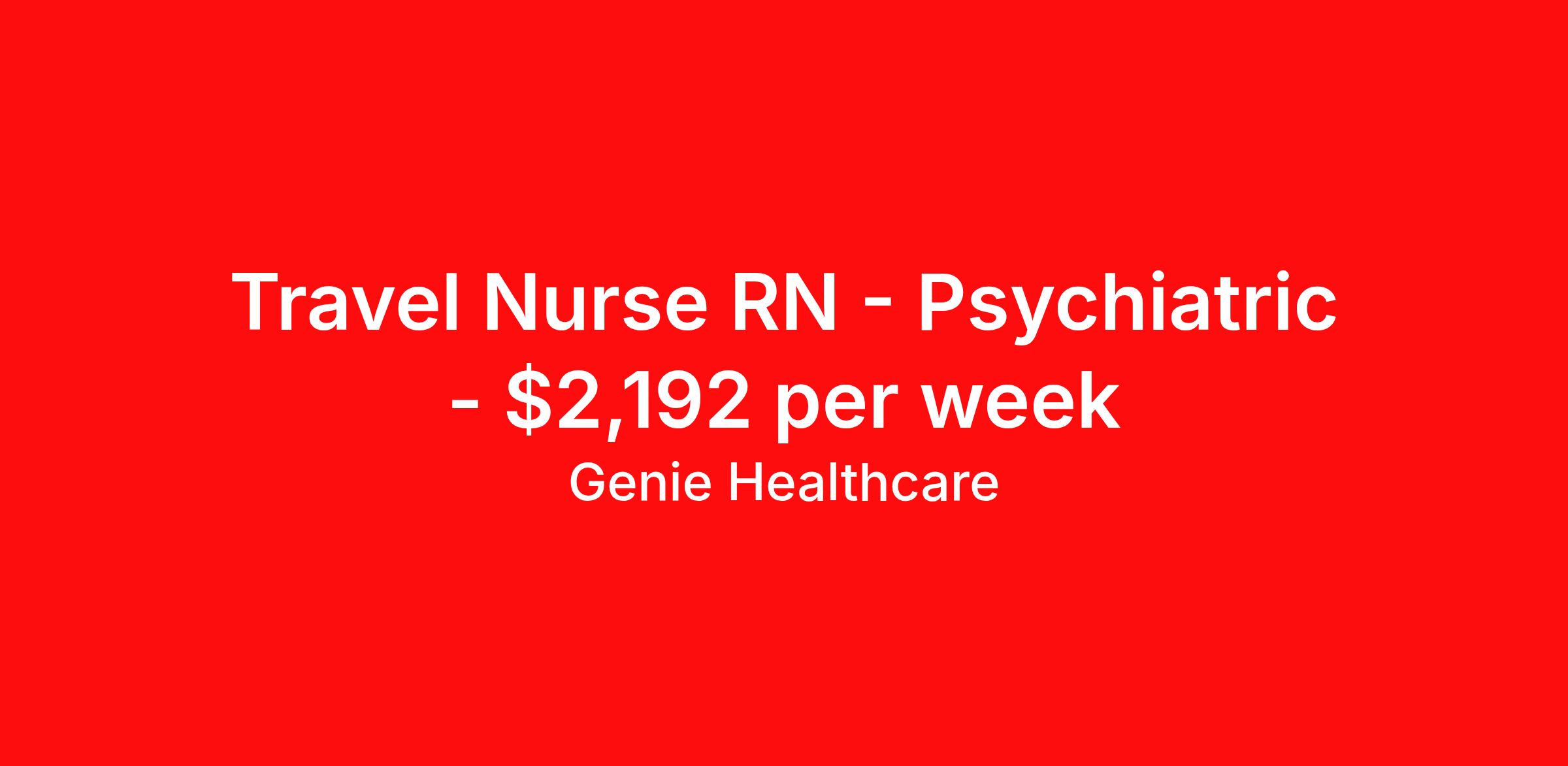 Genie Healthcare is seeking a travel nurse RN Psychiatric for a travel nursing job in Rapid City, South Dakota. Job Description & Requirements Specialty: Psychiatric Discipline: RN Start Date: 04/13/2026 Duration: 13 weeks 36 hours per week Shift: 12 hours, nights Employment Type: Travel Genie Healthcare is looking for a RN to work in Psychiatric for a 12.71 weeks travel assignment located in Rapid City, SD for the Shift (3x12 nights, 19:00:00-07:00:00, 12.00-3). Pay and benefits packages are estimated based on client bill rate at time the job was posted. These rates are subject to change. Exact pay and benefits vary based on several things, including, but not limited to, guaranteed hours, client changes in bill rate, experience, etc. Benefits: Medical Insurance, Dental Insurance, Vision Insurance, 401(k) with company matching (50% up to 6% of what you contribute) 362891 About Genie Healthcare Genie Healthcare is one of the fastest growing Nurse Travel Agencies in the USA. Genie serves hundreds of facilities and has over 4000 current travel RN contracts open at any given time. Genie provides travel RN’s flexibility, support, top pay scale, housing and the 1 rated, multi-state health insurance coverage. Genie Healthcare carries with it a commitment to providing a comprehensive level of service and quality care. Growing from a small team of eager recruiters to a company with satisfied clients in nearly every corner of the nation, delivering excellence in patient and customer care is the key to Genie’s success. The management team has 20 years of experience in workforce solutions and staffing in medical and non-medical fields, roles ranging from Clerical job to Cardiologist to software developer to CEO.