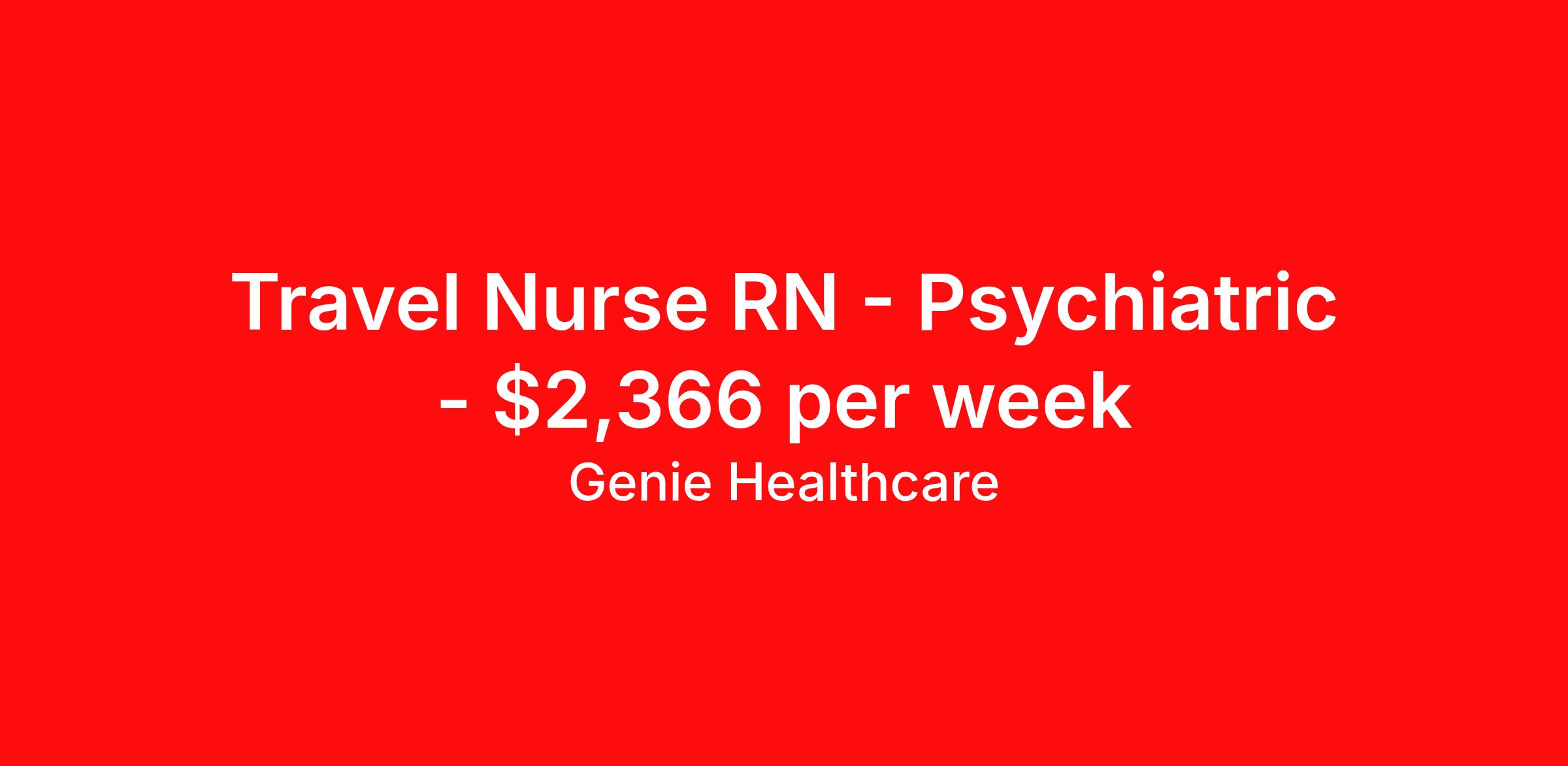 Genie Healthcare is seeking a travel nurse RN Psychiatric for a travel nursing job in Las Vegas, New Mexico. Job Description & Requirements Specialty: Psychiatric Discipline: RN Start Date: 04/20/2026 Duration: 11 weeks 40 hours per week Shift: 8 hours, nights Employment Type: Travel Genie Healthcare is looking for a RN to work in Psychiatric for a 10.86 weeks travel assignment located in Las Vegas, NM for the Shift (5x8hr nights-Please verify shift details with recruiter, 23:00:00-07:00:00, 8.00-5). Pay and benefits packages are estimated based on client bill rate at time the job was posted. These rates are subject to change. Exact pay and benefits vary based on several things, including, but not limited to, guaranteed hours, client changes in bill rate, experience, etc. Benefits: Medical Insurance, Dental Insurance, Vision Insurance, 401(k) with company matching (50% up to 6% of what you contribute) Genie Healthcare Job ID 17964885. Pay package is based on 8 hour shifts and 40.0 hours per week (subject to confirmation) with tax-free stipend amount to be determined. Posted job title: RN:Psychiatric,23:00:00-07:00:00 About Genie Healthcare Genie Healthcare is one of the fastest growing Nurse Travel Agencies in the USA. Genie serves hundreds of facilities and has over 4000 current travel RN contracts open at any given time. Genie provides travel RN’s flexibility, support, top pay scale, housing and the 1 rated, multi-state health insurance coverage. Genie Healthcare carries with it a commitment to providing a comprehensive level of service and quality care. Growing from a small team of eager recruiters to a company with satisfied clients in nearly every corner of the nation, delivering excellence in patient and customer care is the key to Genie’s success. The management team has 20 years of experience in workforce solutions and staffing in medical and non-medical fields, roles ranging from Clerical job to Cardiologist to software developer to CEO.