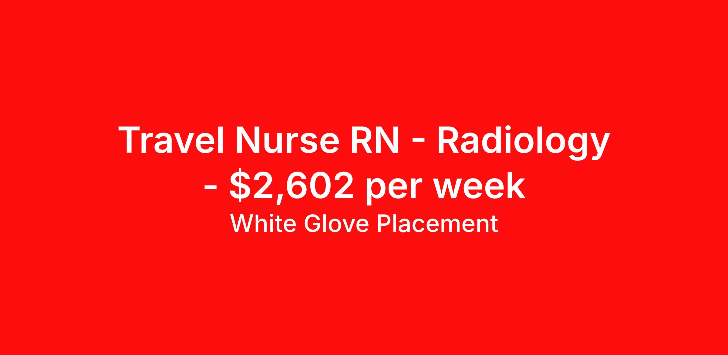 White Glove Placement is seeking a travel nurse RN Radiology for a travel nursing job in Glens Falls, New York. Job Description & Requirements Specialty: Radiology Discipline: RN Start Date: 04/16/2026 Duration: 13 weeks 40 hours per week Shift: 10 hours, days Employment Type: Travel White Glove Placement Job ID 348376. Pay package is based on 10 hour shifts and 40 hours per week (subject to confirmation) with tax-free stipend amount to be determined. About White Glove Placement White Glove Placement, Inc., recruits nurses for some of the most sought-after travel nursing jobs at hospitals, nursing homes, schools, clinics, correctional facilities, group homes, homecare and more. If you enjoy traveling and new experiences, you will have the opportunity to expand your horizons as a White Glove travel nurse for one of the best travel nursing companies. Your cultural repertoire will be enhanced by the nuances and diversity of New York and the Northeast. In addition, you will have access to an array of recreational activities that may include visiting historic landmarks, majestic skyscrapers, Broadway plays, exotic cuisines and multiple entertainment venues. Trust the best travel nursing agency to find the perfect position for you. Live your best professional life with the best travel nursing jobs, with the best salary, in exciting and exotic places. Benefits Weekly pay Company provided housing options Sick pay Wellness and fitness programs Referral bonus Medical benefits Dental benefits