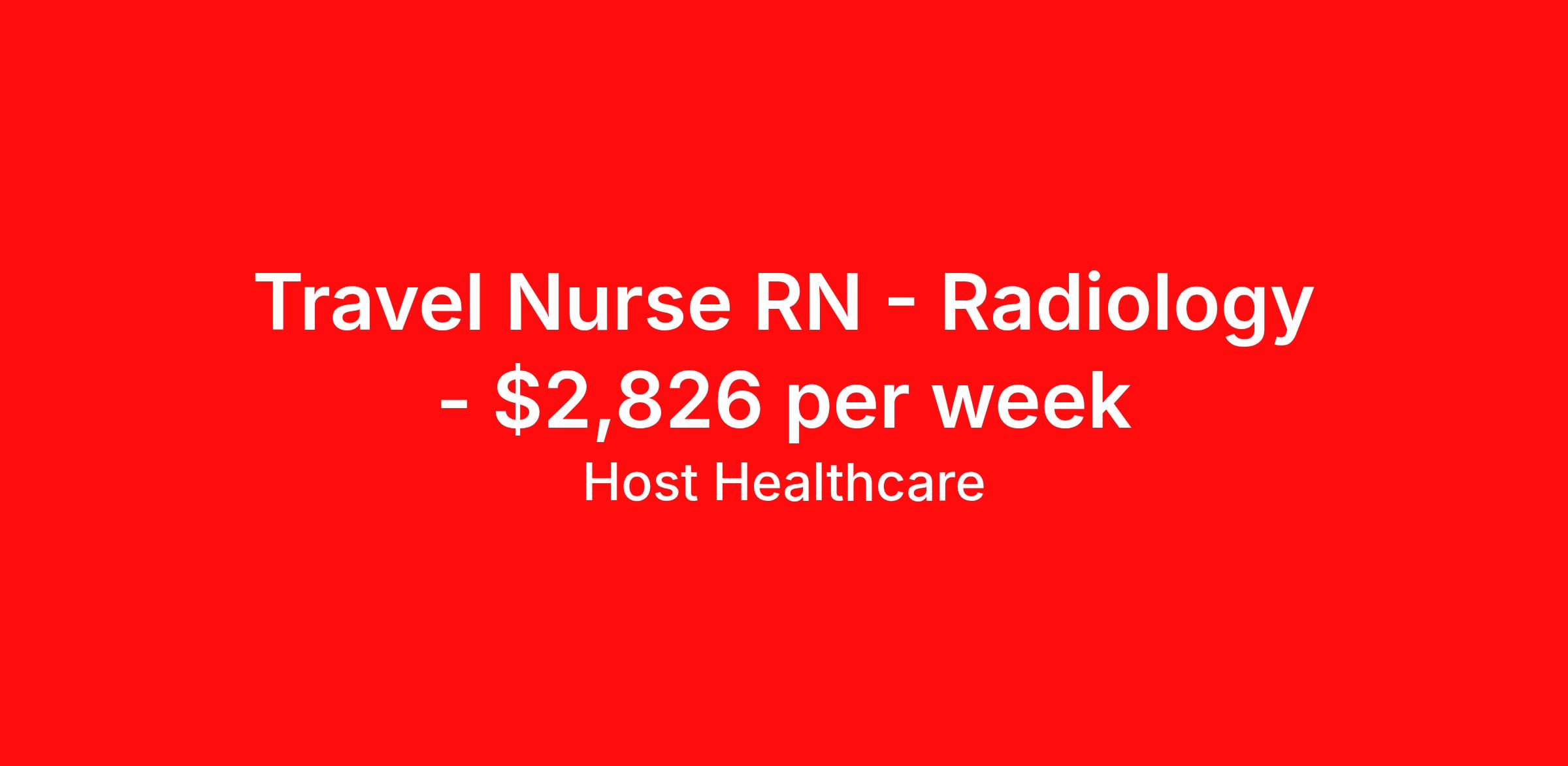 Host Healthcare is seeking a travel nurse RN Radiology for a travel nursing job in Rochester, New York. Job Description & Requirements Specialty: Radiology Discipline: RN Start Date: 05/11/2026 Duration: 13 weeks 40 hours per week Shift: 8 hours, days, evenings, nights Employment Type: Travel Host Healthcare Job ID a1fVX000002zRyDYAU. Pay package is based on 8 hour shifts and 40 hours per week (subject to confirmation) with tax-free stipend amount to be determined. Posted job title: RN - Radiology About Host Healthcare At Host Healthcare, we provide a truly comfortable experience as you explore your travel nursing, therapy, or allied career. We make your travel healthcare journey easy by taking care of all the details, so you don’t have to. We are on a mission to help others live better and we do this by helping the healers of the world be as comfortable as possible. With access to tens of thousands of travel nursing, therapy, and allied jobs in all 50 states, our responsive and friendly recruiters find your dream position based on what’s important to you. During your assignment, get access to premium benefits, including Day 1 medical that continues up to 30 days between assignments, 401K matching, travel reimbursements, dedicated housing support, and more. We also offer 24/7 support from our team and access to our on-staff clinicians so you can feel comfortable and confident throughout your entire assignment. Travel comfortably with Host Healthcare. Benefits Referral bonus School loan reimbursement Vision benefits Wellness and fitness programs Company provided housing options License and certification reimbursement Life insurance Medical benefits Mileage reimbursement Pet insurance Discount program Employee assistance programs Guaranteed Hours Health savings account Holiday Pay 401k retirement plan Continuing Education Dental benefits