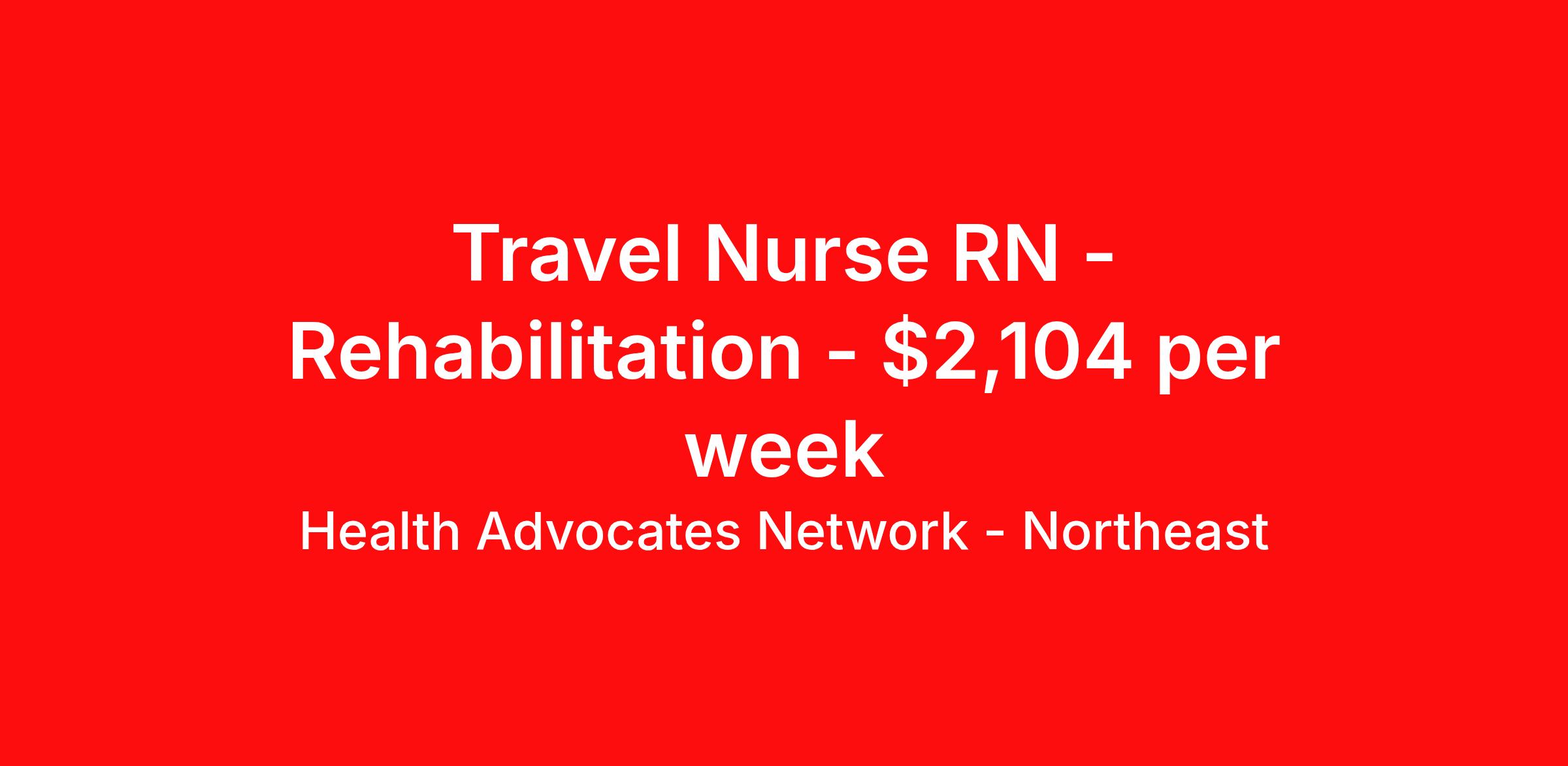 Health Advocates Network - Northeast is seeking a travel nurse RN Rehabilitation for a travel nursing job in Penn Yan, New York. Job Description & Requirements Specialty: Rehabilitation Discipline: RN Start Date: 04/13/2026 Duration: 13 weeks 36 hours per week Shift: 12 hours, nights Employment Type: Travel Health Advocates Network is urgently hiring Registered Nurses (RNs) - Emergency Room in the Penn Yan, NY area. Must have 2 years of Emergency Room experience. Pay Rate: $2,104 weekly Specialty: Registered Nurse (RN) - Emergency Room Shift: Night 14 Week Contracts and more available! Radius Rule: 30 mile radius applies Qualification and Requirements: Authorized to work in the United States. Graduate of an Accredited School of Nursing 2 years of experience as a Registered Nurse (RN) - Emergency Room American Heart Association BLS, ACLS, PALS, NIHSS An active, current (NY) state license Apply for this job now or to find out more about other opportunities with Health Advocates Network, Inc. reply to this posting, contact us at or call/text . We can provide you unparalleled access to exciting career opportunities. Benefits We Offer: Competitive pay rates, Referral Bonus, Medical, Dental, Vision and 401k. Travel reimbursement and per diem allowances, Employee discounts, educational opportunities, and more! Who We Are: Health Advocates Network matches highly skilled applicants to positions at the best healthcare companies on a temporary and temporary-to-hire basis. Our mission is to provide you with a rewarding job that is well-matched to your skills – helping you advance in your career. Our experience, combined with our client relationships, makes Health Advocates Network a great resource for your career. Health Advocates Network, Inc. is an equal-opportunity employer. All qualified applicants shall receive consideration for employment without regard to any legally protected basis protected by applicable federal or state law except where a bona fide occupational qualification applies. Refer a Registered Nurse for a $1000.00 bonus opportunity! HANStaff Northeast Job ID 523432. Pay package is based on 12 hour shifts and 36 hours per week (subject to confirmation) with tax-free stipend amount to be determined. Posted job title: RN - Rehab About Health Advocates Network - Northeast Health Advocates Network was founded on the basis of a shared aspiration, to improve the way healthcare staffing is done. We are a company established and led by nurses. Our flexible approach enables us to develop solutions customized to your specific needs. From short- and long-term travel contracts to local and per diem assignments and more, we are here to get you to your next adventure! By solving challenges, providing the best placements, and advocating for you, we stand to help you thrive and pave the path forward in your career. Benefits 401k retirement plan