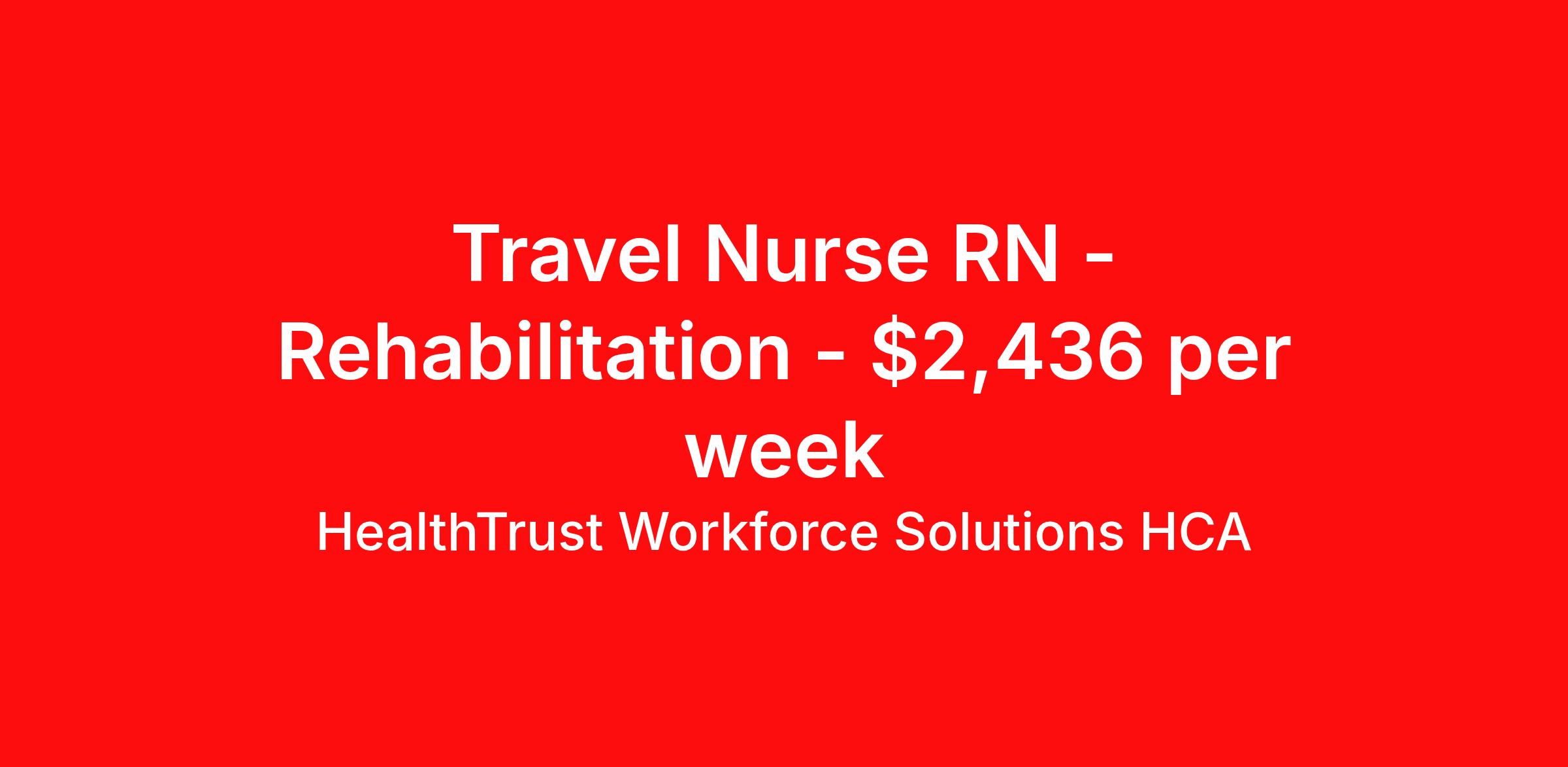HealthTrust Workforce Solutions HCA is seeking a travel nurse RN Rehabilitation for a travel nursing job in Rochester, New Hampshire. Job Description & Requirements Specialty: Rehabilitation Discipline: RN Duration: 13 weeks 36 hours per week Shift: 12 hours, nights Employment Type: Travel Number of Beds – 19 · Number of Staff – 6:1 ratio depending on patient census · o Night Shift – · Patient Ratios – 6:1 · Type of equipment – mechanical lift, sara steady, Baxter pumps, Kangaroo pumps, · EMR – Meditech Must have : candidates without these skills will not be considered for the role. · Rehab / med surg · IV experience Preferred or nice to have : candidates with these skills will be considered first. · Wound care · Stoke · TBI · Best personality Fit: · Flexible, Kind, through, REQUIRED CERTIFICATIONS: · BLS Floating Area(s): · CCU, Med Surg, ER Weekends and On call (if any): · Every other weekend About HealthTrust Workforce Solutions HCA At HealthTrust Workforce Solutions, healthcare is not just about the four walls of a facility but about the people who provide and receive care. Our focus is on empowering healthcare professionals to deliver exceptional patient experiences by providing them with the necessary skills, tools, and support. We partner with healthcare facilities nationwide to ensure that the right professionals are in the right roles. We prioritize our clinicians by giving them a voice and access to opportunities to fulfill their mission of improving lives by providing quality patient care. We are committed to our core values of Trust, Innovation, Adaptability, Courage, and Accountability. We are dedicated to positively impacting the healthcare industry by providing first-priority access to more than 200,000 jobs nationwide to our healthcare professionals. Join us and be part of the HealthTrust family, where you can make a difference every day. We embrace our changing environment, and we maintain a culture that has a rich tradition of transforming itself to meet the challenges of the future. MISSION STATEMENT While putting great people in the right roles is essential, our mission is far greater. We want our clinicians to be part of the HealthTrust family, where healthcare professionals have a voice and are empowered with the right tools and opportunities to fulfill their personal mission of improving lives. Plus, as a preferred partner to thousands of top-performing hospitals, we provide our healthcare professionals with first-priority access to more than 200,000 jobs nationwide. Benefits Dental benefits Vision benefits Referral bonus Continuing Education Life insurance