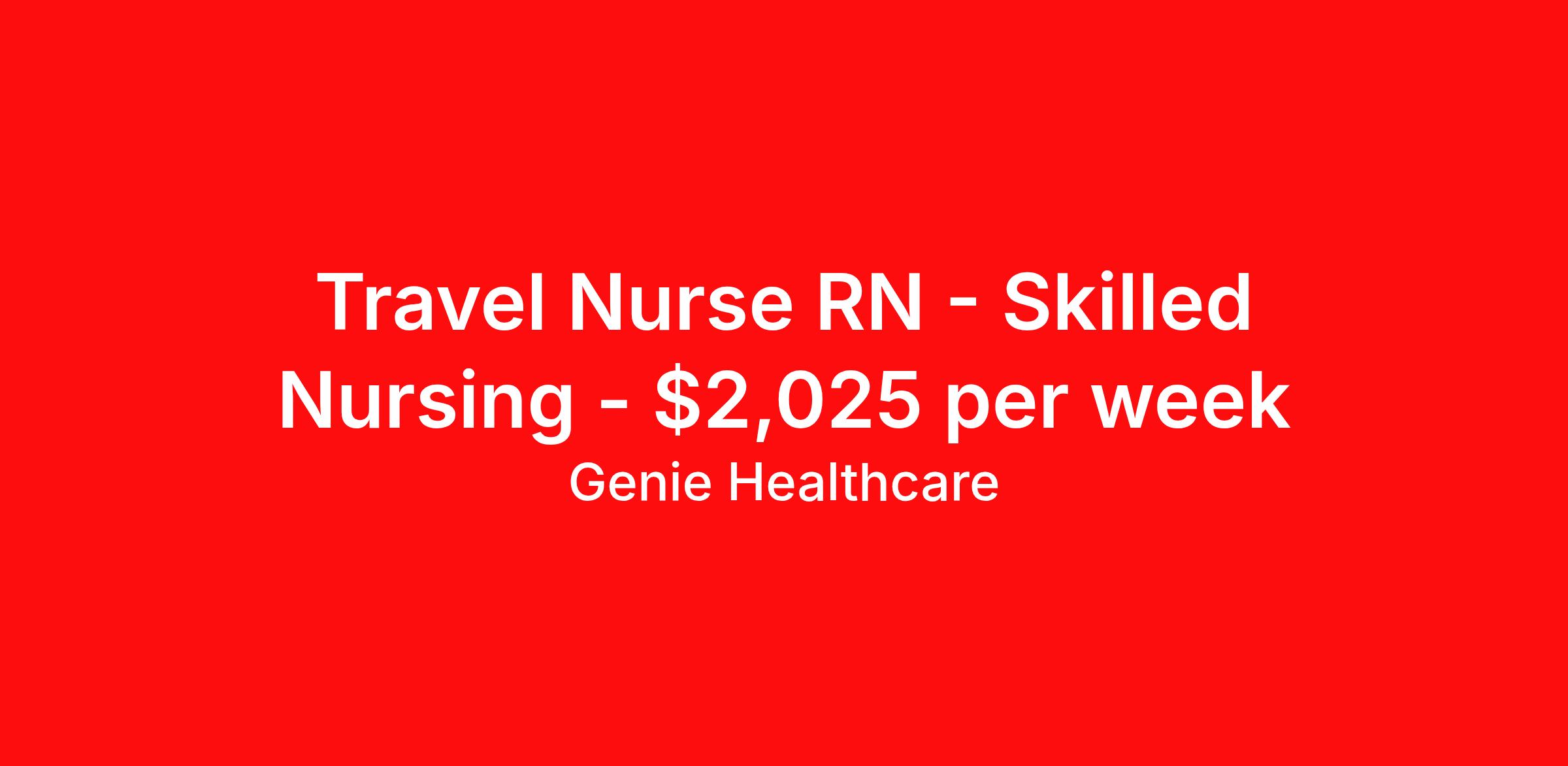 Genie Healthcare is seeking a travel nurse RN Skilled Nursing for a travel nursing job in Susquehanna, Pennsylvania. Job Description & Requirements Specialty: Skilled Nursing Discipline: RN Duration: 13 weeks 37.5 hours per week Shift: 8 hours, days, evenings Employment Type: Travel Shift: 3:00 PM – 11:00 PM (Primary) with occasional 7:00 AM – 3:00 PM coverage Hours: 37.5 hours per week Weekend Requirement: Every Other Weekend (EOW) Contract Length: 13 weeks About Genie Healthcare Genie Healthcare is one of the fastest growing Nurse Travel Agencies in the USA. Genie serves hundreds of facilities and has over 4000 current travel RN contracts open at any given time. Genie provides travel RN’s flexibility, support, top pay scale, housing and the 1 rated, multi-state health insurance coverage. Genie Healthcare carries with it a commitment to providing a comprehensive level of service and quality care. Growing from a small team of eager recruiters to a company with satisfied clients in nearly every corner of the nation, delivering excellence in patient and customer care is the key to Genie’s success. The management team has 20 years of experience in workforce solutions and staffing in medical and non-medical fields, roles ranging from Clerical job to Cardiologist to software developer to CEO.