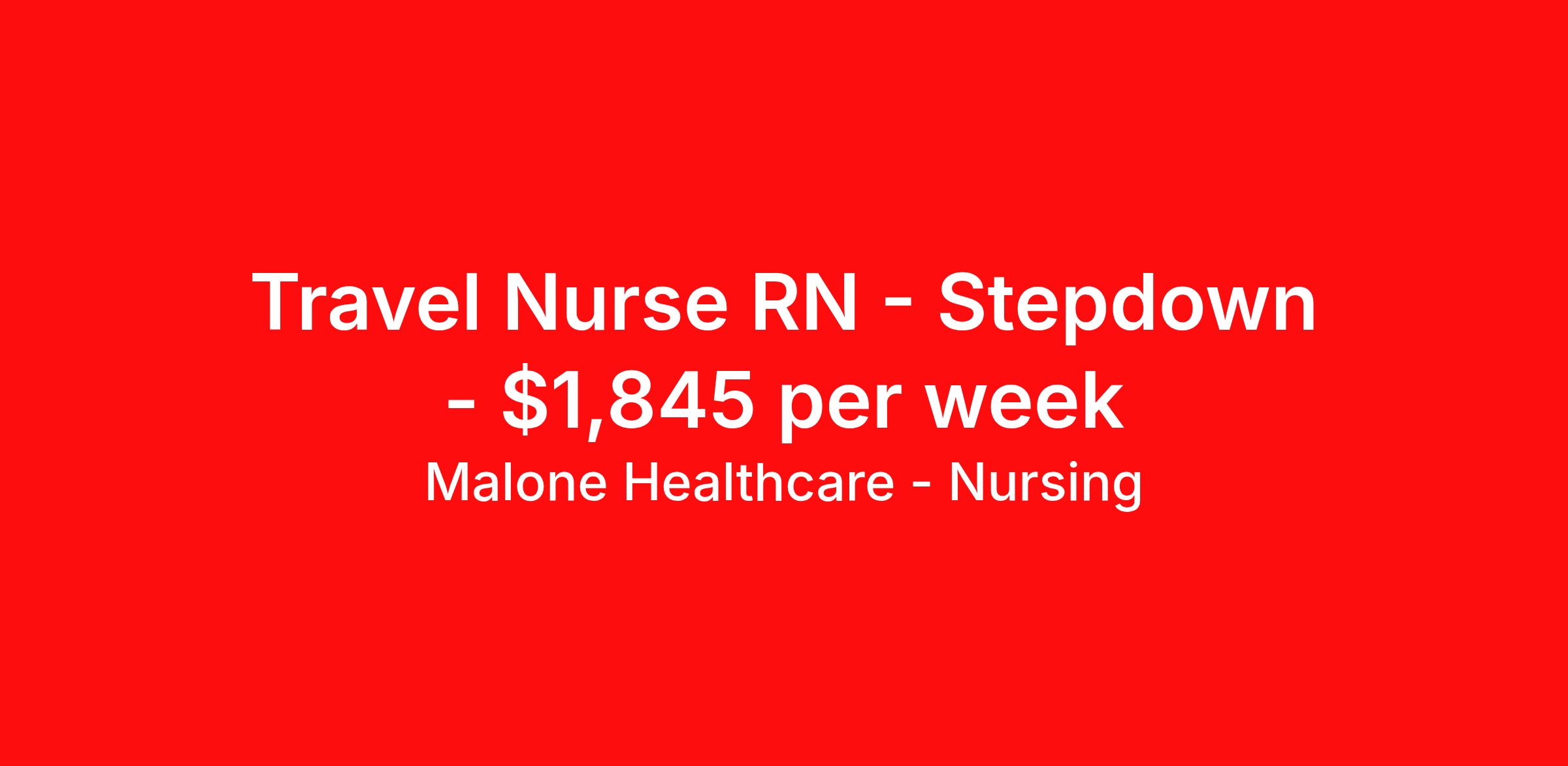 Malone Healthcare - Nursing is seeking a travel nurse RN Stepdown for a travel nursing job in Kansas City, Kansas. Job Description & Requirements Specialty: Stepdown Discipline: RN Start Date: 03/30/2026 Duration: 13 weeks 36 hours per week Shift: 12 hours, nights Employment Type: Travel RN night position in stepdown unit. About Malone Healthcare - Nursing With a commitment to providing a higher standard of service and experience in patient care, Malone Healthcare places expert nurses and allied health professionals in rewarding careers throughout the United States. As a leading healthcare staffing agency, Malone’s focus on compliance and integrity translates to a seamless experience for our team members and partner facilities. When you work with Malone Healthcare, you can rely on over 50 years of proven experience placing exceptional professionals in quality healthcare settings. Benefits Weekly pay Holiday Pay Guaranteed Hours Continuing Education 401k retirement plan Pet insurance Referral bonus Medical benefits Dental benefits Vision benefits License and certification reimbursement Life insurance