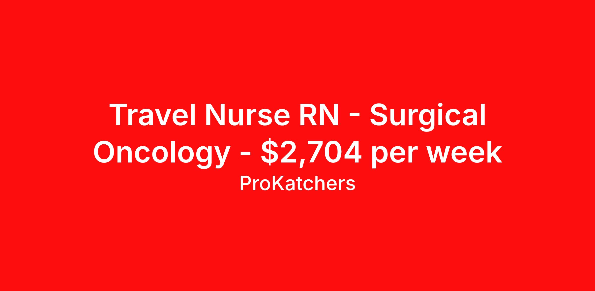 ProKatchers is seeking a travel nurse RN Surgical Oncology for a travel nursing job in Oklahoma City, Oklahoma. Job Description & Requirements Specialty: Surgical Oncology Discipline: RN Start Date: 03/30/2026 Duration: 13 weeks 36 hours per week Shift: 12 hours, nights Employment Type: Travel Skills: Required Skills & Experience: -1 year of experience. -Knowledge of professional nursing theory, practices, techniques and procedures. -Ability to organize, plan, coordinate and evaluate nursing services and apply nursing techniques. -Ability to maintain good working relationships with other employees. -Good verbal and written communication skills. -Ability to respond effectively to cultural and language needs of patients and visitors. -Some computer skills. Preferred Skills & Experience: -N/A Education: Required Education: -Associate's Degree in Nursing from an accredited program. Preferred Education: -Bachelor of Science (or higher) in Nursing Board Approved Program. Required Certifications & Licensure: -Current RN License issued by the Oklahoma State Board of Nursing, or a current multistate compact RN License (eNLC). -Current Basic Life Support issued by the American Heart Association. -ACLS (American Heart Association). Preferred Certifications & Licensure: -N/A Schedule Notes: Stepdown AND Medsurg ONS/ONCC required ProKatchers Job ID 37035870. Pay package is based on 12 hour shifts and 36 hours per week (subject to confirmation) with tax-free stipend amount to be determined. Posted job title: RN Oncology - Surgical - FS About ProKatchers Founded in 2016, ProKatchers Inc. is a JCC-certified organization and a recognized leader in healthcare staffing. Named one of the Fastest Growing Healthcare Staffing Firms by Staffing Industry Analysts (SIA) for 2023–2024, we are proud to be among the top-rated companies in our industry. At ProKatchers, we offer both short- and long-term contracts, as well as travel opportunities for licensed and experienced healthcare professionals across the United States. We are committed to providing industry-leading benefits and personalized career support. We understand that finding the right fit is about more than just a job—it’s about aligning your career with your lifestyle. That’s why our dedicated team of career specialists takes the time to get to know you and match you with assignments that meet your goals and aspirations. ProKatchers has also been recognized by SIA as one of the Best Staffing Firms to Work For—a testament to our employee-first approach. We specialize in placing clinical and allied health professionals in a wide range of healthcare settings, including acute care hospitals, skilled nursing facilities, long-term care centres, rehabilitation facilities, behavioural health canters, home and community health programs, urgent care clinics, and more.
