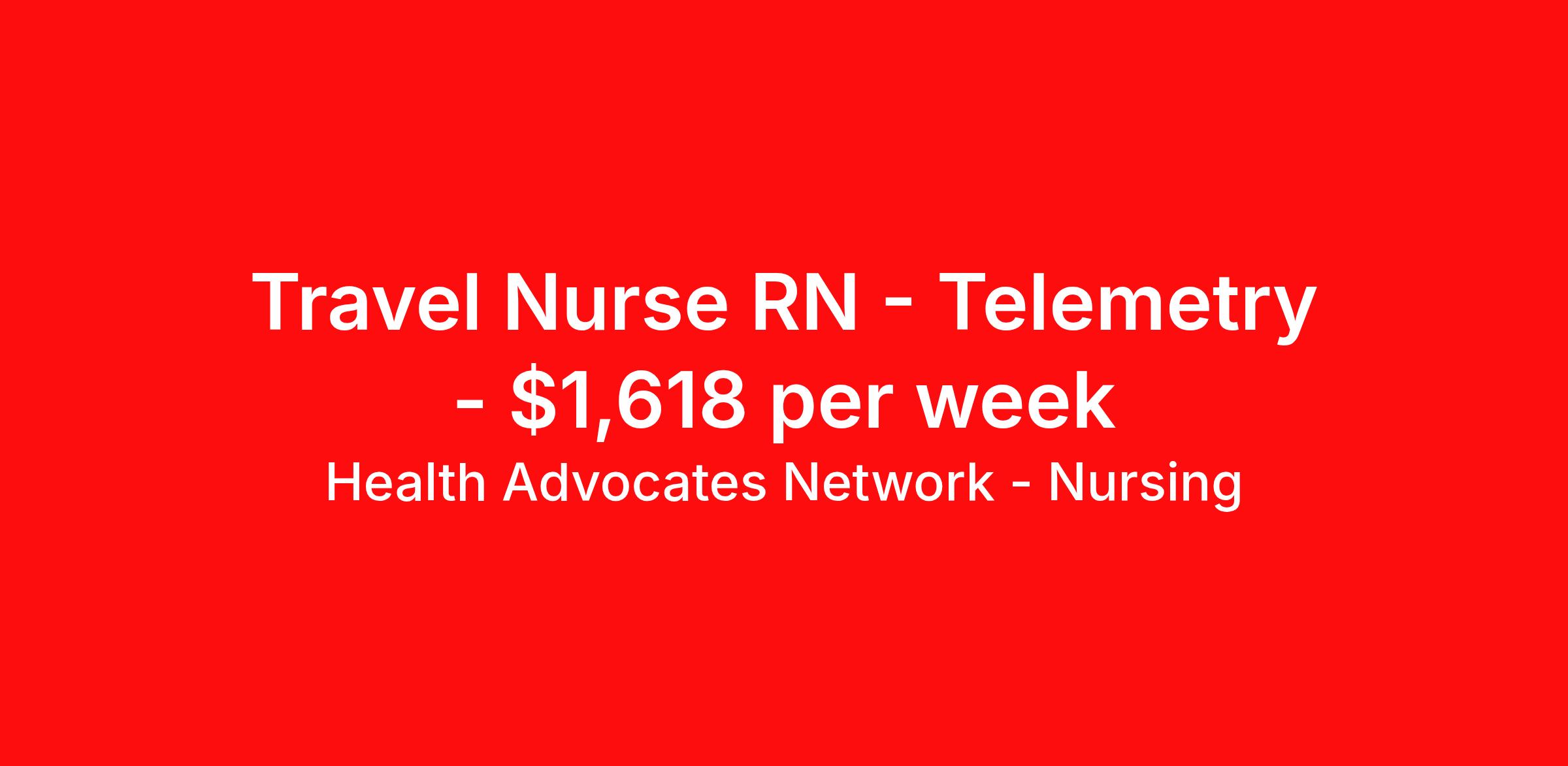 Health Advocates Network - Nursing is seeking a travel nurse RN Telemetry for a travel nursing job in Corpus Christi, Texas. Job Description & Requirements Specialty: Telemetry Discipline: RN Start Date: ASAP Duration: 13 weeks 36 hours per week Shift: 12 hours, nights Employment Type: Travel RN – Telemetry Registered Nurse - Health Advocates Network is urgently hiring Telemetry RNs with at least 2 years of recent experience! IMMEDIATE STARTS! Travel packages up to $1,618 weekly 12HR NIGHT shifts available 13 week contracts available Specialty: Telemetry Registered Nurse (RN) Requirements: Active TX State or Compact Registered Nurse License if applicable Valid BLS Graduate of an Accredited School of Nursing Additional certifications may be required Benefits We Offer: Competitive pay rates, Referral Bonus, Medical, Dental and Vision. Travel reimbursement and per diem allowances, Employee discounts, educational opportunities, and more! To apply for this job now or to find out more about other opportunities with Health Advocates Network, Inc. reply to this posting, contact us at or call/text . We can provide you unparalleled access to exciting career opportunities. Health Advocates Network, Inc . is an equal opportunity employer. All qualified applicants shall receive consideration for employment without regard to any legally protected basis protected by applicable federal or state law except where a bona fide occupational qualification applies. Refer a Registered Nurse for a $1,000.00 bonus opportunity! HANStaff Job ID 496830. Pay package is based on 12 hour shifts and 36 hours per week (subject to confirmation) with tax-free stipend amount to be determined. Posted job title: RN - Tele About Health Advocates Network - Nursing Health Advocates Network was founded on the basis of a shared aspiration, to improve the way healthcare staffing is done. We are a company established and led by nurses. Our flexible approach enables us to develop solutions customized to your specific needs. From short- and long-term travel contracts to local and per diem assignments and more, we are here to get you to your next adventure! By solving challenges, providing the best placements, and advocating for you, we stand to help you thrive and pave the path forward in your career. Click on the videos below to learn more about our values!