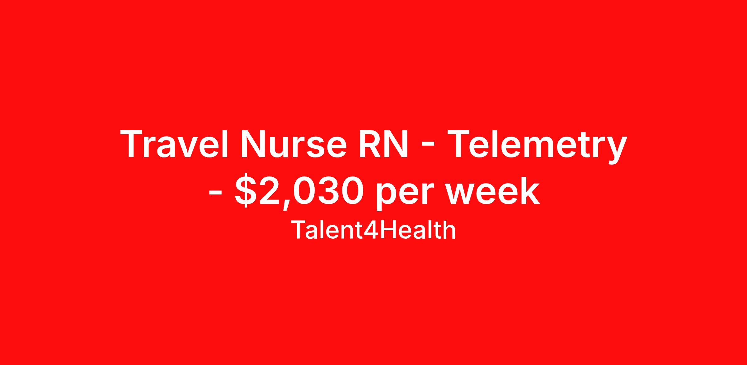 Talent4Health is seeking a travel nurse RN Telemetry for a travel nursing job in Glendale, California. Job Description & Requirements Specialty: Telemetry Discipline: RN Start Date: 04/06/2026 Duration: 14 weeks 36 hours per week Shift: 12 hours, nights Employment Type: Travel RN-Tele Auto Offer Night Shift 36-48 hours/week Referral Bonus: $250-$500 (each referral) Medical and other Benefits Apply Now About Talent4Health A leader and innovator, offering comprehensive talent solutions for the healthcare industry across the nation. Talent4Health, based in Wilmington, DE is a one stop solution that offers access to an inclusive network of excellent healthcare professionals through its state-of-the-art recruitment strategies and extensive career opportunities. We have successfully placed over 3000 plus clinicians with the topmost healthcare facilities across 50 states in the US. With countless prestigious clients under our umbrella, backed up by passionate and hard-working recruiters, we are a team you have been looking for! Why Choose us? When it comes to choosing a recruitment agency, it’s imperative to consider what all they have to offer. Proficiency : Our seasoned team of professionals has years of experience and we are dedicated to provide the highest quality service to our clients and candidates. Personalized service : We understand that every candidate is unique, and we work closely with each one to develop a customized plan that meets their specific needs. Consistency : We are devoted to offer dependable recruitment solutions for our candidates, and we are always a phone call away for all their questions or concerns. Comprehensive care : Our healthcare recruitment team works for different specialties, so there is a job for everyone. If this is all that excites you, do visit http://www.talent4health.com today!