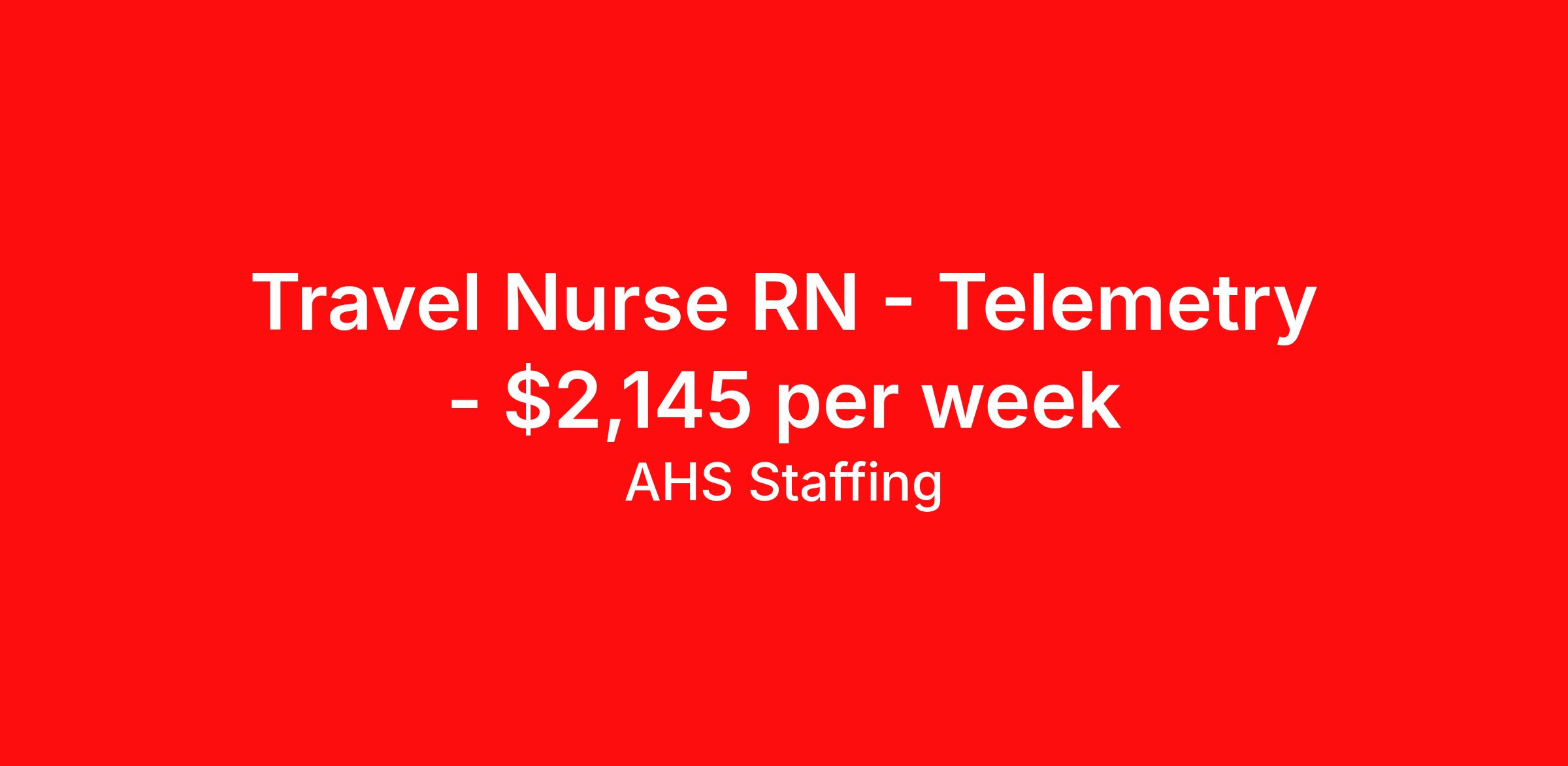AHS Staffing is seeking a travel nurse RN Telemetry for a travel nursing job in Hartford, Connecticut. Job Description & Requirements Specialty: Telemetry Discipline: RN Start Date: 04/06/2026 Duration: 12 weeks 36 hours per week Shift: 12 hours, nights Employment Type: Travel AHS Staffing is looking for a Telemetry Registered Nurse in Hartford, CT for a Long Term (Travel) position. This assignment is expected to last 13 weeks. Apply today to speak with a recruiter about the position! AHS Job ID 2372937. Posted job title: Registered Nurse Telemetry About AHS Staffing At AHS Staffing, we are committed to providing a personalized, transparent, and rewarding experience. We go beyond the transactional nature of the industry by offering individualized job matching, clear communication, no-nonsense pay rates, and dedicated recruiter support 24/7. When you're on assignment with us, you'll get access to industry-leading benefits, including comprehensive medical coverage, 401(k) matching, competitive pay packages, licensure reimbursement, weekly pay, and more. Easily manage your day-to-day with our mobile app where you can view your assignment details, manage your compliance and licensing documents, submit timecards, and browse new jobs to land your next adventure. As a nationally recognized and award-winning agency, we understand the importance of providing a seamless experience from application to placement. Our top priority is matching you with assignments that align with both your personal and professional goals. Join us to experience working with an agency that truly prioritizes your success and well-being and see why thousands of healthcare professionals continue to trust us with their careers.