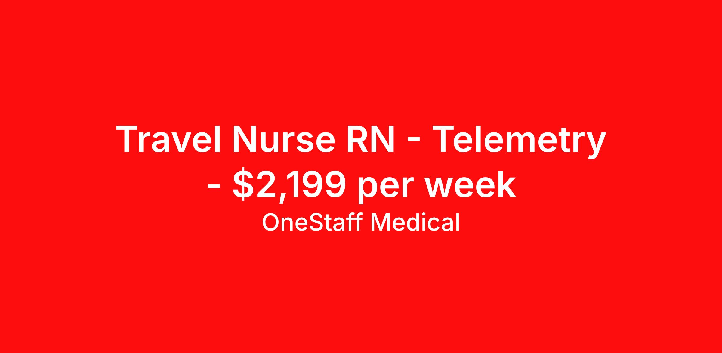 OneStaff Medical is seeking a travel nurse RN Telemetry for a travel nursing job in South Charleston, West Virginia. Job Description & Requirements Specialty: Telemetry Discipline: RN Start Date: 04/06/2026 Duration: 13 weeks 36 hours per week Shift: 12 hours, days Employment Type: Travel Telemetry, Observation 3x12 hour day shift. every other weekend requirement. 1:6 ratio. BLS ACLS Trachs, not vented Experience Med surg/Tele, Critical Drips/Trach care required. Peritoneal Dialysis preferred. Med Surg tele nurse with good cardiac background preferred. Must have previous travel experience. About OneStaff Medical You deserve a partner that is working for you. Be bold and let us do just that. We’ll take care of you while you are away from your own “home base” in every way we can, and ideally do more than you expect. Your team at OneStaff is dedicated to finding the perfect assignments (for you), negotiate the best rates and handles any issues that may arise while you are on assignment. We take great pride in building relationships with our traveling professionals and we enjoy hearing about your experiences. Whatever the need, we are here to help along the journey. We understand you are the heart and soul of what we are. Whether it is housing, payroll, travel, benefits, or just a friendly voice to talk to, we are there every step of the way. The company you choose is the most important decision you will make in your traveling career. We get that, so we’re committed to you 24 hours-a-day, 7 days-a-week. We’re your “one” solution in travel assignments and here to assist whether helping with accelerating your trajectory towards your career goals or meeting your travel requirements. Benefits Weekly pay Holiday Pay Guaranteed Hours 401k retirement plan Pet insurance Company provided housing options Sick pay Wellness and fitness programs Referral bonus Medical benefits Dental benefits Vision benefits