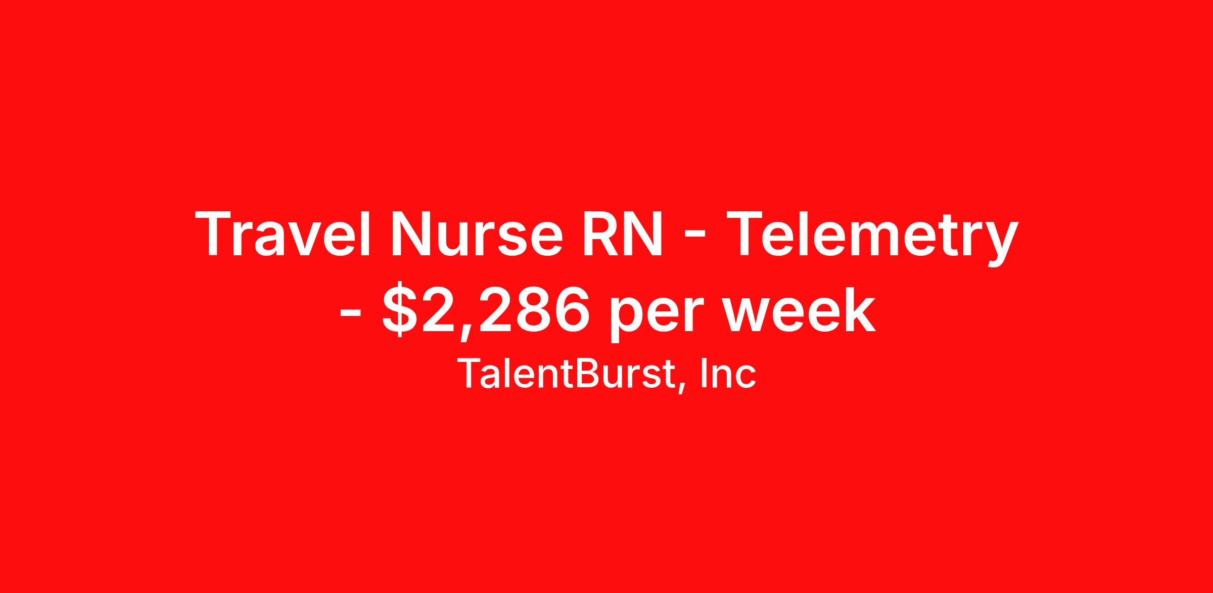 TalentBurst, Inc is seeking a travel nurse RN Telemetry for a travel nursing job in Alexandria, Louisiana. Job Description & Requirements Specialty: Telemetry Discipline: RN Start Date: 04/13/2026 Duration: 13 weeks 36 hours per week Shift: 12 hours, days Employment Type: Travel SHIFT: DAYS 7AM - 7PM START: ASAP REQUIRED Licenses, Registrations, or Certifications BLS certification from AHA required ACLS certification from AHA required RN License in state of employment or compact Type of patients on the unit: Cardiac and Telemetry Is not Stepdown unit Temp to perm is a possibility 2 OPENINGS Weekend Requirement Every other weekend On Call Requirement No call Floating Requirement / Locations Floating if needed Nurse / Patient Ratio 5:1-6:1 depending on staffing About TalentBurst, Inc TalentBurst Health & Life Sciences is an established provider of healthcare workforce solutions, servicing healthcare facilities across the United States for over 15 years. As a Joint Commission Certified Agency, our commitment to quality, integrity, and exceptional service has made us a trusted name in the healthcare staffing landscape. Our mission is to bridge the gap between healthcare professionals seeking fulfilling opportunities and healthcare organizations striving to maintain their high standards of care. We are committed to providing top-notch healthcare professionals with access to facilities where they can focus on delivering exceptional patient care and thrive. Whether you're a nurse, allied health professional, or administrative personnel, we have the expertise to match your skills and aspirations with the perfect placement.