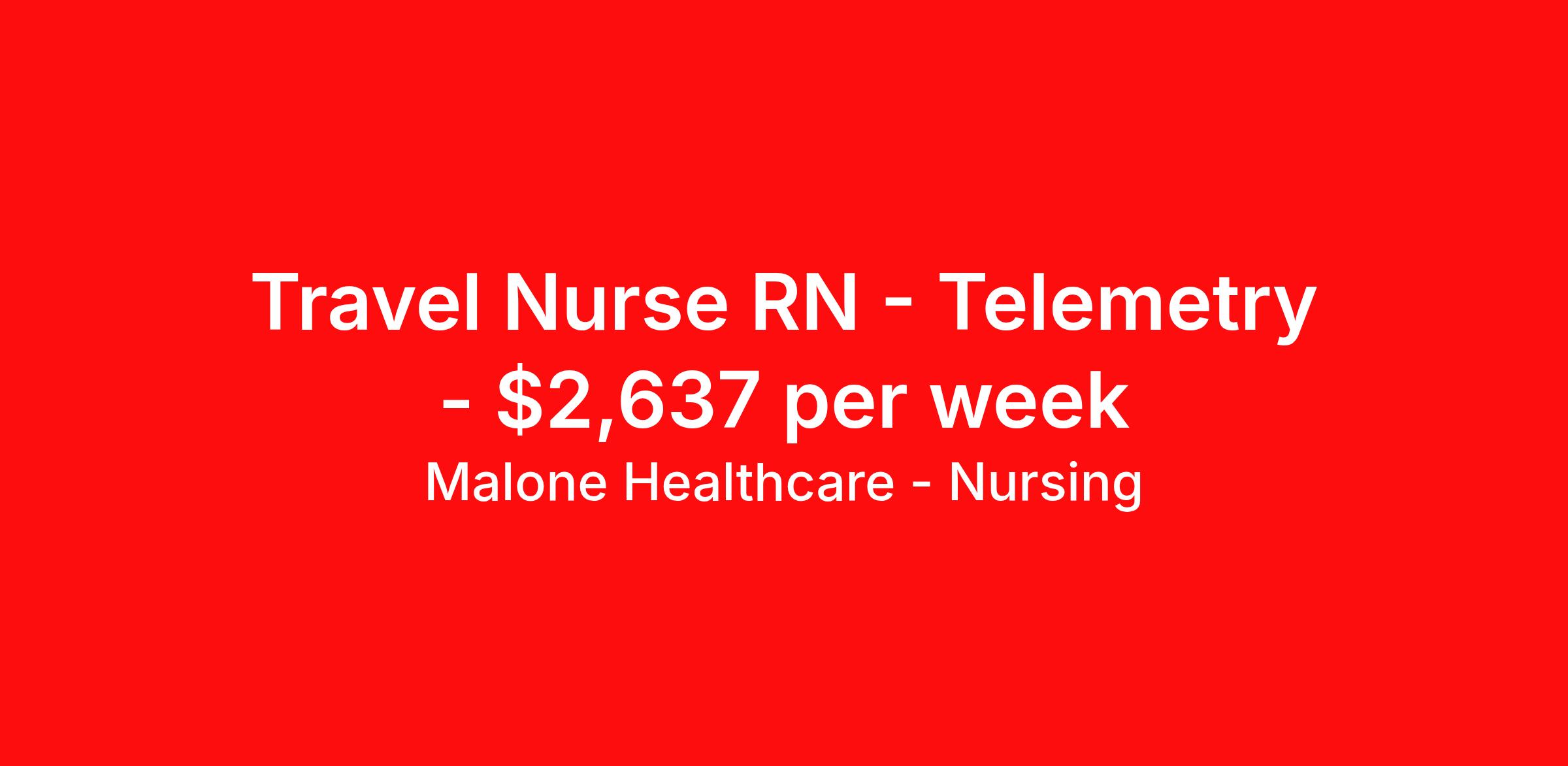 Malone Healthcare - Nursing is seeking a travel nurse RN Telemetry for a travel nursing job in Berlin, Vermont. Job Description & Requirements Specialty: Telemetry Discipline: RN Start Date: 03/31/2026 Duration: 13 weeks 36 hours per week Shift: 12 hours, nights, flexible Employment Type: Travel About Malone Healthcare - Nursing With a commitment to providing a higher standard of service and experience in patient care, Malone Healthcare places expert nurses and allied health professionals in rewarding careers throughout the United States. As a leading healthcare staffing agency, Malone’s focus on compliance and integrity translates to a seamless experience for our team members and partner facilities. When you work with Malone Healthcare, you can rely on over 50 years of proven experience placing exceptional professionals in quality healthcare settings. Benefits Weekly pay Holiday Pay Guaranteed Hours Continuing Education 401k retirement plan Pet insurance Referral bonus Medical benefits Dental benefits Vision benefits License and certification reimbursement Life insurance