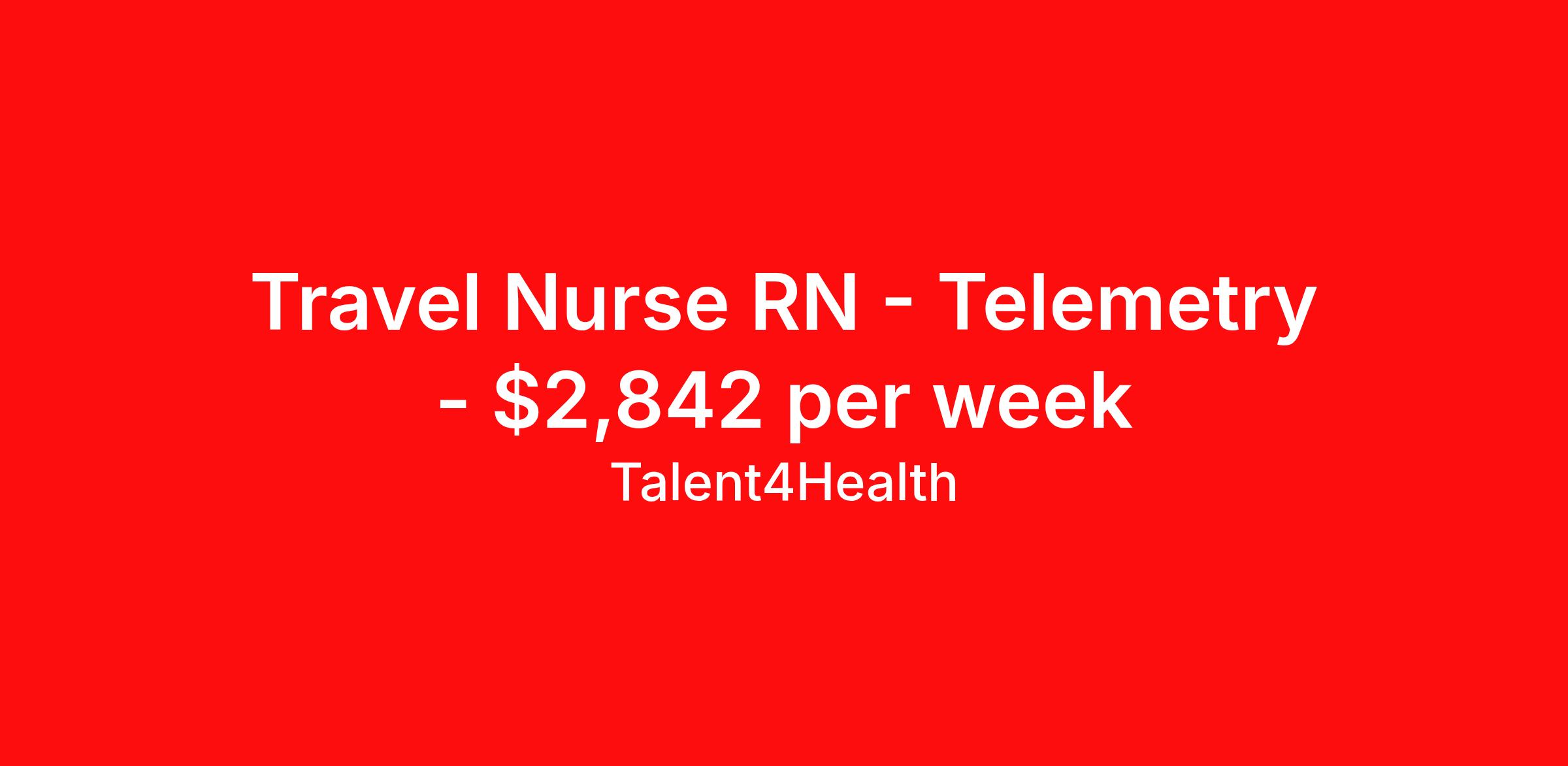 Talent4Health is seeking a travel nurse RN Telemetry for a travel nursing job in Glendale, California. Job Description & Requirements Specialty: Telemetry Discipline: RN Start Date: 04/06/2026 Duration: 13 weeks 48 hours per week Shift: 12 hours, nights Employment Type: Travel Auto Offer Night Shift 36-48 hours/week Referral Bonus: $250-$500 (each referral) Medical and other Benefits Apply Now About Talent4Health A leader and innovator, offering comprehensive talent solutions for the healthcare industry across the nation. Talent4Health, based in Wilmington, DE is a one stop solution that offers access to an inclusive network of excellent healthcare professionals through its state-of-the-art recruitment strategies and extensive career opportunities. We have successfully placed over 3000 plus clinicians with the topmost healthcare facilities across 50 states in the US. With countless prestigious clients under our umbrella, backed up by passionate and hard-working recruiters, we are a team you have been looking for! Why Choose us? When it comes to choosing a recruitment agency, it’s imperative to consider what all they have to offer. Proficiency : Our seasoned team of professionals has years of experience and we are dedicated to provide the highest quality service to our clients and candidates. Personalized service : We understand that every candidate is unique, and we work closely with each one to develop a customized plan that meets their specific needs. Consistency : We are devoted to offer dependable recruitment solutions for our candidates, and we are always a phone call away for all their questions or concerns. Comprehensive care : Our healthcare recruitment team works for different specialties, so there is a job for everyone. If this is all that excites you, do visit http://www.talent4health.com today!