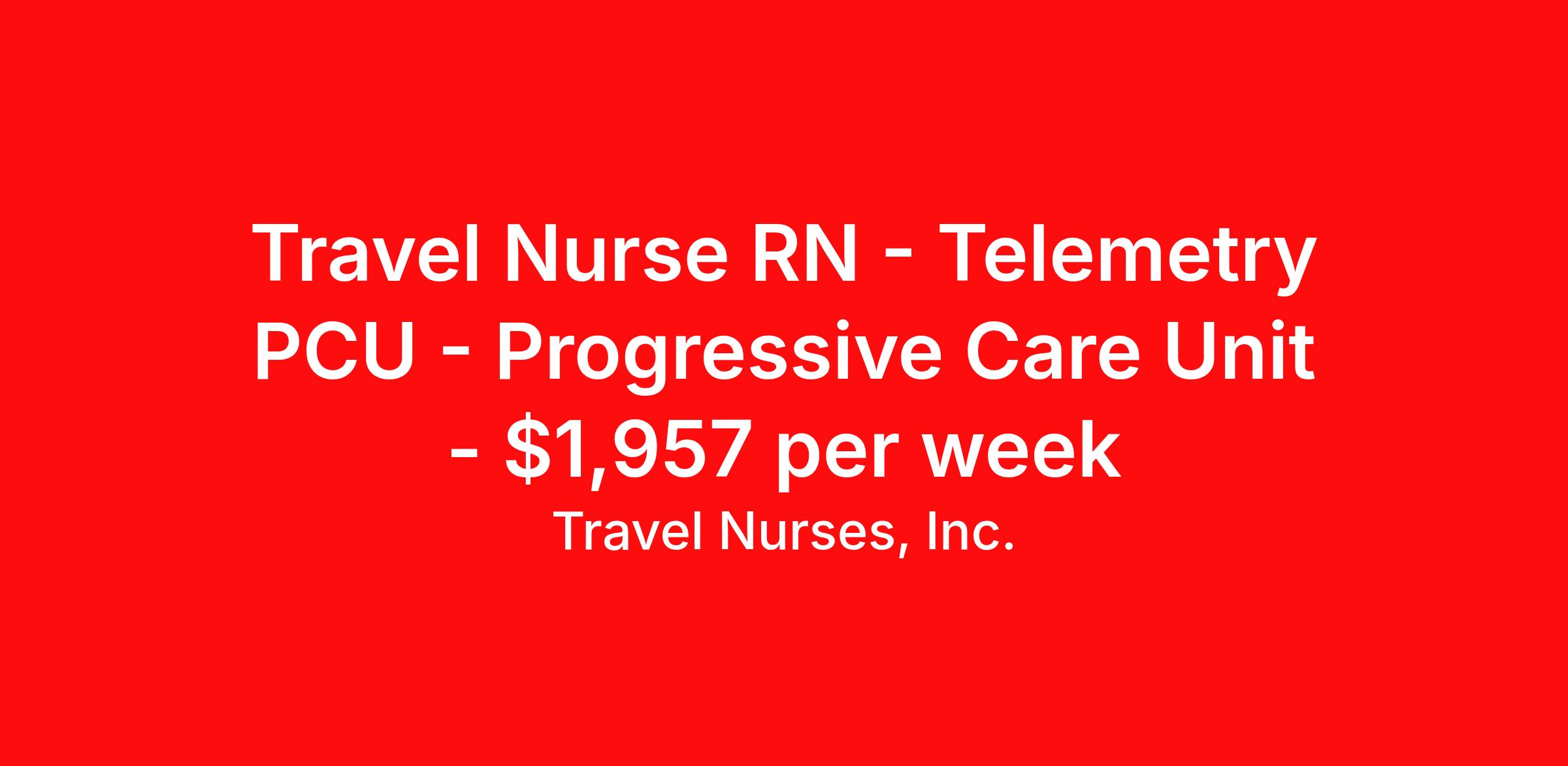 Travel Nurses, Inc. is seeking a travel nurse RN Telemetry PCU - Progressive Care Unit for a travel nursing job in Glendive, Montana. Job Description & Requirements Specialty: Telemetry PCU - Progressive Care Unit Discipline: RN Start Date: 04/13/2026 Duration: 13 weeks 36 hours per week Shift: 12 hours Employment Type: Travel Travel Nurses, Inc. Job ID 308265. Pay package is based on 12 hour shifts and 36 hours per week (subject to confirmation) with tax-free stipend amount to be determined. Posted job title: TCU Registered Nurse About Travel Nurses, Inc. Travel Nurses, Inc. is a leading healthcare staffing agency that provides healthcare professionals with opportunities to work across the country. Founded by nurses in 1988, TNI has more than 30 years of experience in the industry. The agency initially focused on staffing operating room settings in the MidSouth. However, this quickly evolved to encompass all nursing specialties and allied health fields nationwide. At the heart of our mission is a profound respect for nurses, whom we consider the cornerstone of healthcare. This acknowledgment extends beyond the nursing profession alone. Travel Nurses, Inc. now proudly embraces a wide array of healthcare professionals, recognizing their crucial roles in our collective mission. Travel Nurses, Inc. is dedicated to providing comprehensive support and opportunities that will help facilitate complete career mobility in the healthcare field. Our commitment to transparency ensures that all professionals, not just nurses, can confidently accept any assignment without financial uncertainties. We prioritize our professionals’ well-being with comprehensive benefits packages, including day-one healthcare coverage, competitive salaries, bonuses and incentives. This underscores our unwavering commitment to offering the best possible rewards and support for all the professionals we serve. Benefits Weekly pay Continuing Education 401k retirement plan Wellness and fitness programs Mileage reimbursement Referral bonus Employee assistance programs Medical benefits Dental benefits Vision benefits Benefits start day 1 License and certification reimbursement Life insurance Retention bonus
