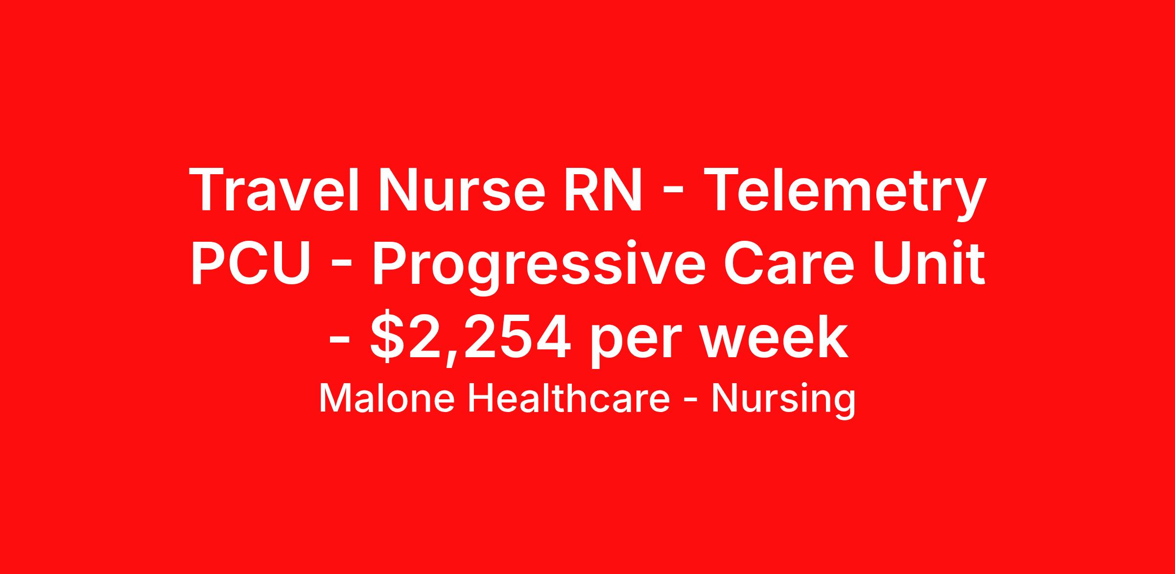 Malone Healthcare - Nursing is seeking a travel nurse RN Telemetry PCU - Progressive Care Unit for a travel nursing job in Bridgeport, West Virginia. Job Description & Requirements Specialty: Telemetry PCU - Progressive Care Unit Discipline: RN Start Date: 04/13/2026 Duration: 12 weeks 36 hours per week Shift: 12 hours, days Employment Type: Travel Cardiac patients, CR bands, post cath, AMI, Post-OP lung surgeries after out of CCU, respiratory failure, chest tubes, pacemakers, post PCI, will not pull sheaths, no art lines. About Malone Healthcare - Nursing With a commitment to providing a higher standard of service and experience in patient care, Malone Healthcare places expert nurses and allied health professionals in rewarding careers throughout the United States. As a leading healthcare staffing agency, Malone’s focus on compliance and integrity translates to a seamless experience for our team members and partner facilities. When you work with Malone Healthcare, you can rely on over 50 years of proven experience placing exceptional professionals in quality healthcare settings. Benefits Weekly pay Holiday Pay Guaranteed Hours Continuing Education 401k retirement plan Pet insurance Referral bonus Medical benefits Dental benefits Vision benefits License and certification reimbursement Life insurance