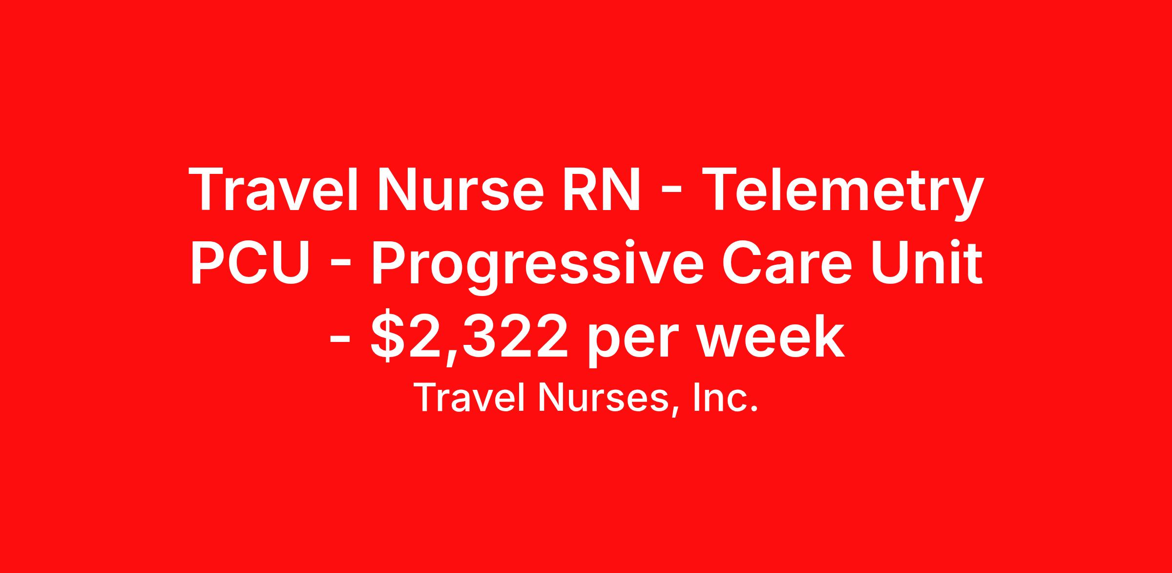 Travel Nurses, Inc. is seeking a travel nurse RN Telemetry PCU - Progressive Care Unit for a travel nursing job in Rock Island, Illinois. Job Description & Requirements Specialty: Telemetry PCU - Progressive Care Unit Discipline: RN Start Date: 05/18/2026 Duration: 13 weeks 36 hours per week Shift: 12 hours Employment Type: Travel Travel Nurses, Inc. Job ID 316883. Pay package is based on 12 hour shifts and 36 hours per week (subject to confirmation) with tax-free stipend amount to be determined. Posted job title: Temp - Registered Nurse (RN) - Med Surg/Telemetry / Progressive Care Unit (PCU) / Stepdown (Day About Travel Nurses, Inc. Travel Nurses, Inc. is a nurse-founded and operated healthcare staffing agency connecting nurses and allied health professionals with opportunities nationwide. Since 1988, we’ve grown from supporting operating room teams in the Mid-South to serving a wide range of specialties across the country. At our core, we believe healthcare professionals are the foundation of care. That belief drives everything we do, from how we support our clinicians to how we build long-term relationships. We are committed to making travel simple, transparent and rewarding. With clear pay packages, dedicated recruiter support and a focus on career mobility, our clinicians can move forward with confidence. Wherever your career takes you, you’ll never go alone. Benefits Weekly pay 401k retirement plan Life insurance