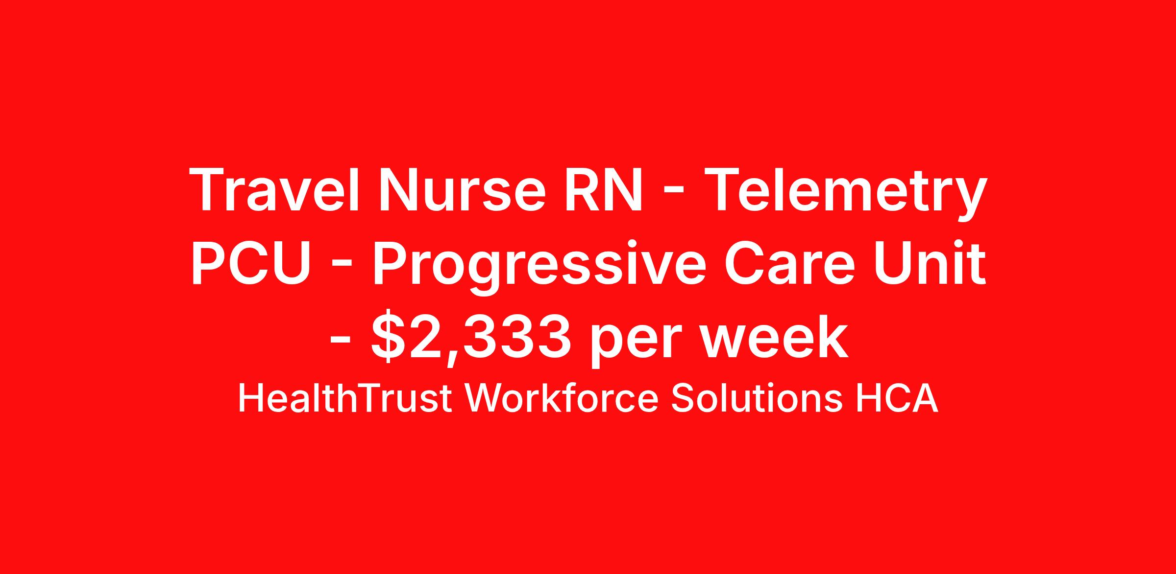 HealthTrust Workforce Solutions HCA is seeking a travel nurse RN Telemetry PCU - Progressive Care Unit for a travel nursing job in Kansas City, Missouri. Job Description & Requirements Specialty: Telemetry PCU - Progressive Care Unit Discipline: RN Start Date: 04/13/2026 Duration: 13 weeks 36 hours per week Shift: 12 hours, days, nights Employment Type: Travel Dental benefits Vision benefits Referral bonus Continuing Education Life insurance About HealthTrust Workforce Solutions HCA At HealthTrust Workforce Solutions, healthcare is not just about the four walls of a facility but about the people who provide and receive care. Our focus is on empowering healthcare professionals to deliver exceptional patient experiences by providing them with the necessary skills, tools, and support. We partner with healthcare facilities nationwide to ensure that the right professionals are in the right roles. We prioritize our clinicians by giving them a voice and access to opportunities to fulfill their mission of improving lives by providing quality patient care. We are committed to our core values of Trust, Innovation, Adaptability, Courage, and Accountability. We are dedicated to positively impacting the healthcare industry by providing first-priority access to more than 200,000 jobs nationwide to our healthcare professionals. Join us and be part of the HealthTrust family, where you can make a difference every day. We embrace our changing environment, and we maintain a culture that has a rich tradition of transforming itself to meet the challenges of the future. MISSION STATEMENT While putting great people in the right roles is essential, our mission is far greater. We want our clinicians to be part of the HealthTrust family, where healthcare professionals have a voice and are empowered with the right tools and opportunities to fulfill their personal mission of improving lives. Plus, as a preferred partner to thousands of top-performing hospitals, we provide our healthcare professionals with first-priority access to more than 200,000 jobs nationwide. Benefits Dental benefits Vision benefits Referral bonus Continuing Education Life insurance
