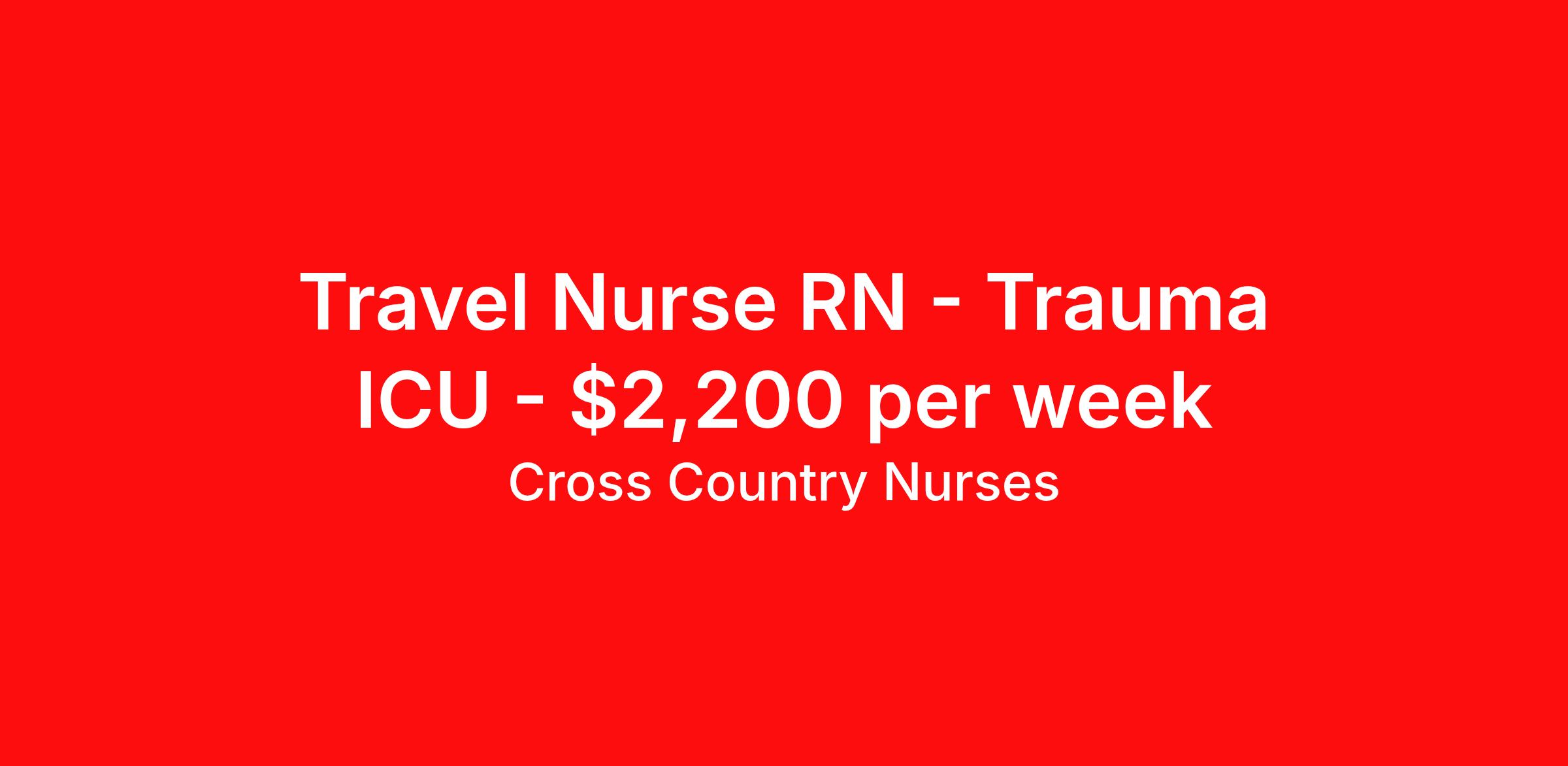 Cross Country Nurses is seeking a travel nurse RN Trauma ICU for a travel nursing job in Boston, Massachusetts. Job Description & Requirements Specialty: Trauma ICU Discipline: RN Start Date: 04/05/2026 Duration: 13 weeks 36 hours per week Shift: 12 hours Employment Type: Travel Job Description As a trauma intensive care unit nurse (RN ICU-t), you will be monitoring patients with highly unstable, life-threatening conditions, to ensure they receive the best possible care. You must be able to rapidly assess a patient's condition and intervene with the appropriate care, managing various life-support systems like ventilators and heart-monitors. Additionally, you will extend emotional support and education to traumatized patients and their families Minimum Requirements At least 1 year of recent acute care experience in specialty Active RN license Benefits The benefits of taking a travel nursing job with Cross Country include: Private housing or generous housing allowance Comprehensive health insurance with prescription coverage Dependent health insurance with prescription coverage Competitive salaries Referral bonuses Travel reimbursement 401(k) retirement plan Direct deposit/free checking Unlimited free CE credits Cross Country Job ID 1235553. Pay package is based on 12 hour shifts and 36 hours per week (subject to confirmation) with tax-free stipend amount to be determined. Posted job title: Registered Nurse / Intensive Care Unit Trauma About Cross Country Nurses You care for others — we’re here to care for you. At Cross Country, we know travel nursing is about more than just the job. It’s about building a career that supports your lifestyle, your values, and your impact. We offer competitive pay, full benefits, and 24/7 support from a team that truly understands what it means to be on the front lines. Wherever your journey takes you, we’re with you every step of the way. Let’s build your best life — one assignment at a time. Benefits 401k retirement plan Referral bonus