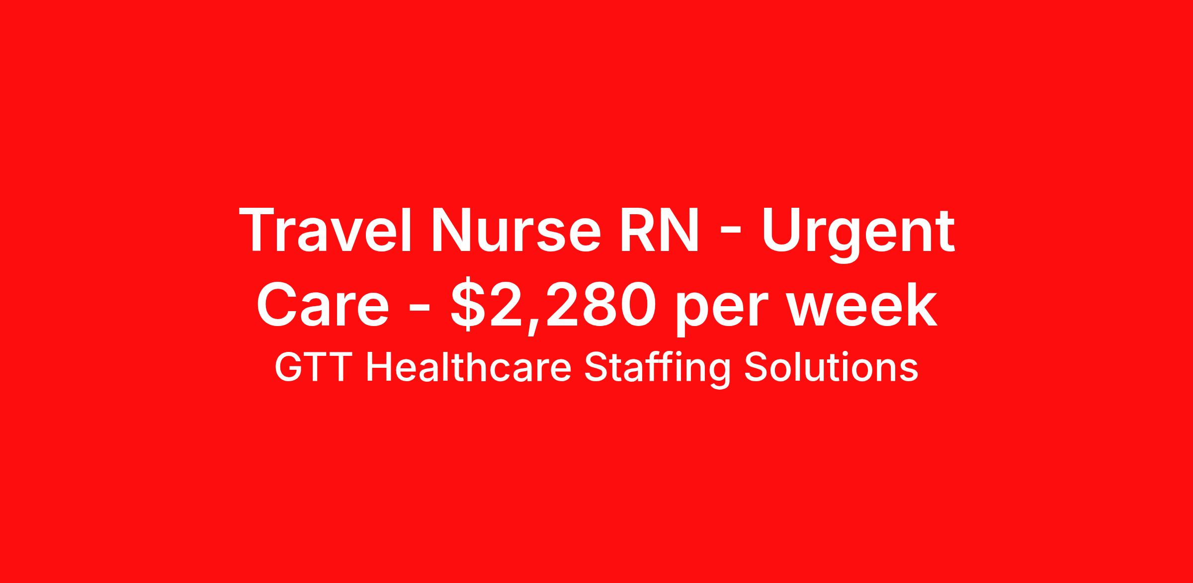 GTT Healthcare Staffing Solutions is seeking a travel nurse RN Urgent Care for a travel nursing job in Culver City, California. Job Description & Requirements Specialty: Urgent Care Discipline: RN Start Date: ASAP Duration: 13 weeks 40 hours per week Shift: 10 hours, days Employment Type: Travel Job Title: Registered Nurse – Urgent Care Shift Details Shift: Day (4x10 Hours) Timing Options: 11:30 AM – 10:00 PM 8:30 AM – 7:00 PM Schedule: Monday–Friday 11:30 AM – 10:00 PM Weekend Shift: Saturday–Sunday 8:30 AM – 7:00 PM Job Description We are seeking an experienced Registered Nurse – Urgent Care for a travel contract in Culver City, CA. The RN will provide high-quality patient care in a fast-paced urgent care environment, assisting physicians with treatment, patient assessment, and clinical procedures. Requirements Active California RN License BLS Certification (AHA or ARC) Minimum 2 years of outpatient experience At least 1 year of Urgent Care or ER experience About GTT Healthcare Staffing Solutions GTT Healthcare is a specialized healthcare staffing division of Global Technical Talent, supporting hospitals and healthcare systems across the United States. We connect travel and permanent nurses and allied health professionals with rewarding opportunities at leading medical facilities in more than 30 states. Our consultants are supported by dedicated healthcare recruiters who advocate for their goals, provide transparent communication, and guide them through every step of the assignment lifecycle. We prioritize flexibility, consistent pay, and access to comprehensive benefits so clinicians can focus on delivering exceptional patient care. Benefits Weekly pay Bereavement Medical benefits Dental benefits Vision benefits 401k retirement plan Referral bonus Sick pay Relocation bonus
